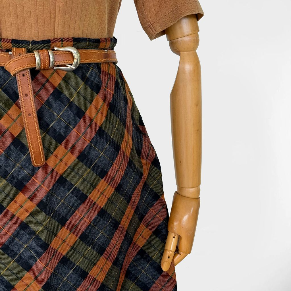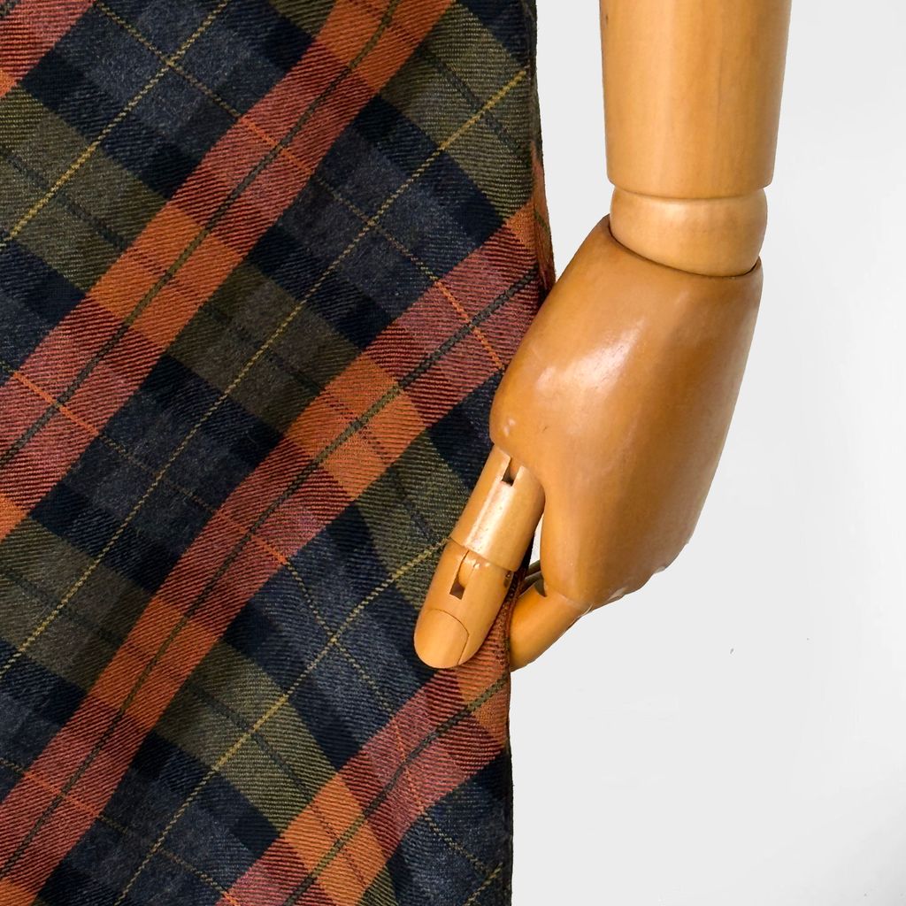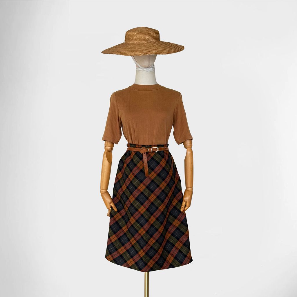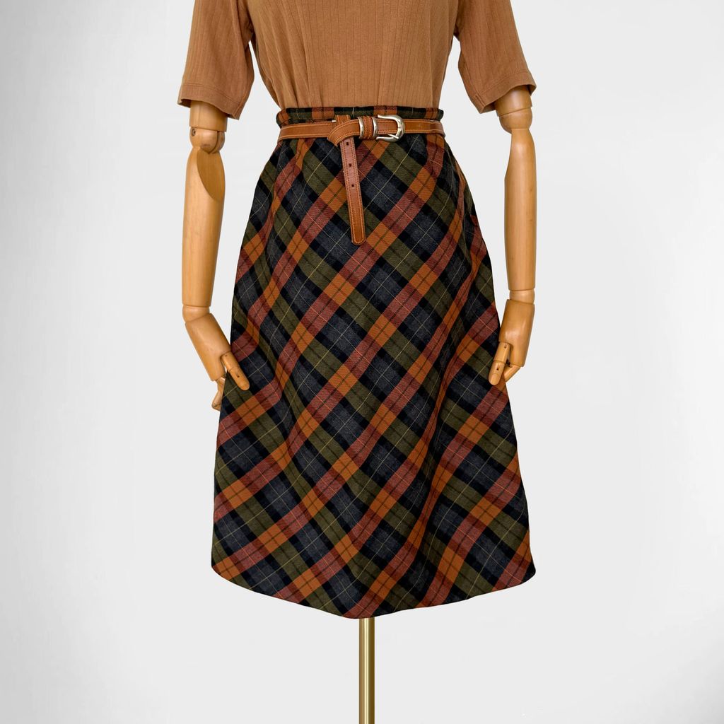 Circa 1980s. Dark brown skirt with dark olive green checkered print.