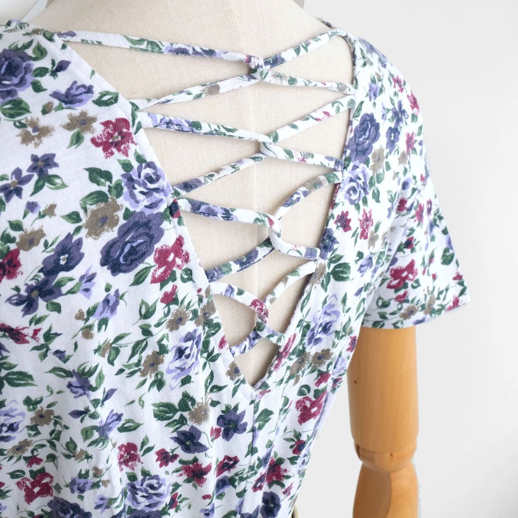 V shape neckline. Criss cross design at the back. Fitted waist. Front buttons closure. Cotton fabric.