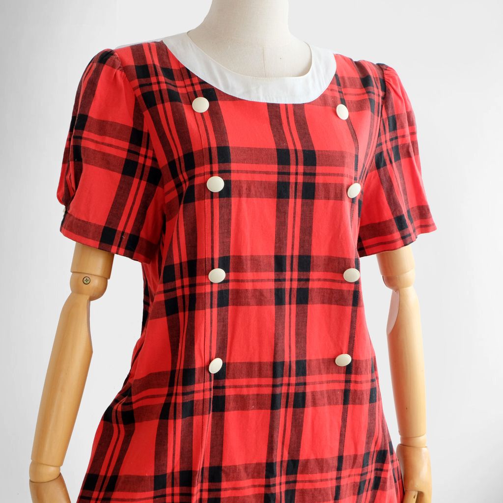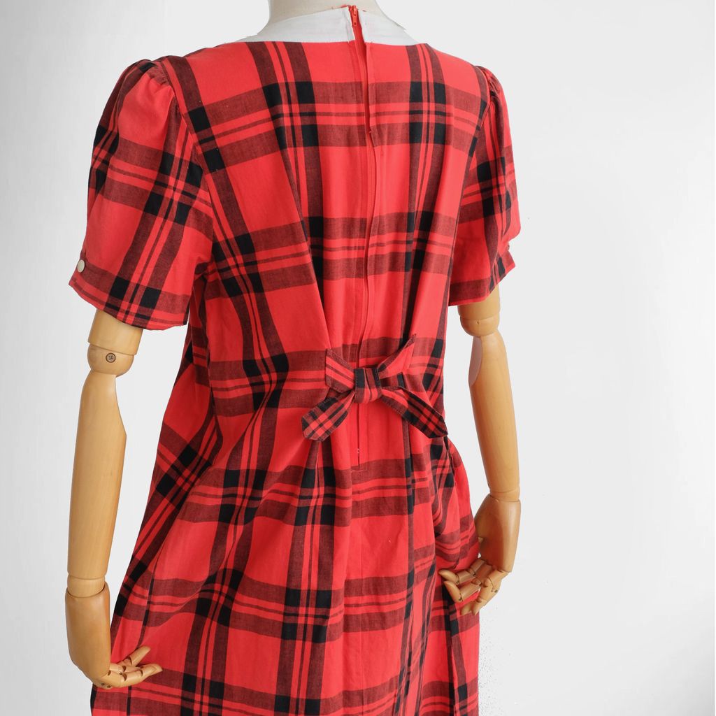 White trim collar neckline. Puffy sleeves. Front buttons design. Back zip closure. Unlined. Waist tie back. Pocket. Cotton fabric.