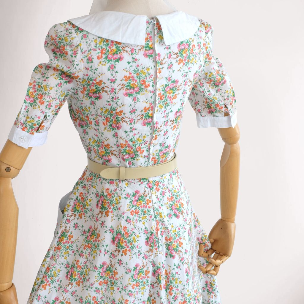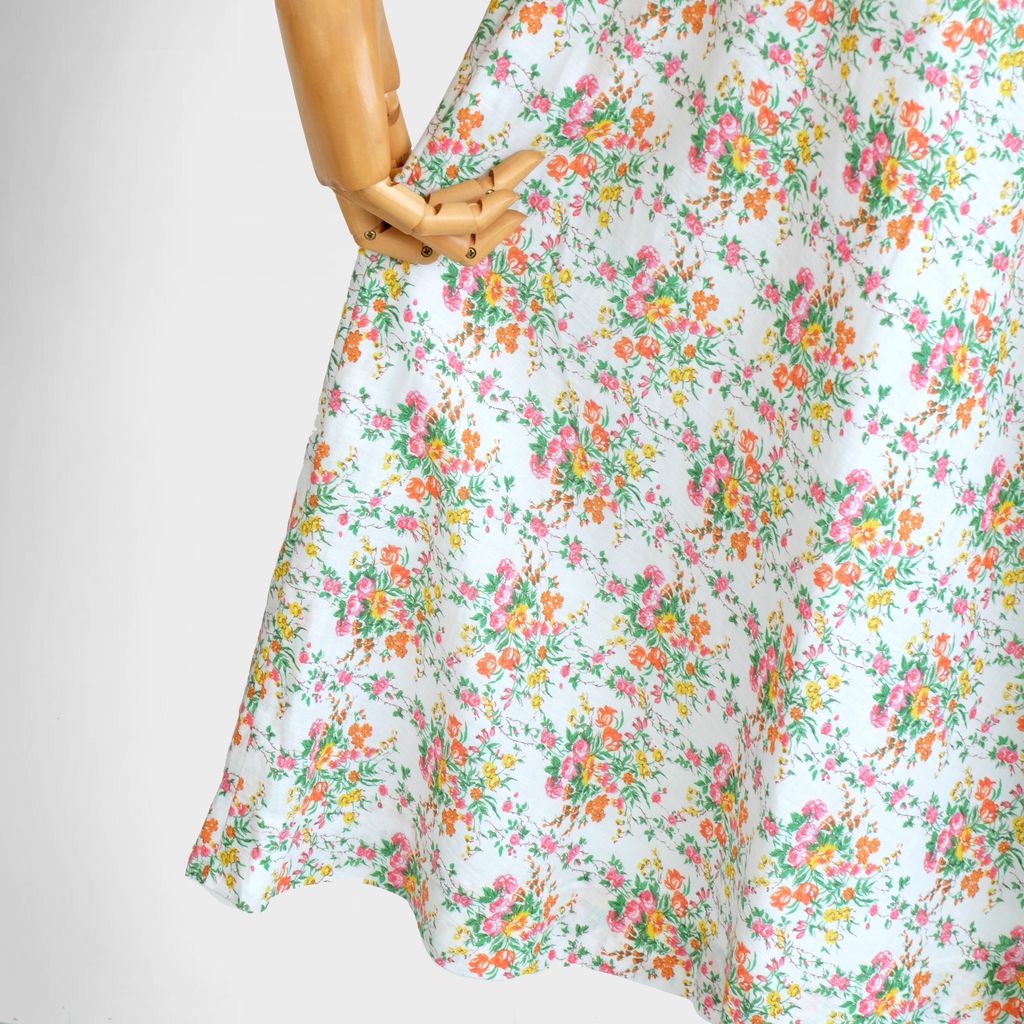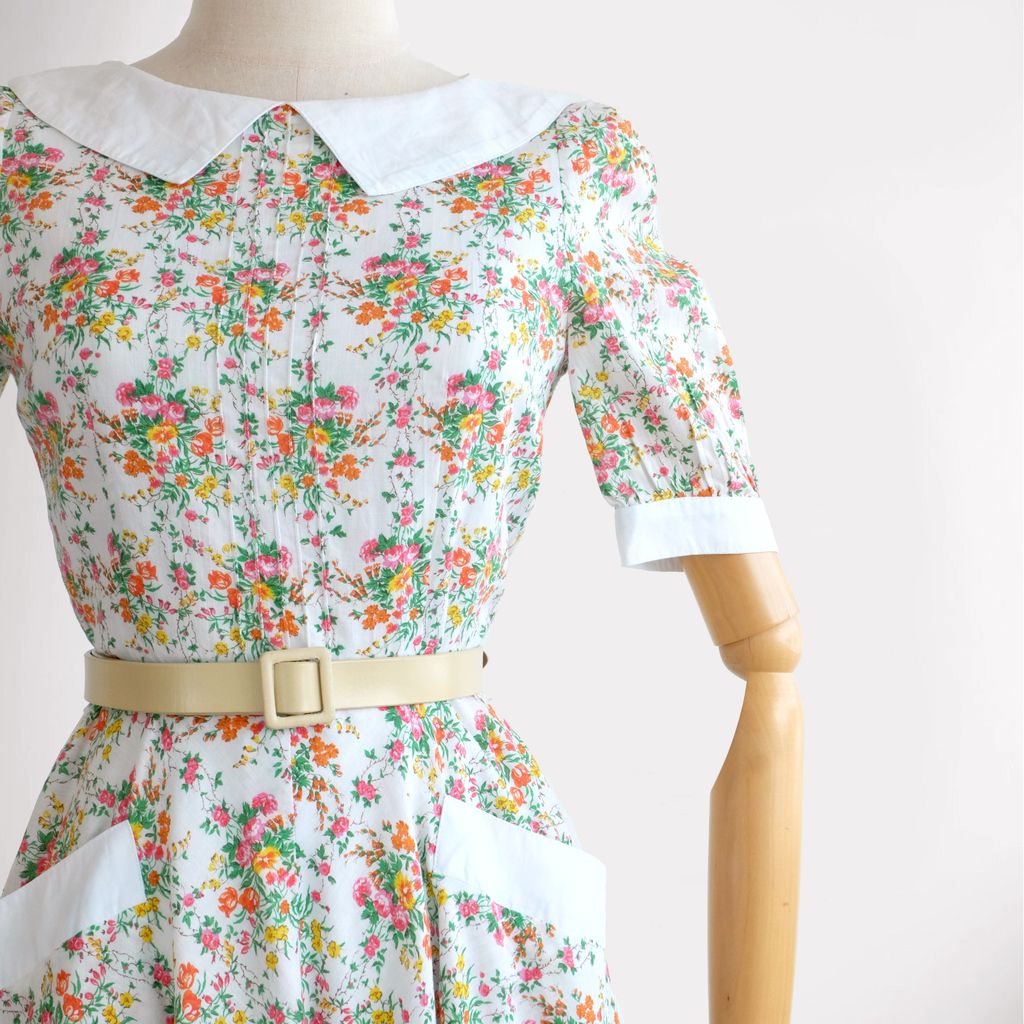 Peter pan collar design. Back zip closure. Lined. Fixed waist. Pockets.Cotton fabric.