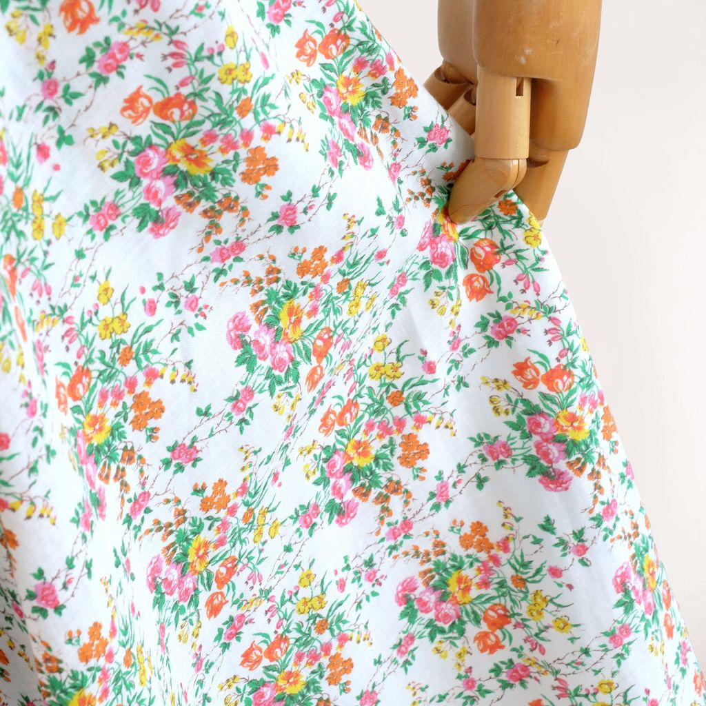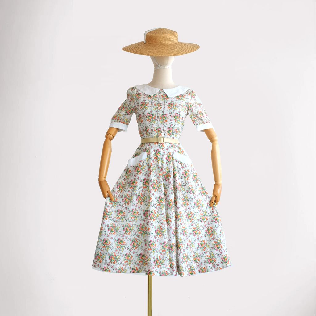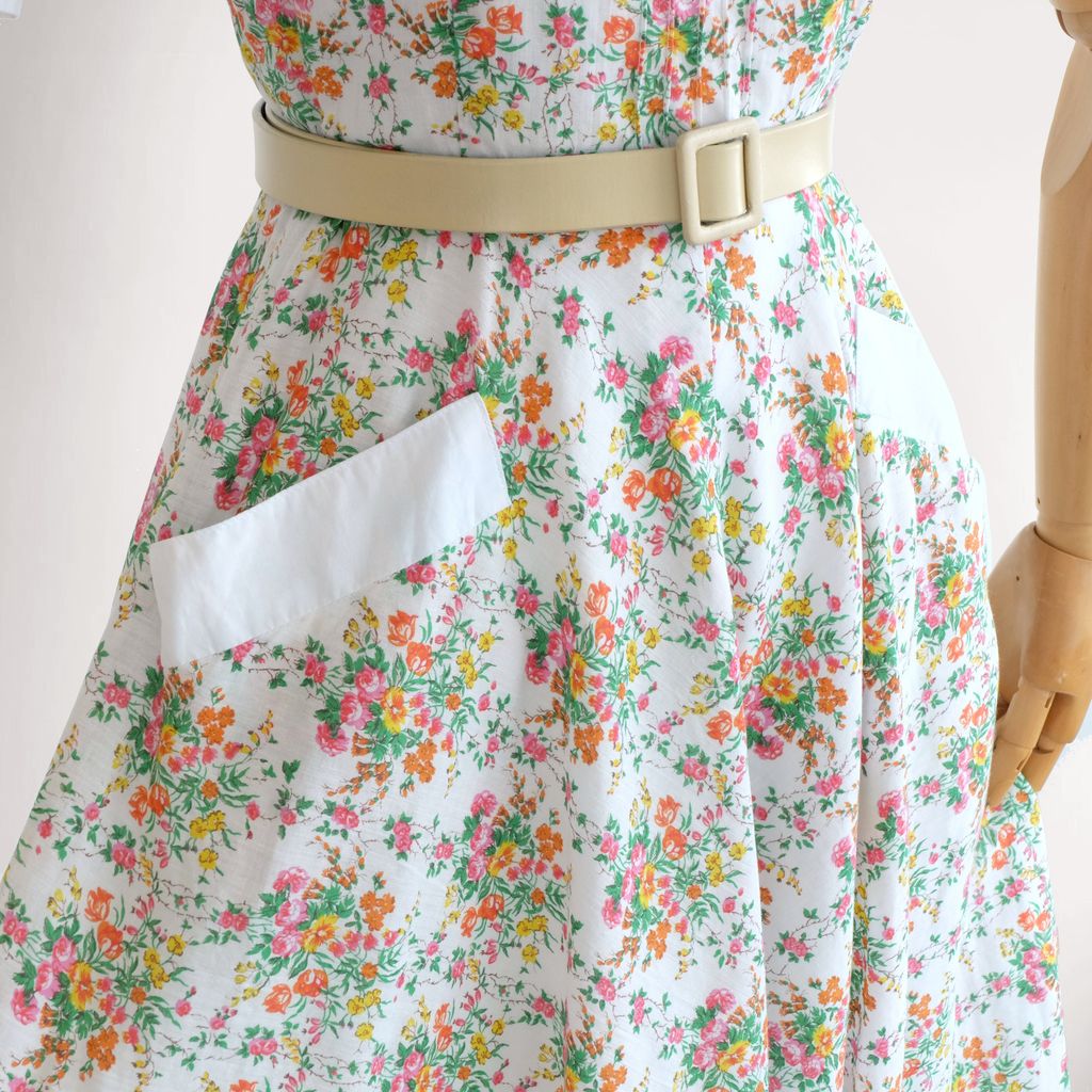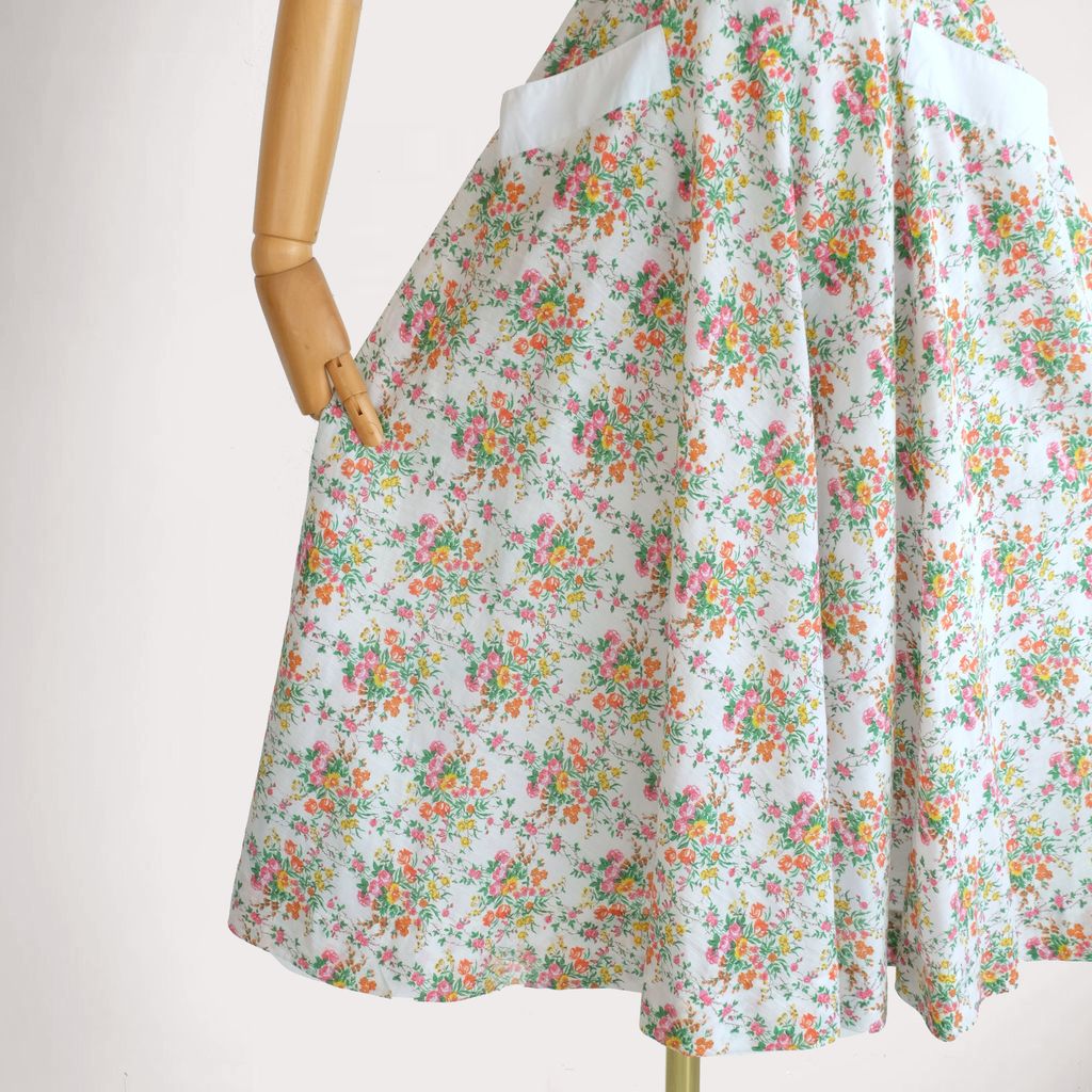 Peter pan collar design. Back zip closure. Lined. Fixed waist. Pockets.Cotton fabric.