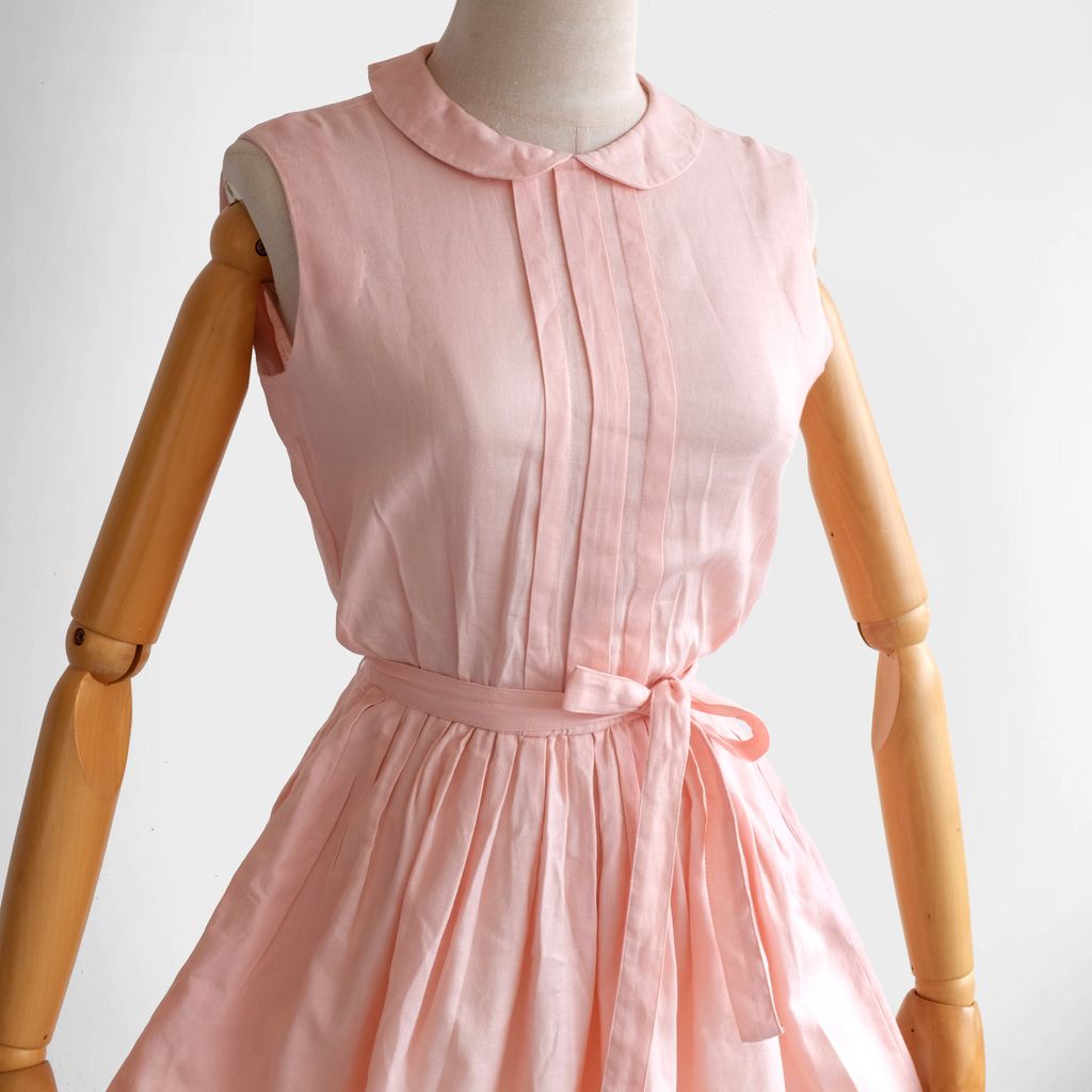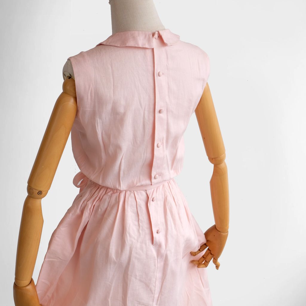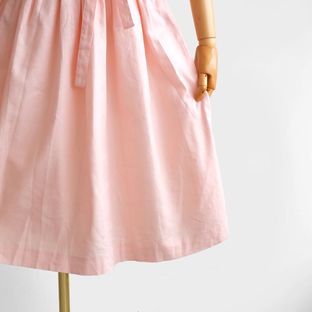 Back buttons closure. Peter pan collar design. Pleated waist. Bottom Lined. Elastic waist with matching belt. Pockets. Puffy skirt. Cotton fabric.