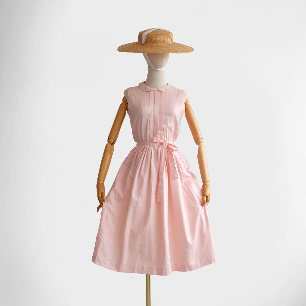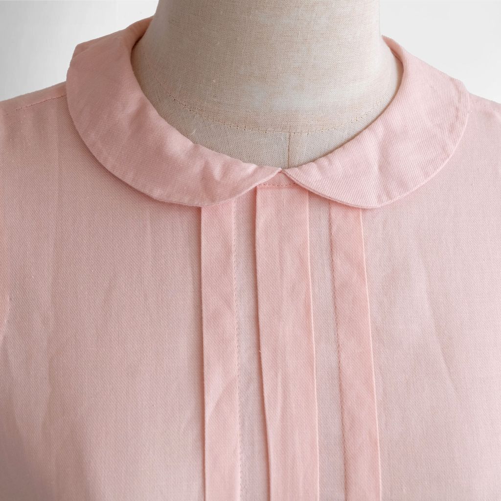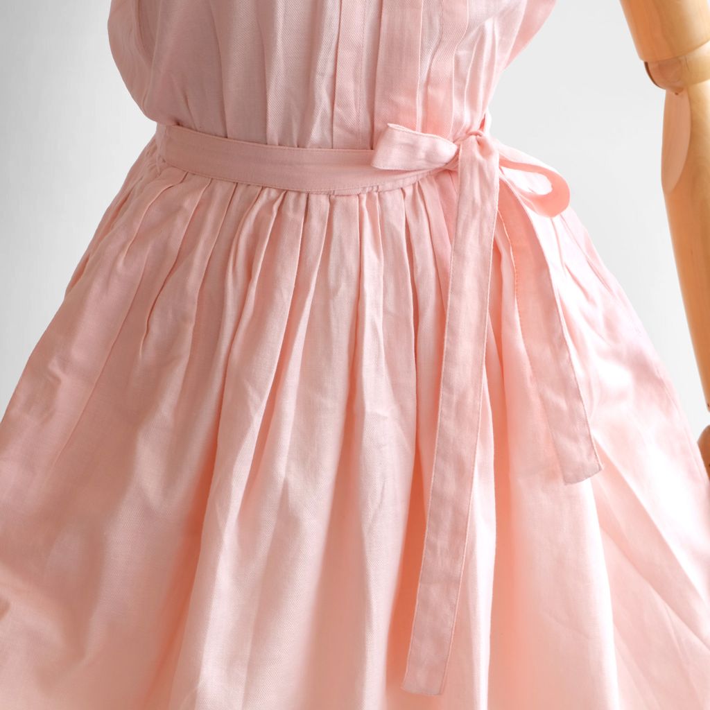 Back buttons closure. Peter pan collar design. Pleated waist. Bottom Lined. Elastic waist with matching belt. Pockets. Puffy skirt. Cotton fabric.