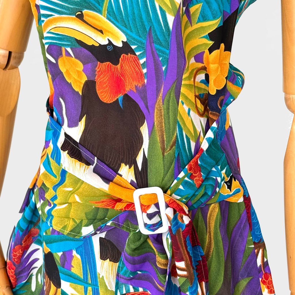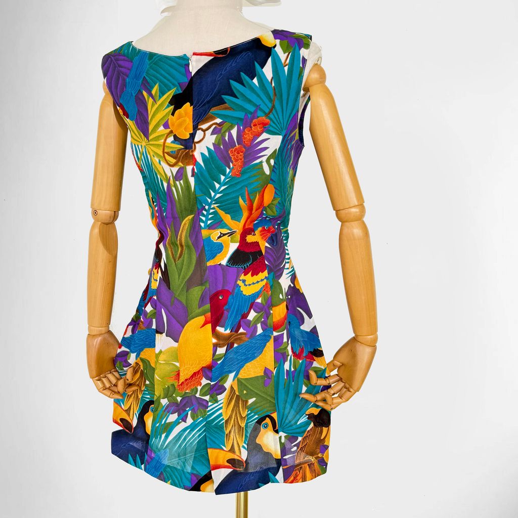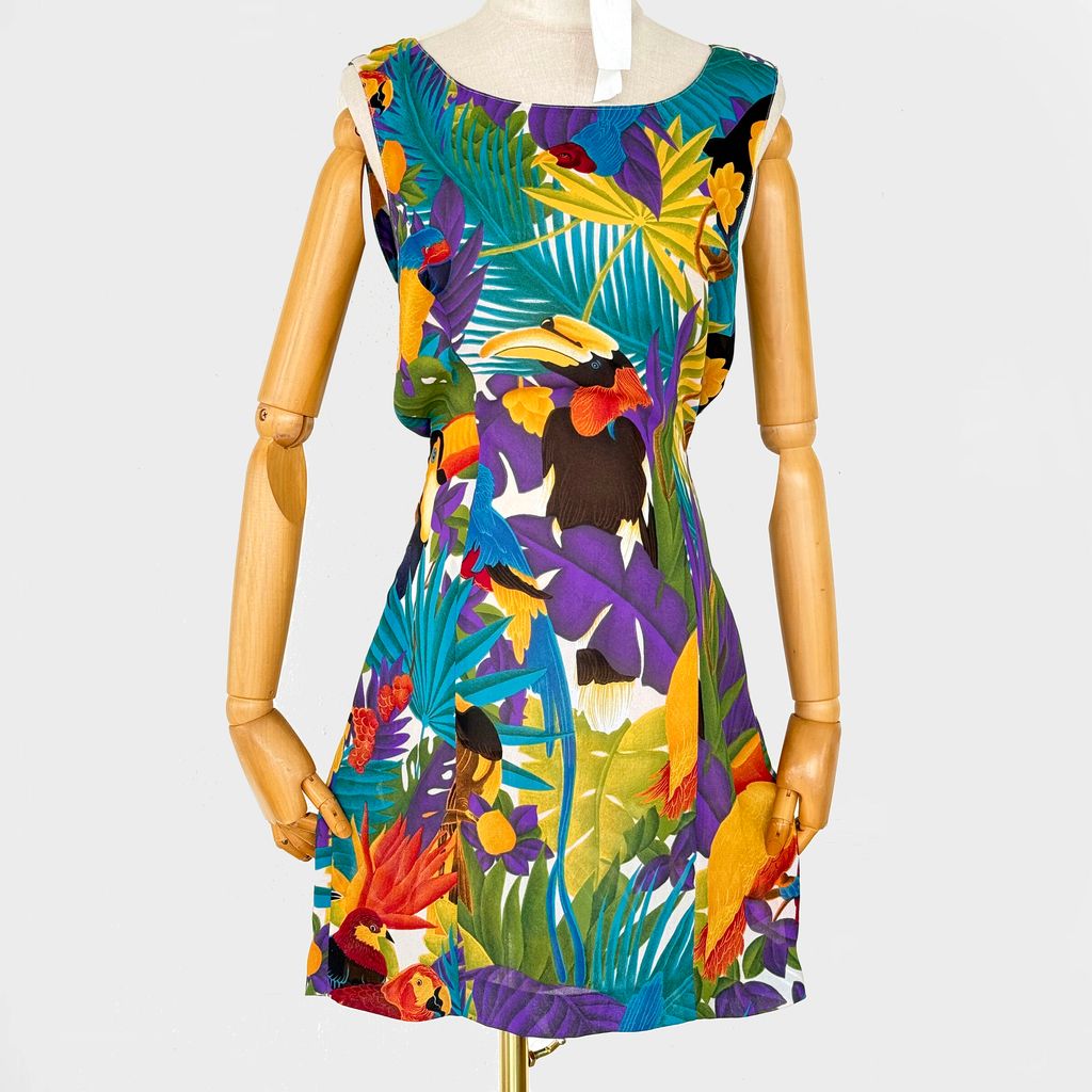 Circa 1980s. Bright colours dress with tropical bird prints.