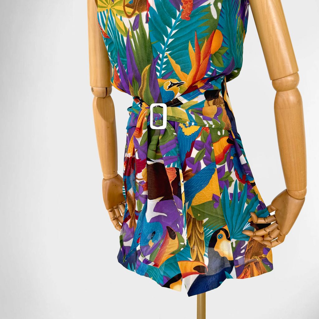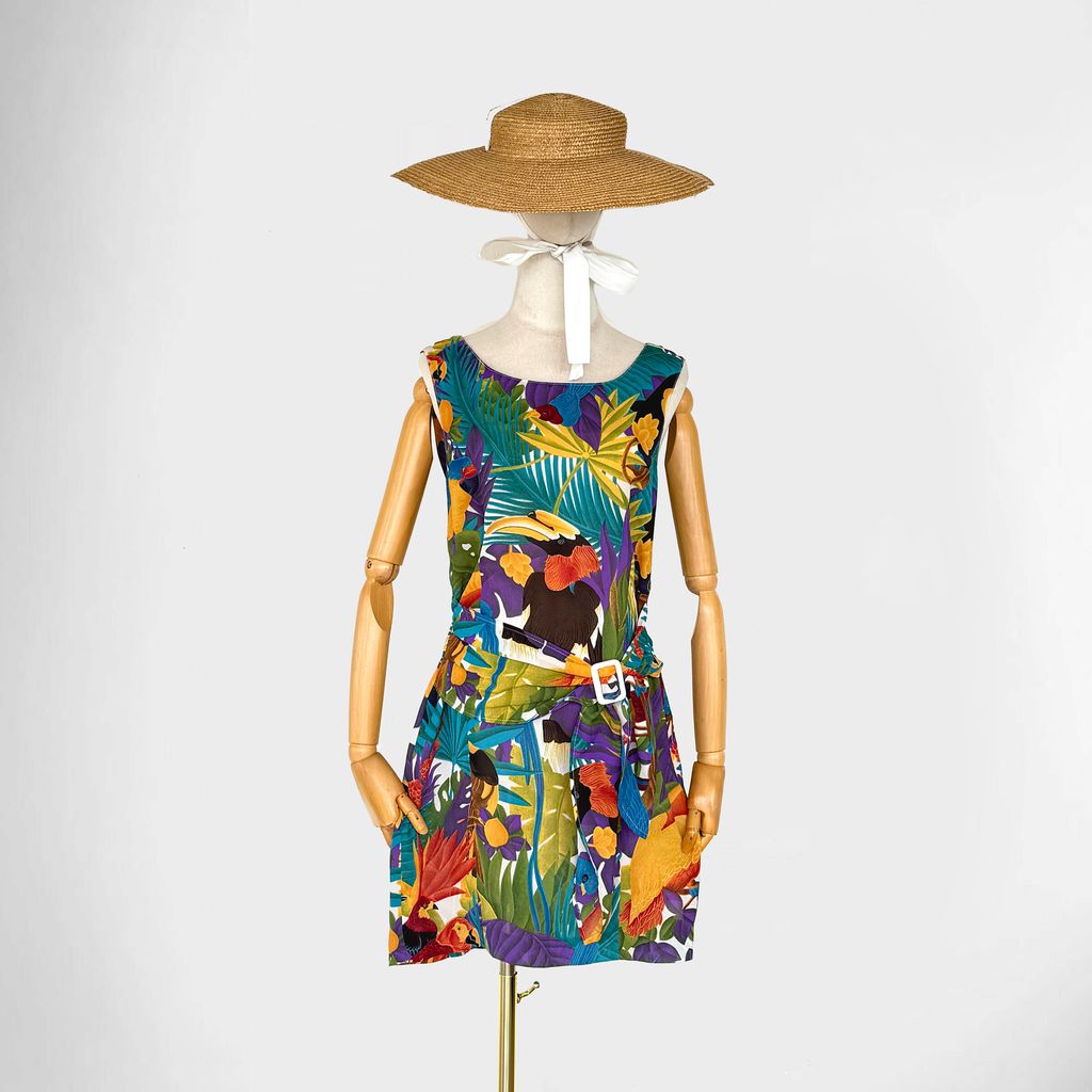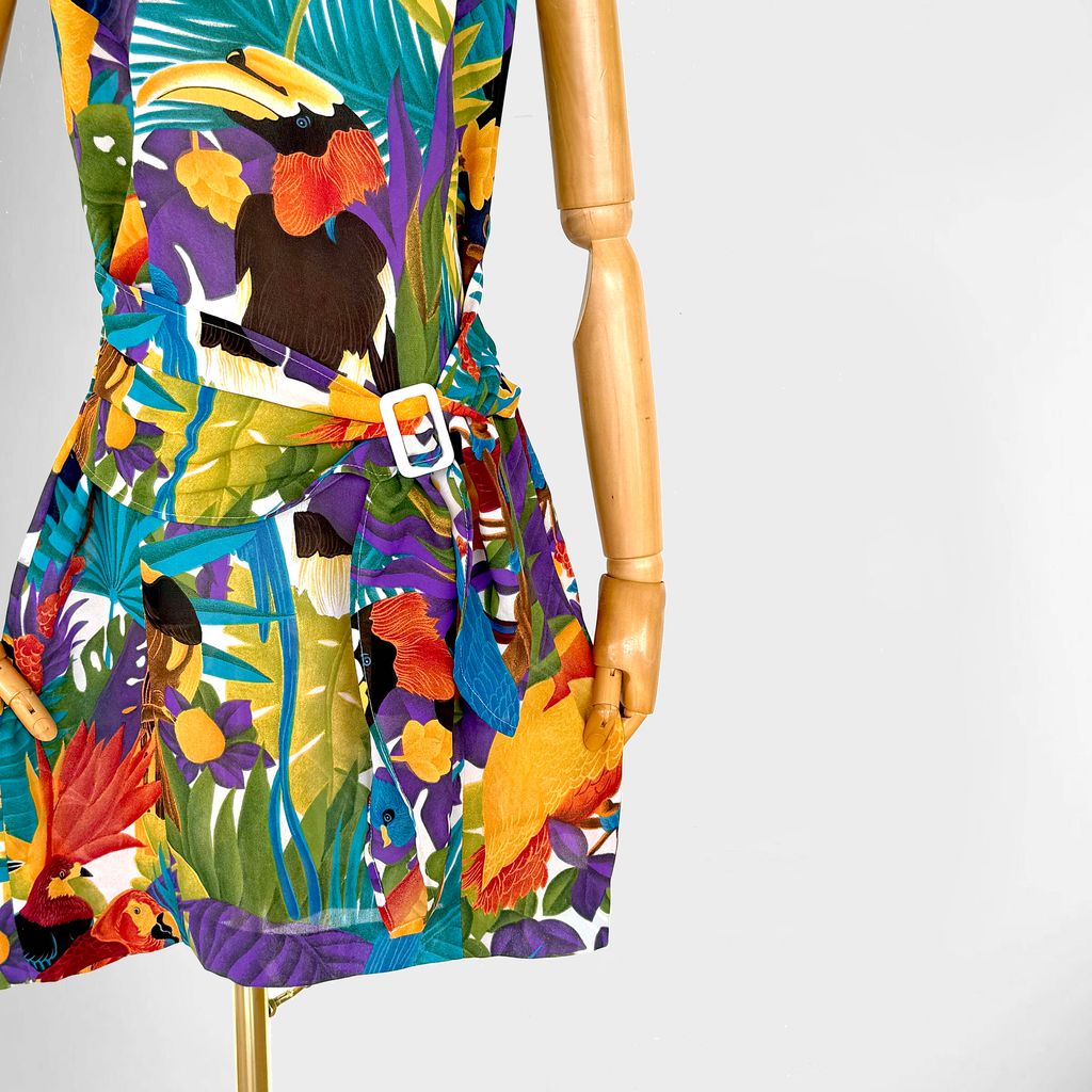 Circa 1980s. Bright colours dress with tropical bird prints.