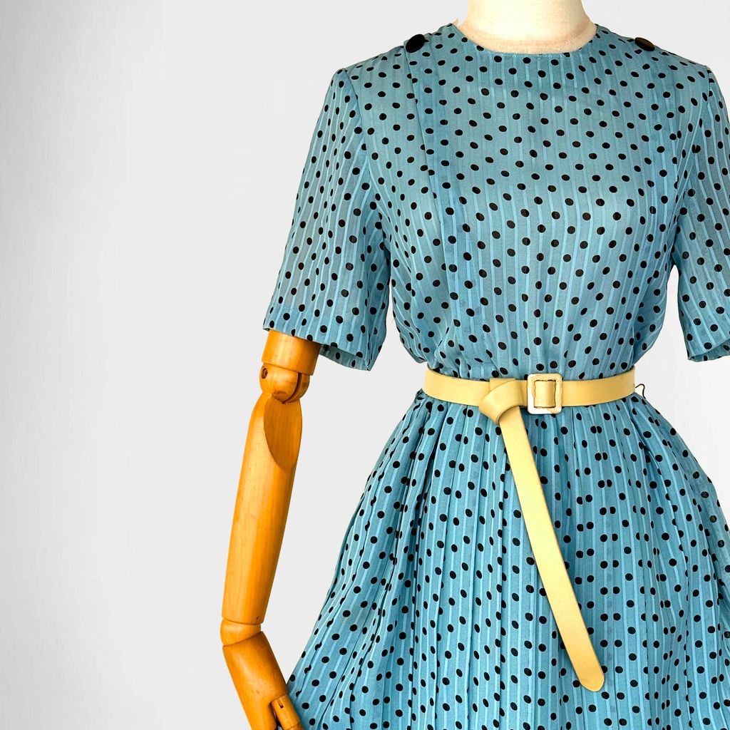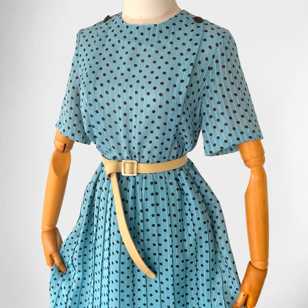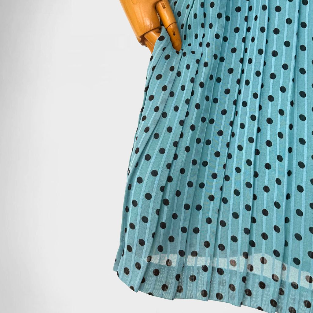 Circa 1980s. Light blue turqoiuse dress with polka dots print.