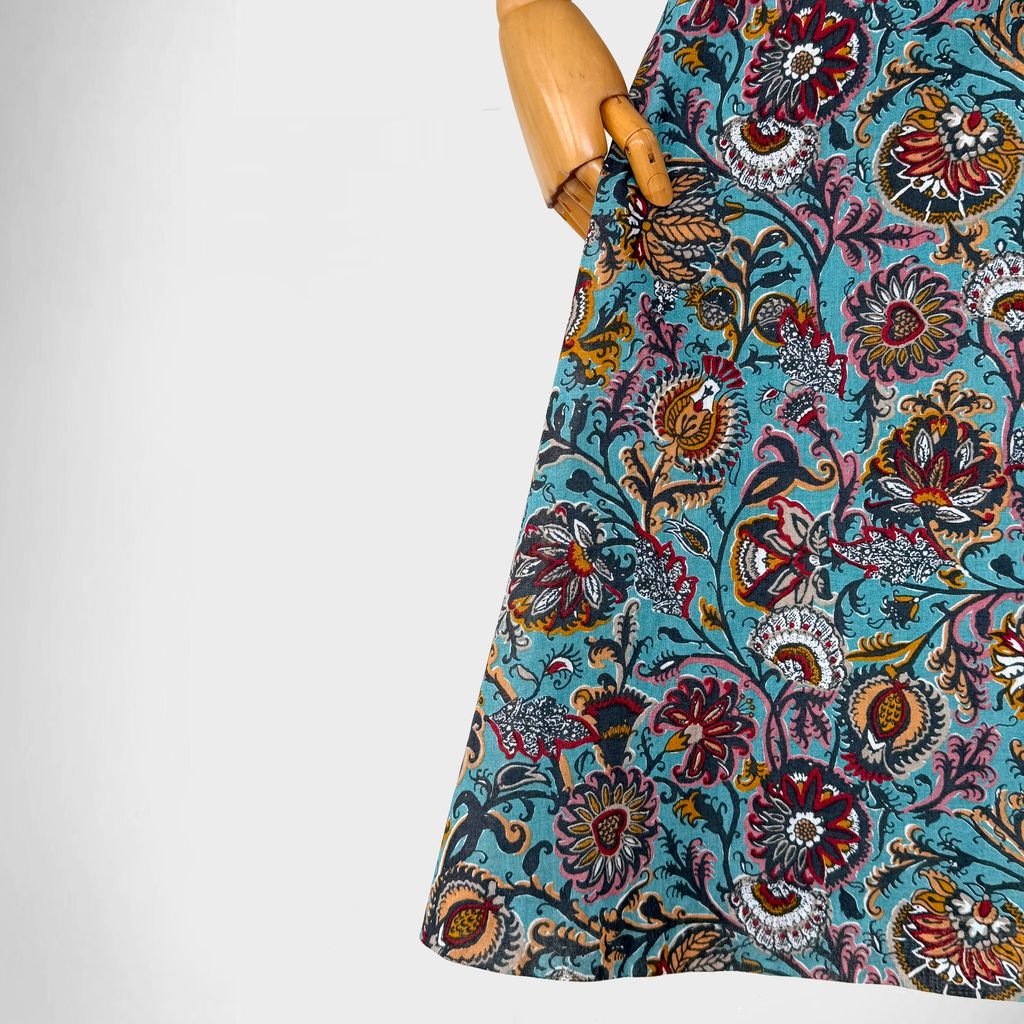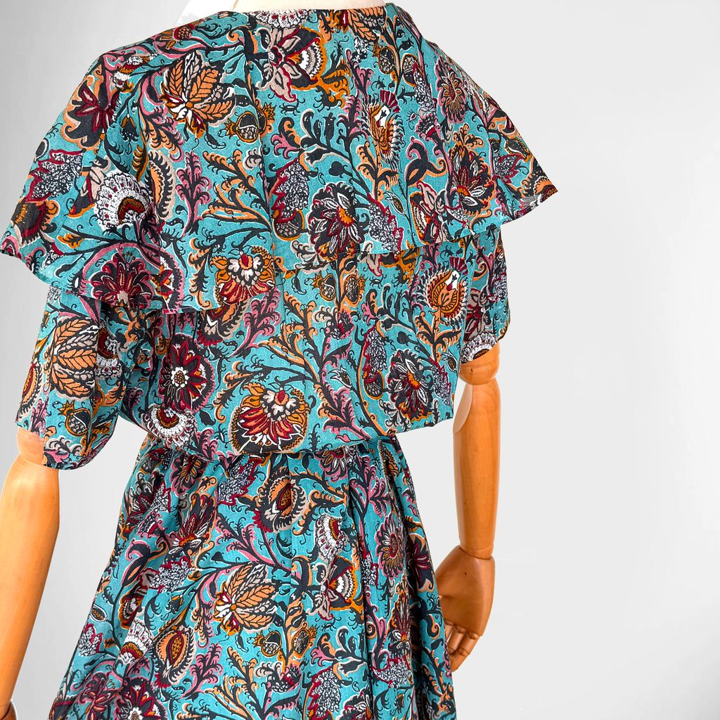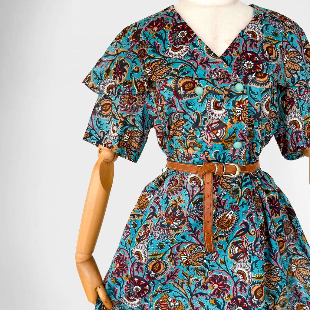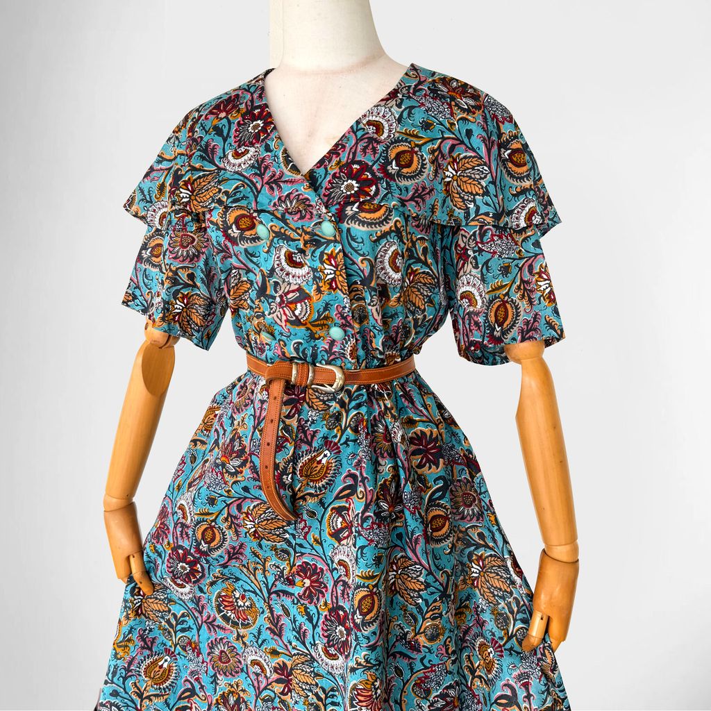 Circa 1980s. Elegant turquioise blue dress with batik floral print.