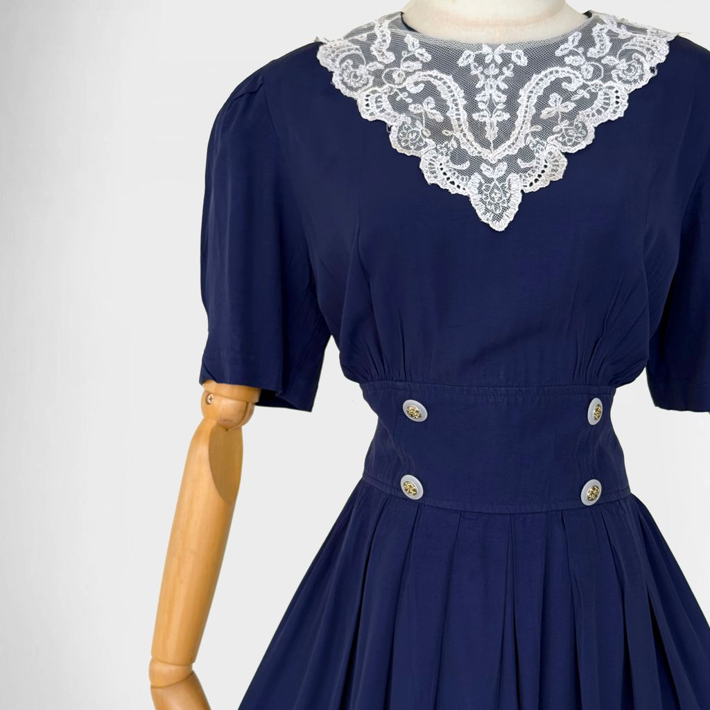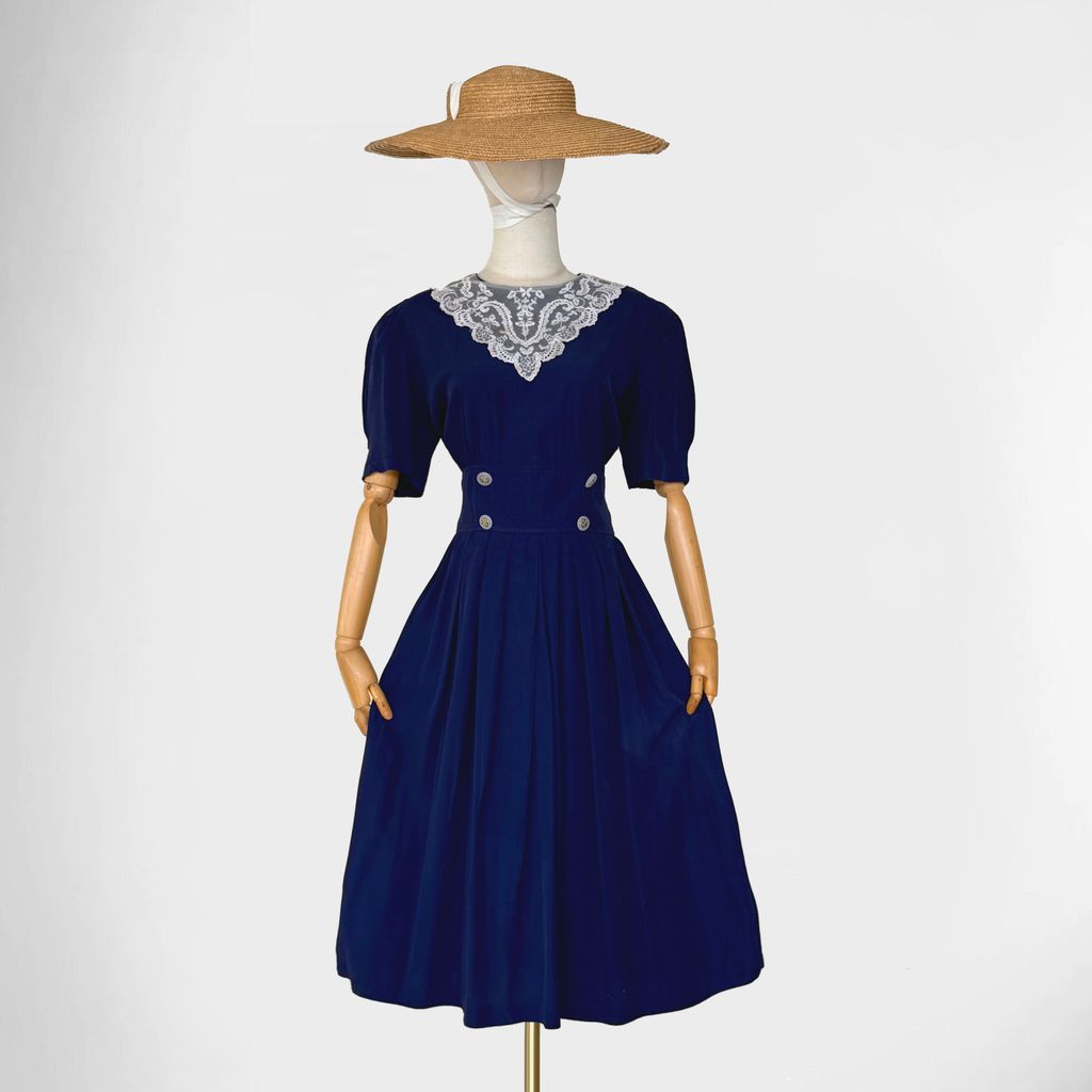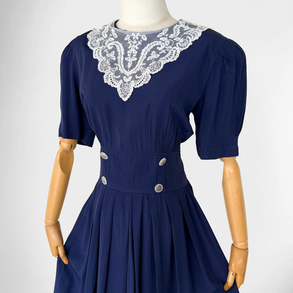 Circa 1980s. Dark blue dress with lace embroidery neckline.