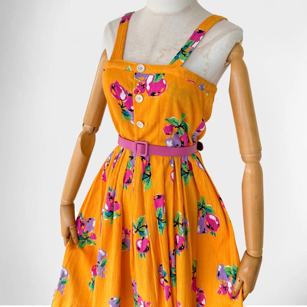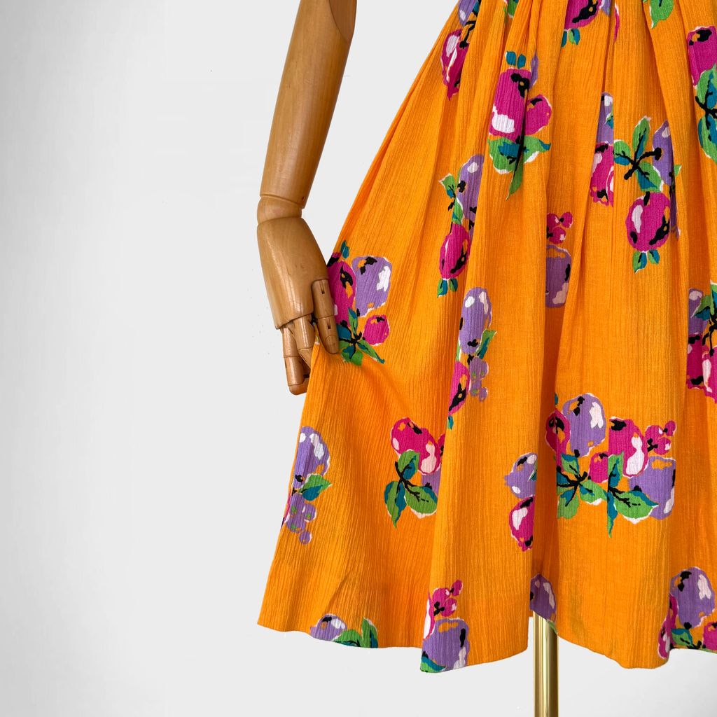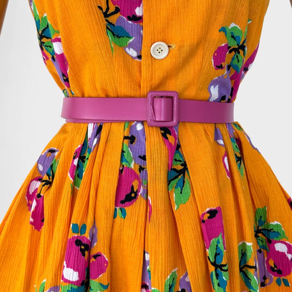Front buttons closure. Fixed pleated waistline. Unlined. Cotton crepe fabric. Belt not included.