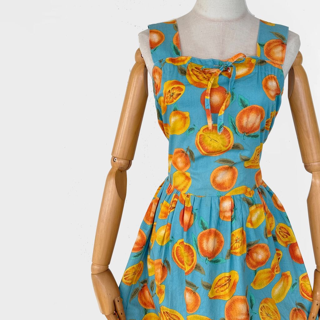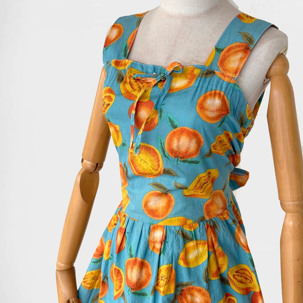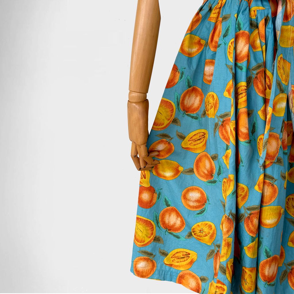 Circa 1980s. Turquoise blue dress with orange fruits print.