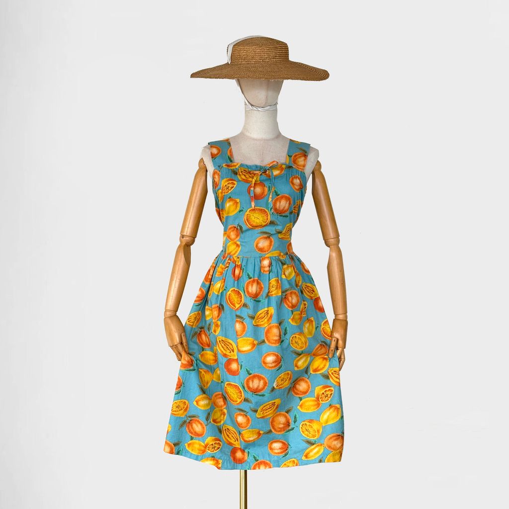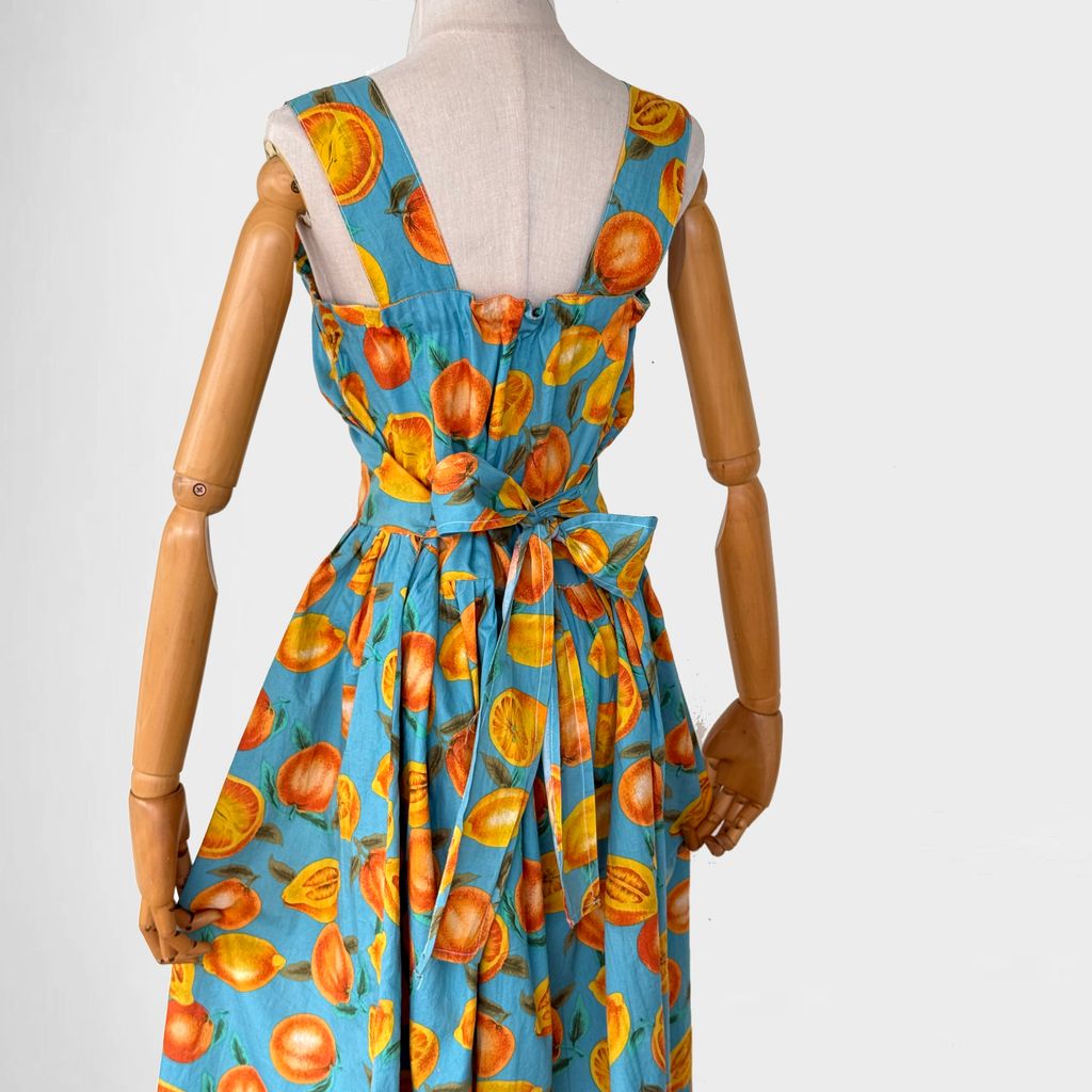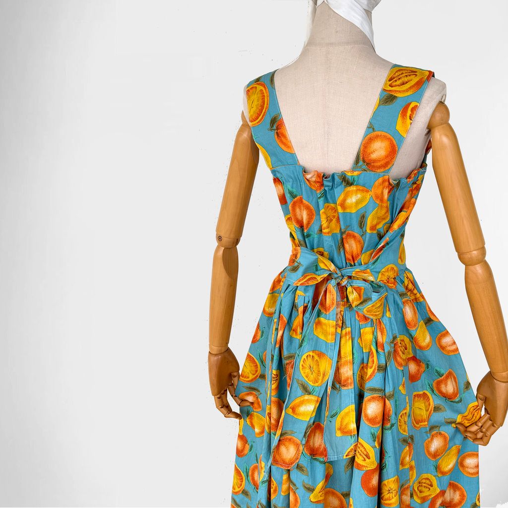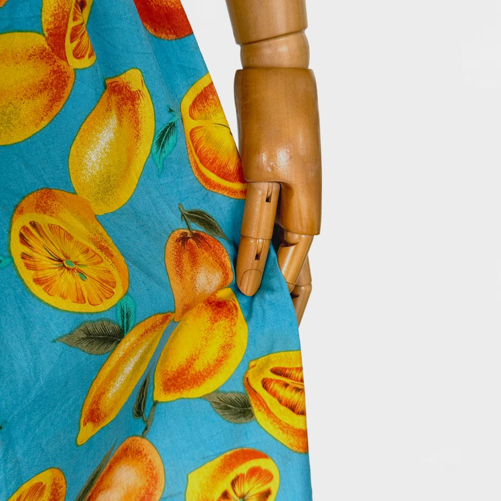 Circa 1980s. Turquoise blue dress with orange fruits print.