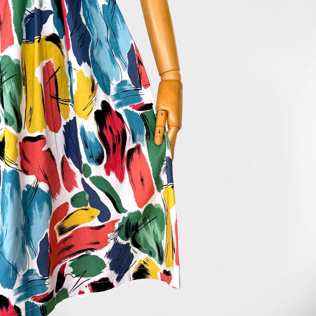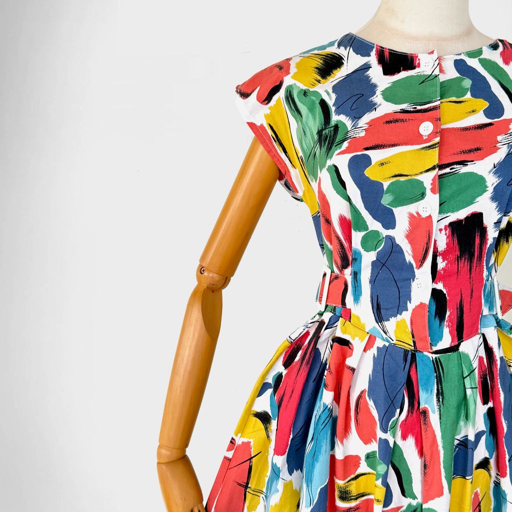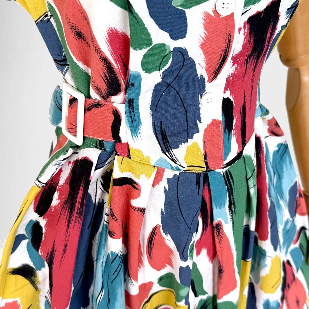 Front buttons closure. Fixed waistline with adjustable straps to fit. Unlined. Cotton fabric.