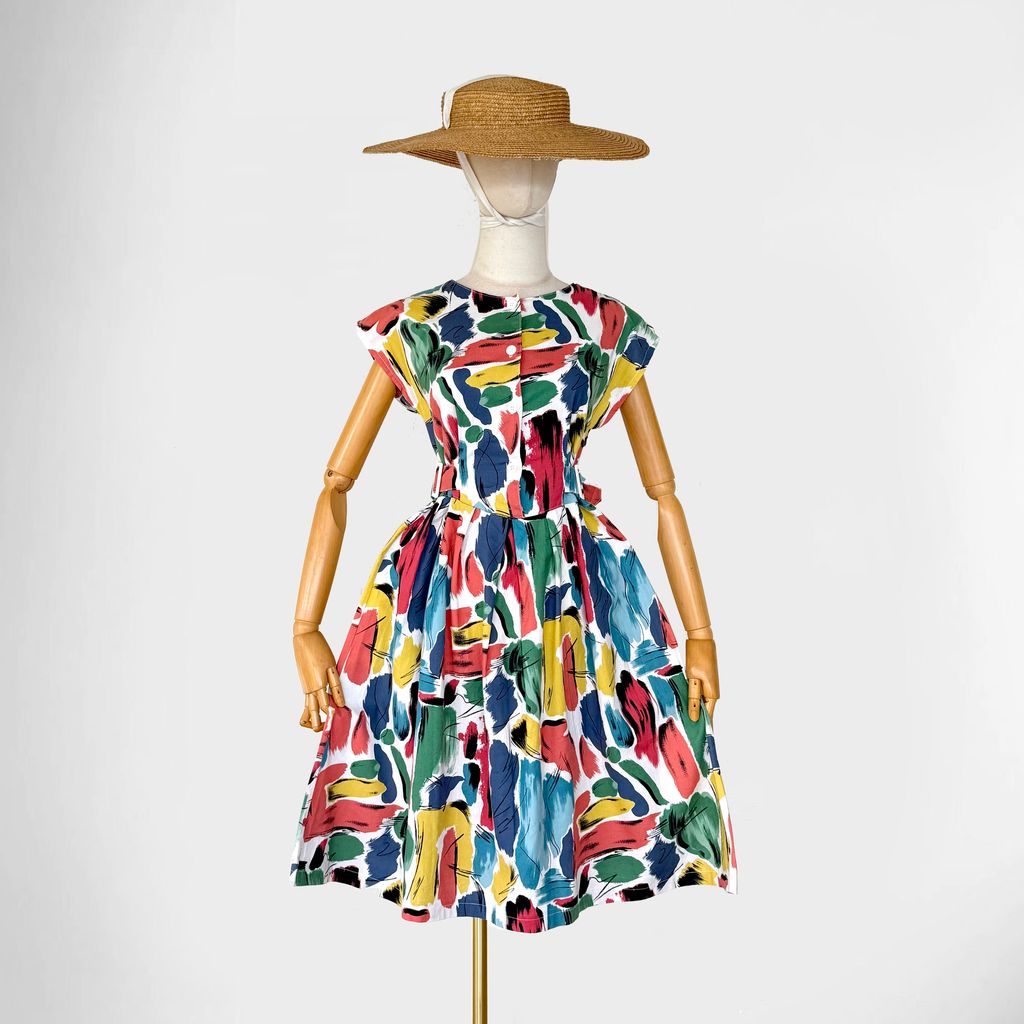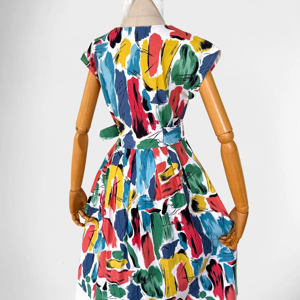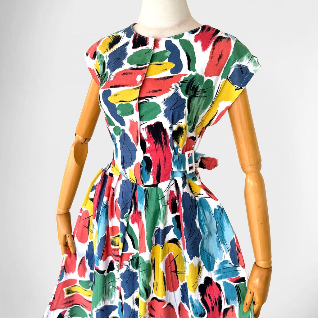 Front buttons closure. Fixed waistline with adjustable straps to fit. Unlined. Cotton fabric.