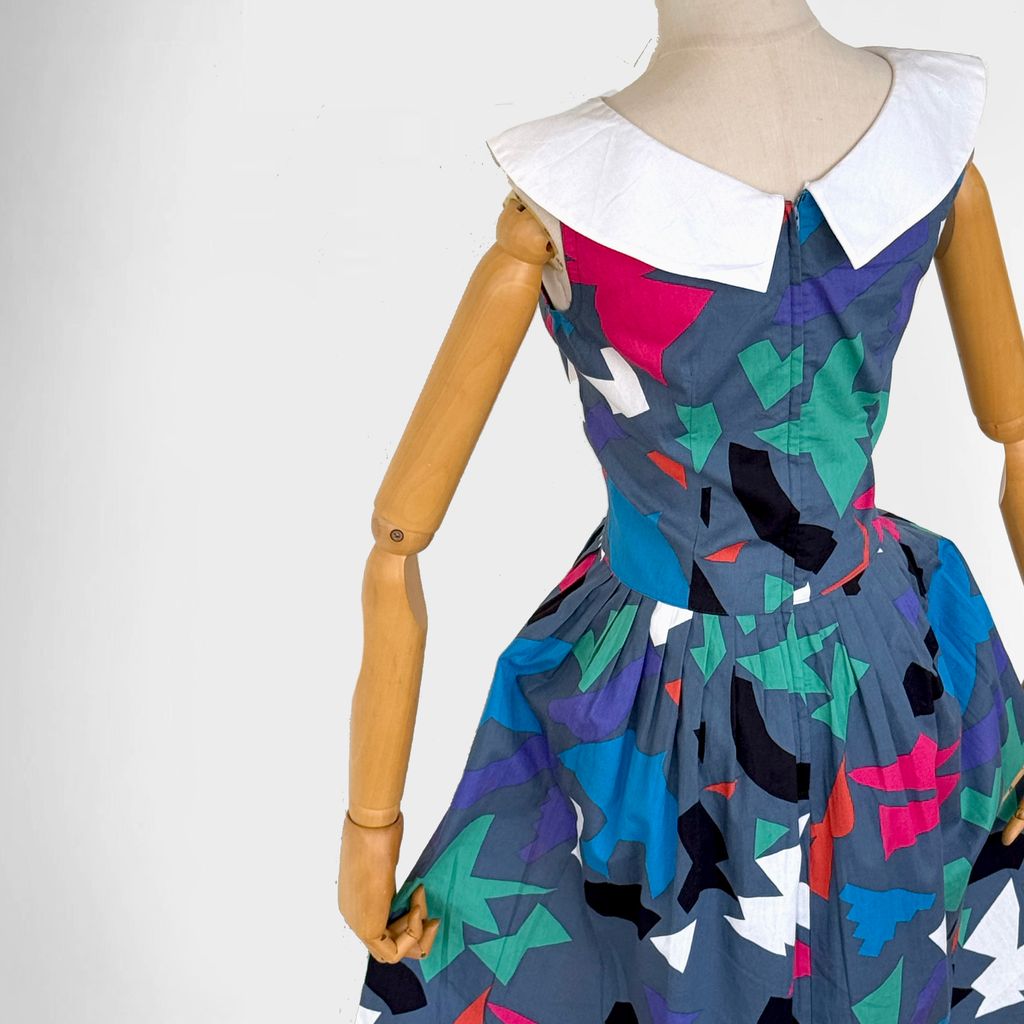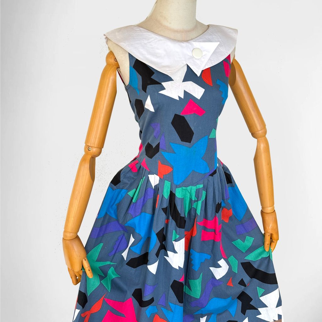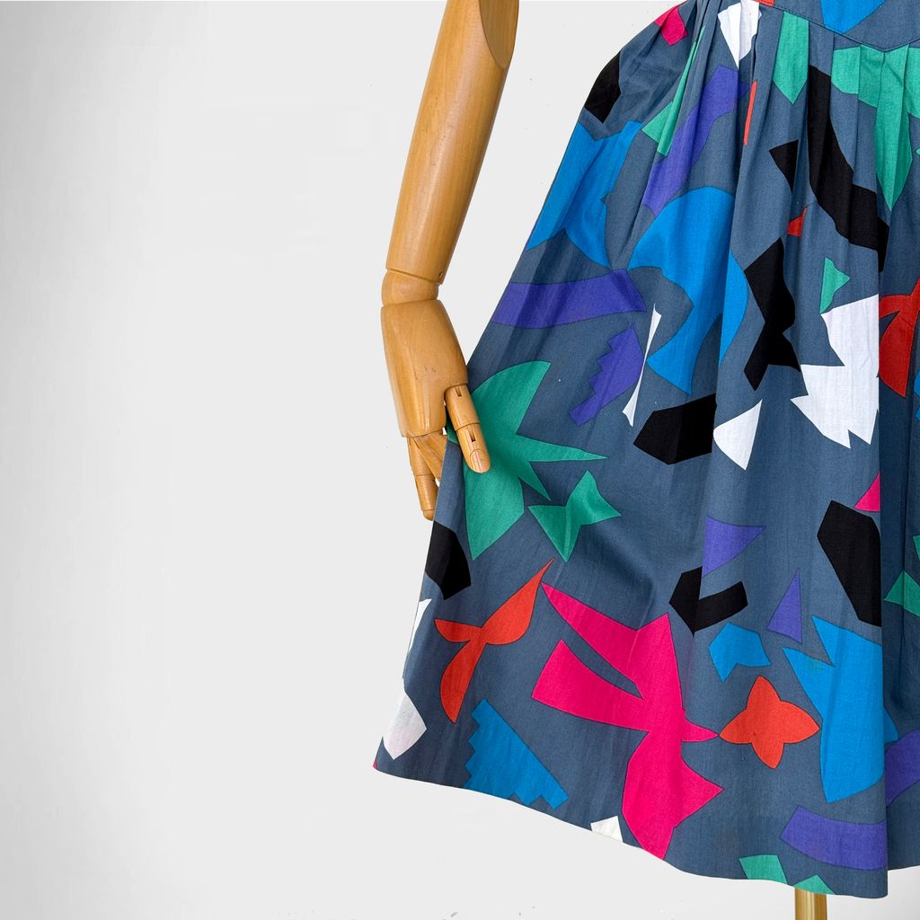 Circa 1980s. Navy grey dress with colourful abtract print.