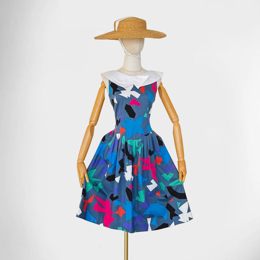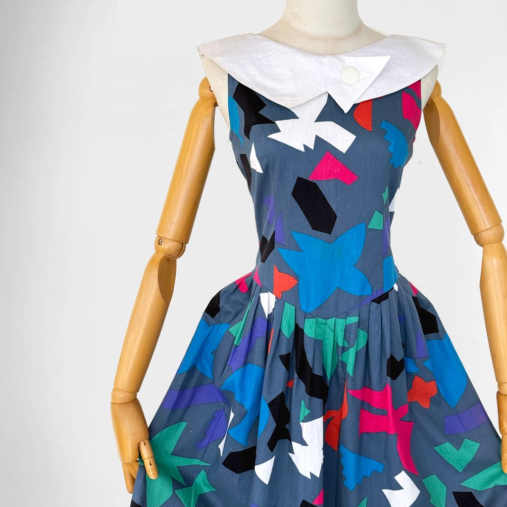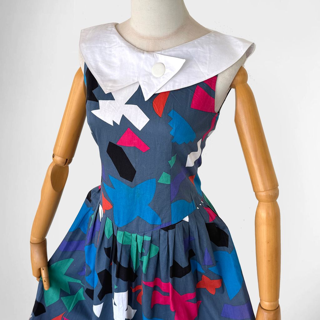 Circa 1980s. Navy grey dress with colourful abtract print.