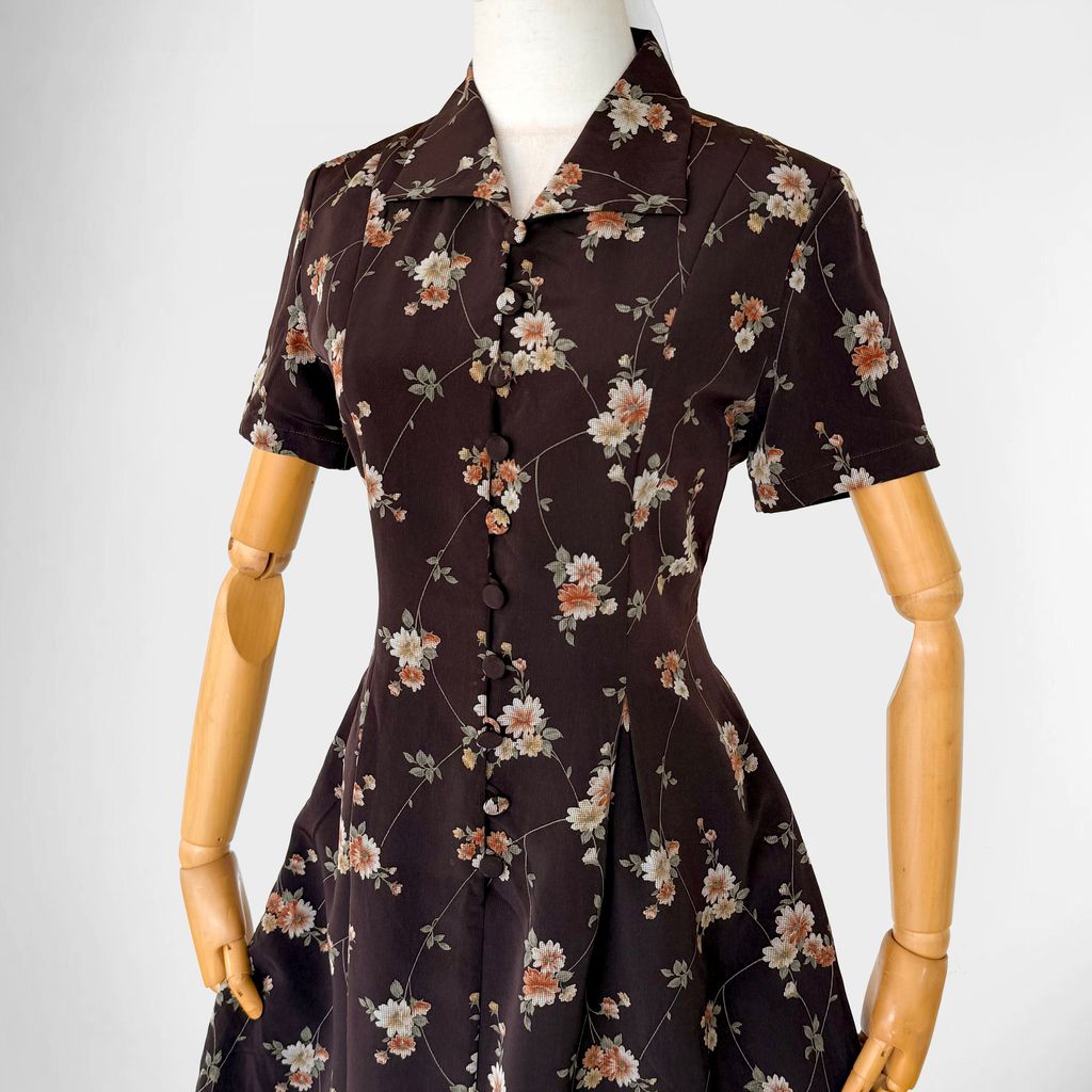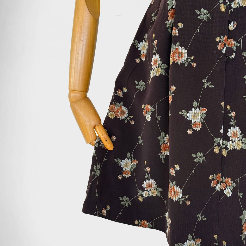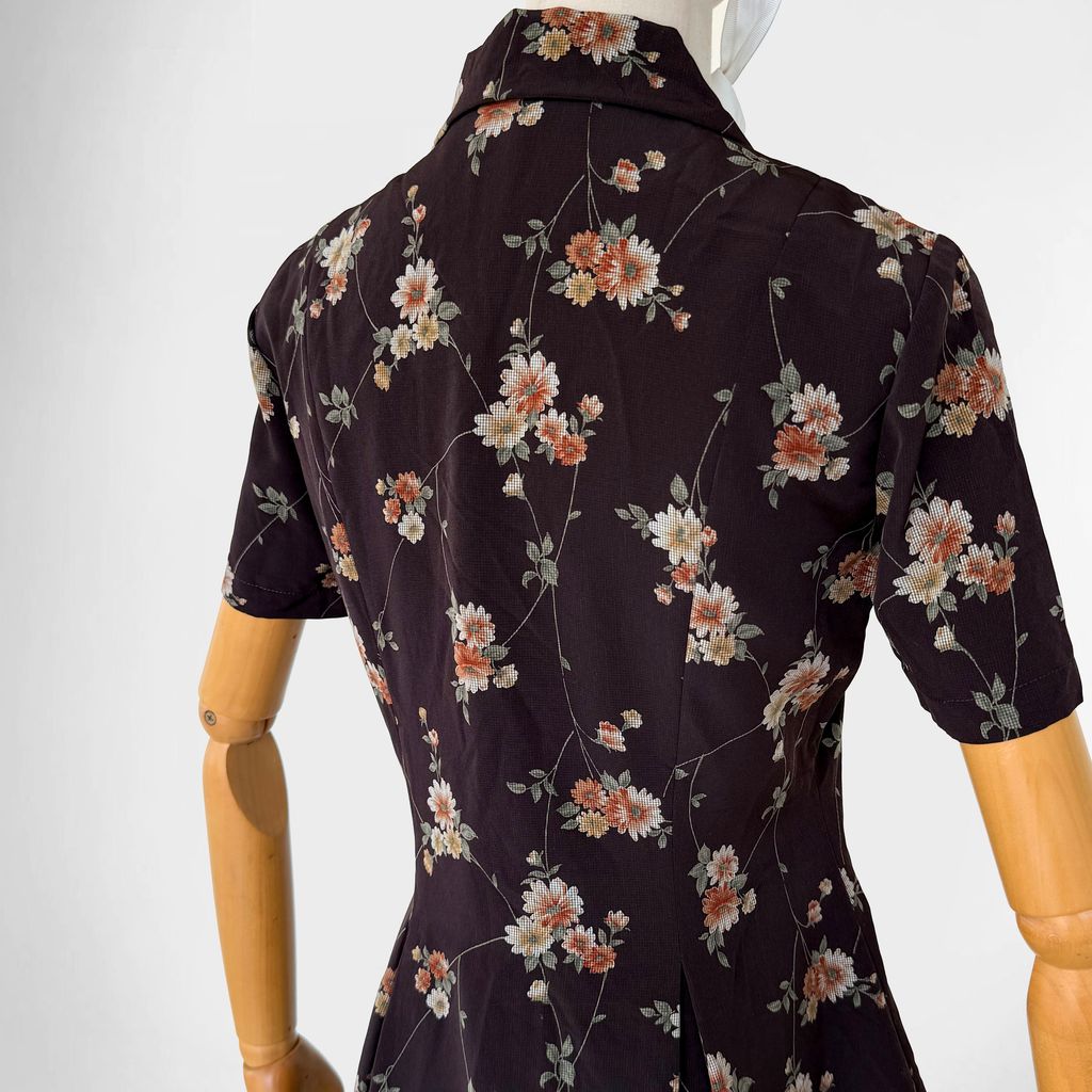 Circa 1980s. Dark brown dress with orange yellow florals print.