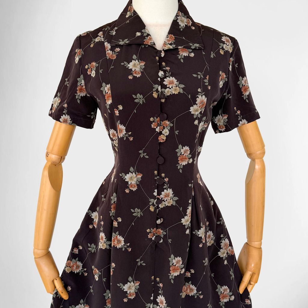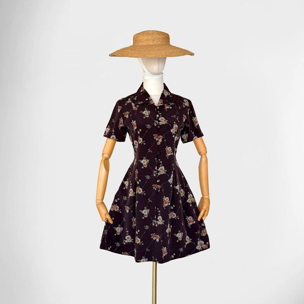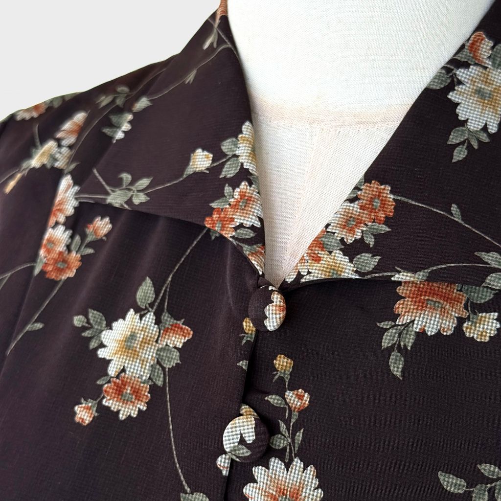 Circa 1980s. Dark brown dress with orange yellow florals print.