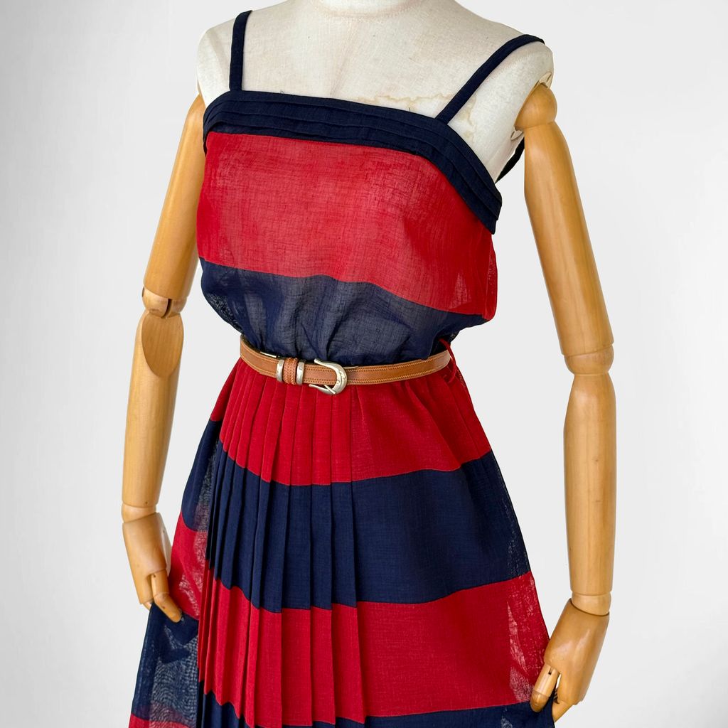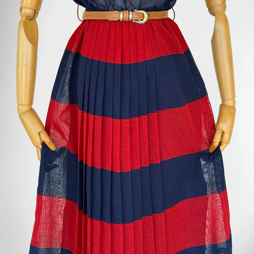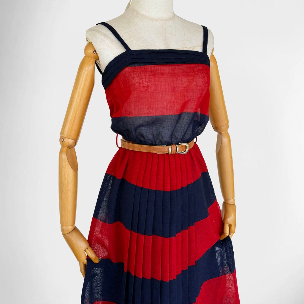 Circa 1980s. Beautiful sleeveless red & navy blue dress.