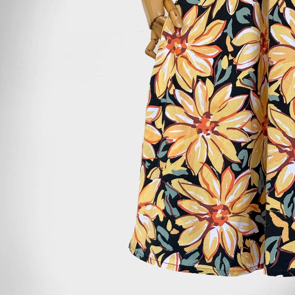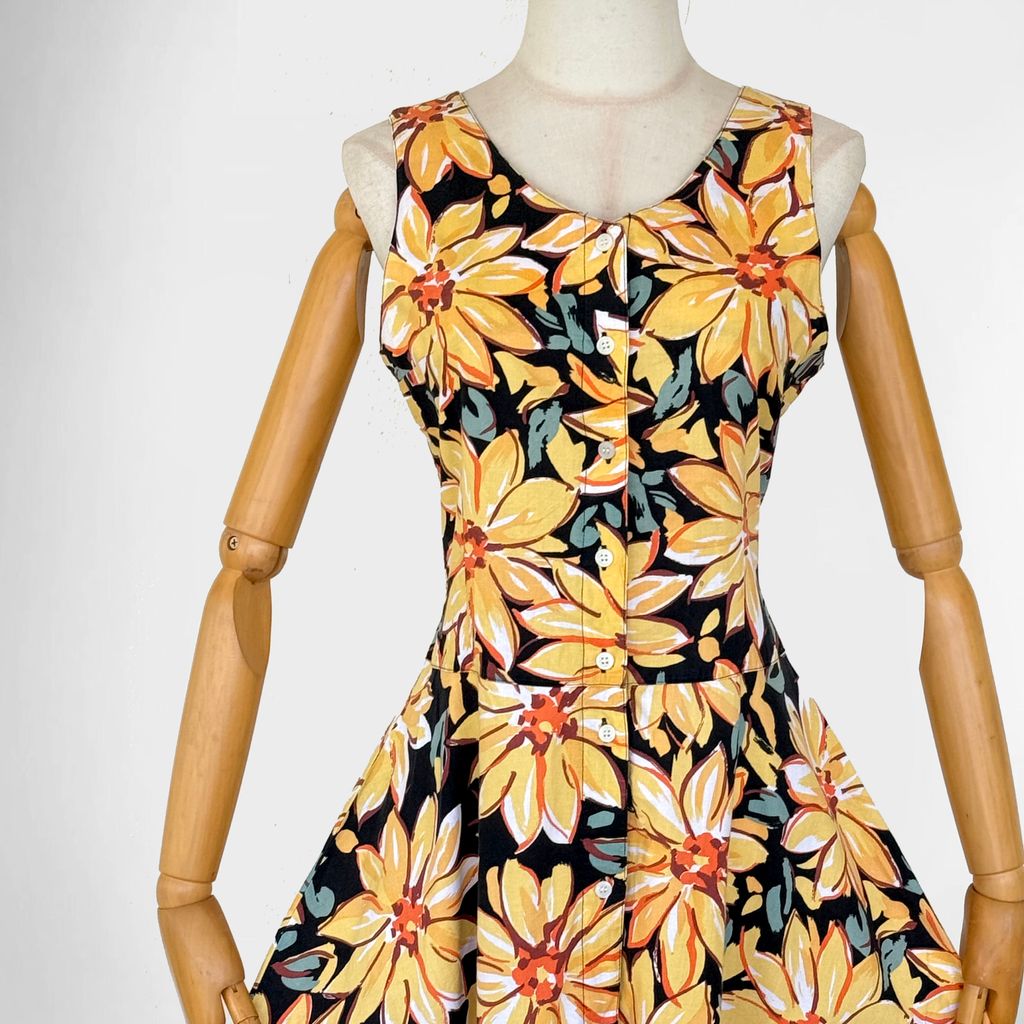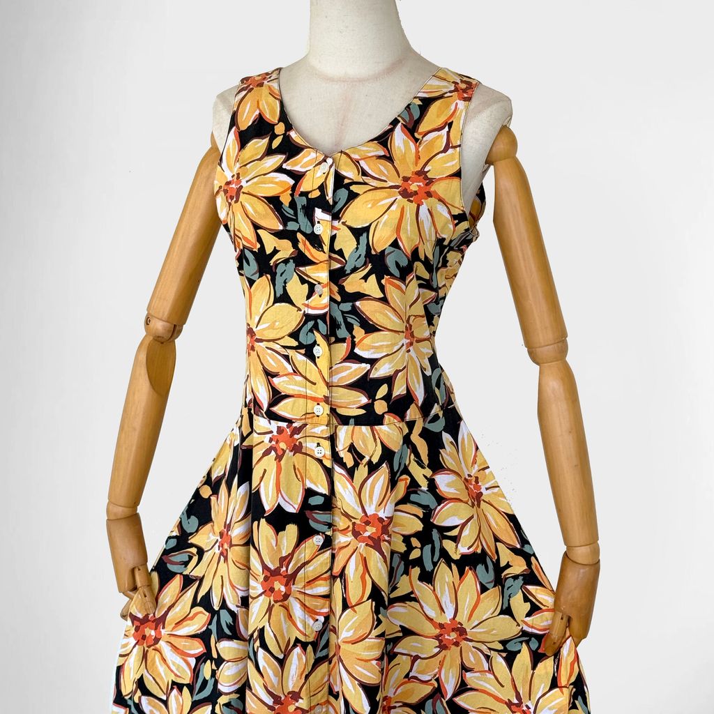 Circa 1980s. Black dress with yellow floral print.