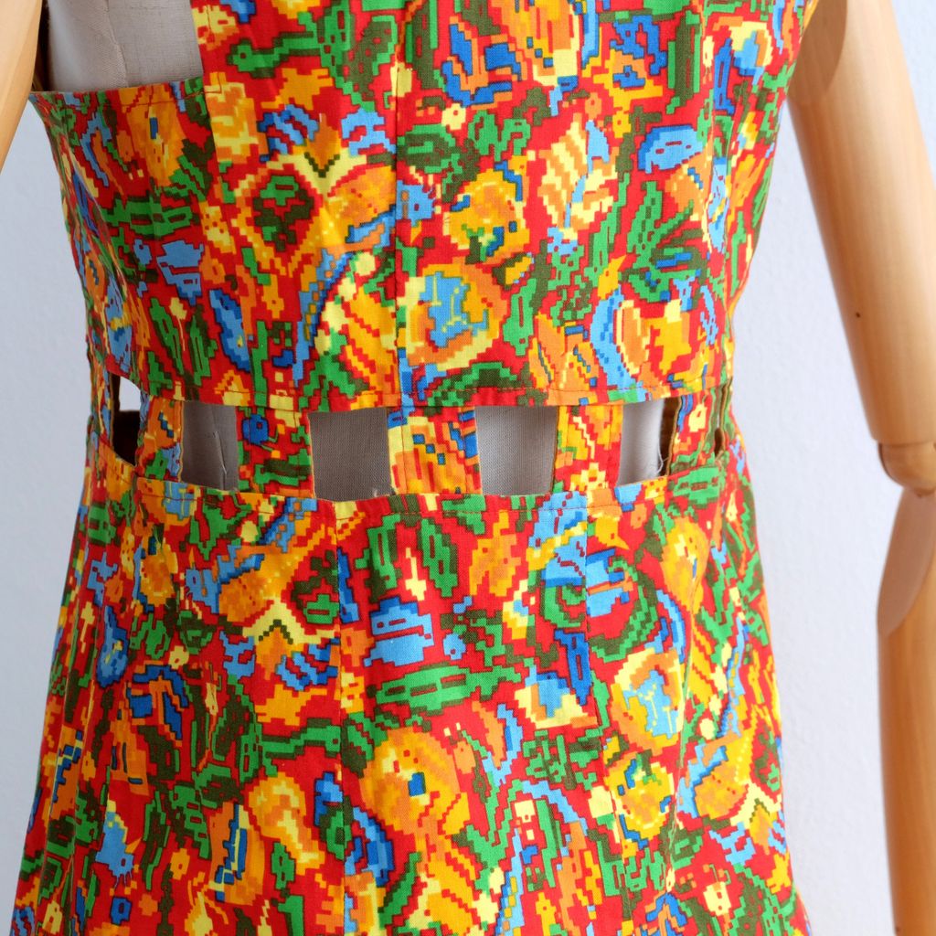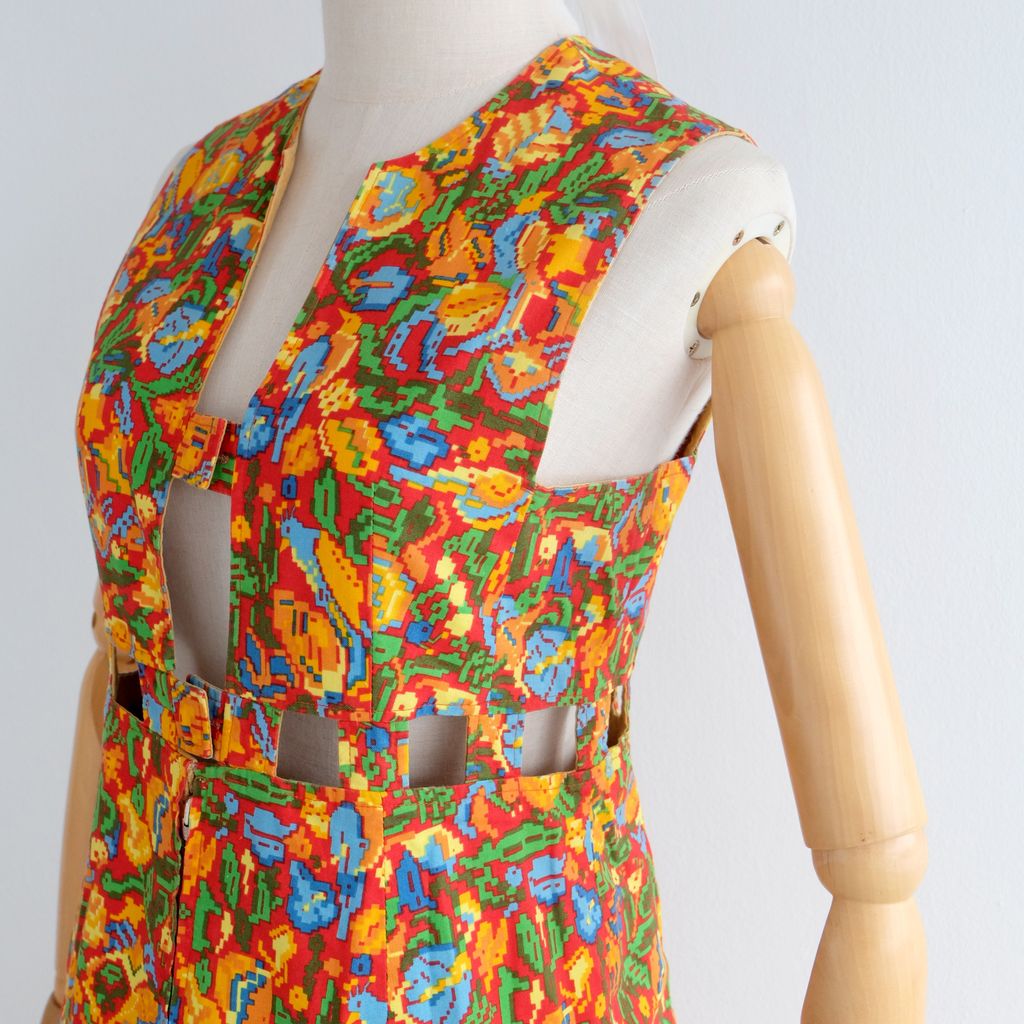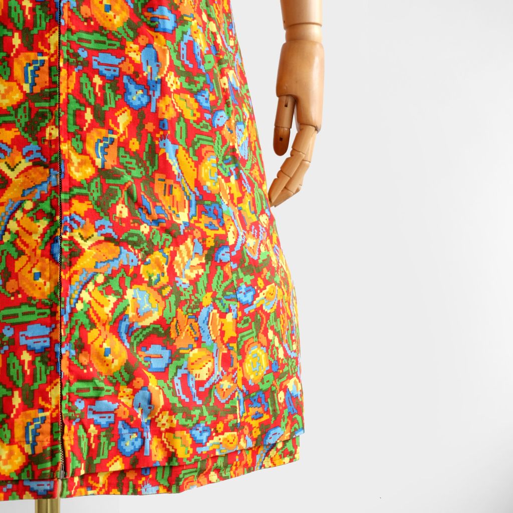Circa 1960s. Rare red dress with pixelate florals print.