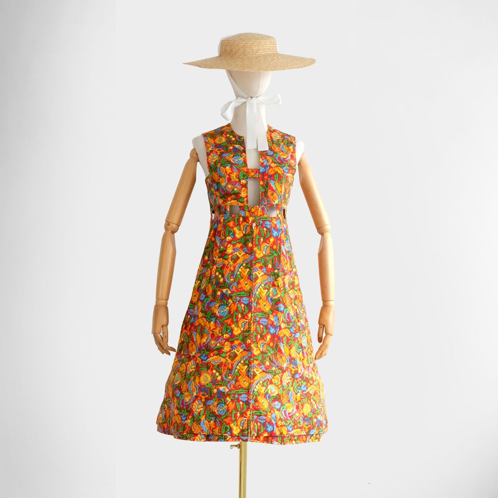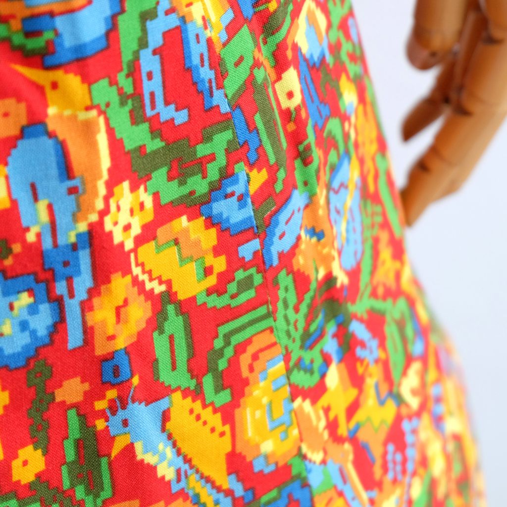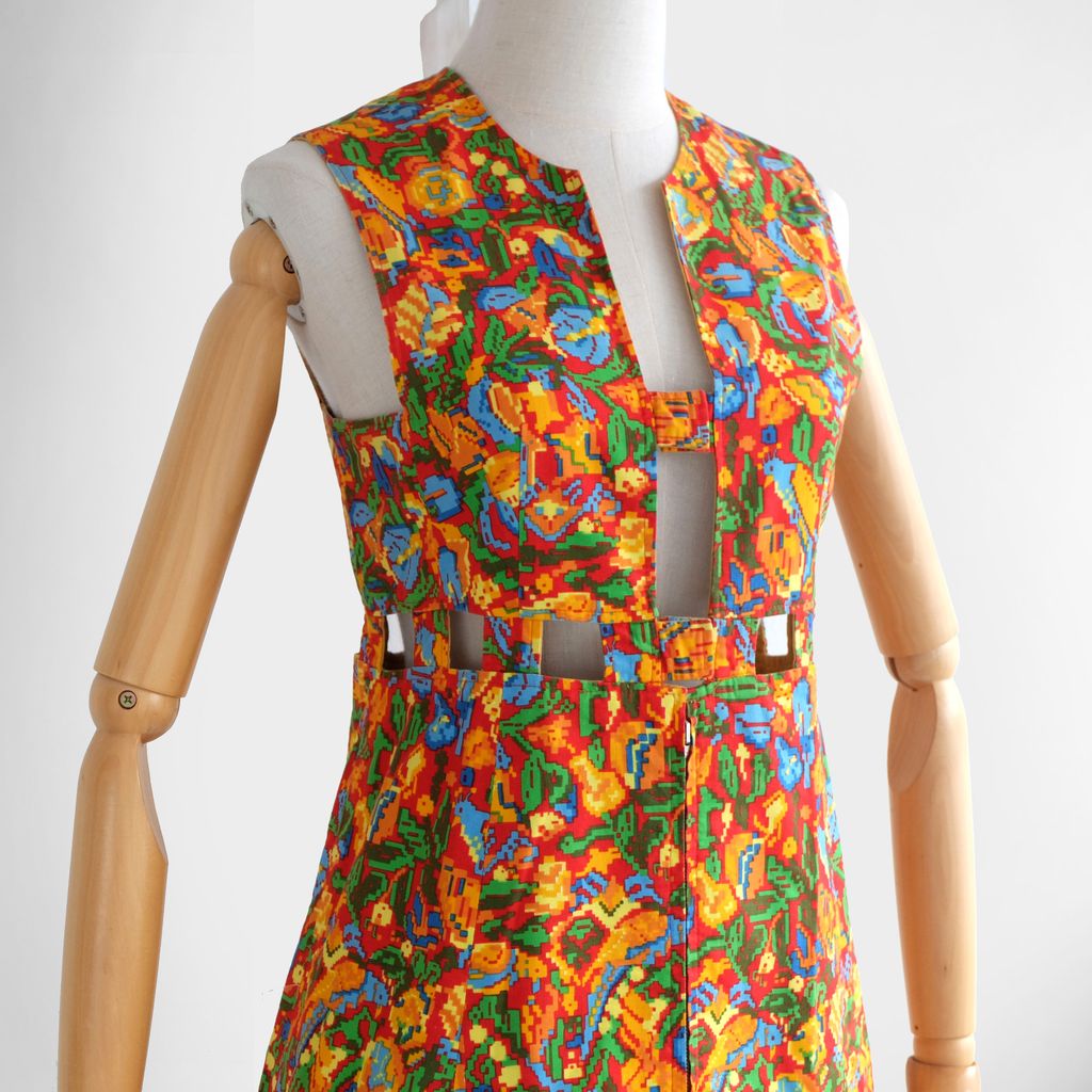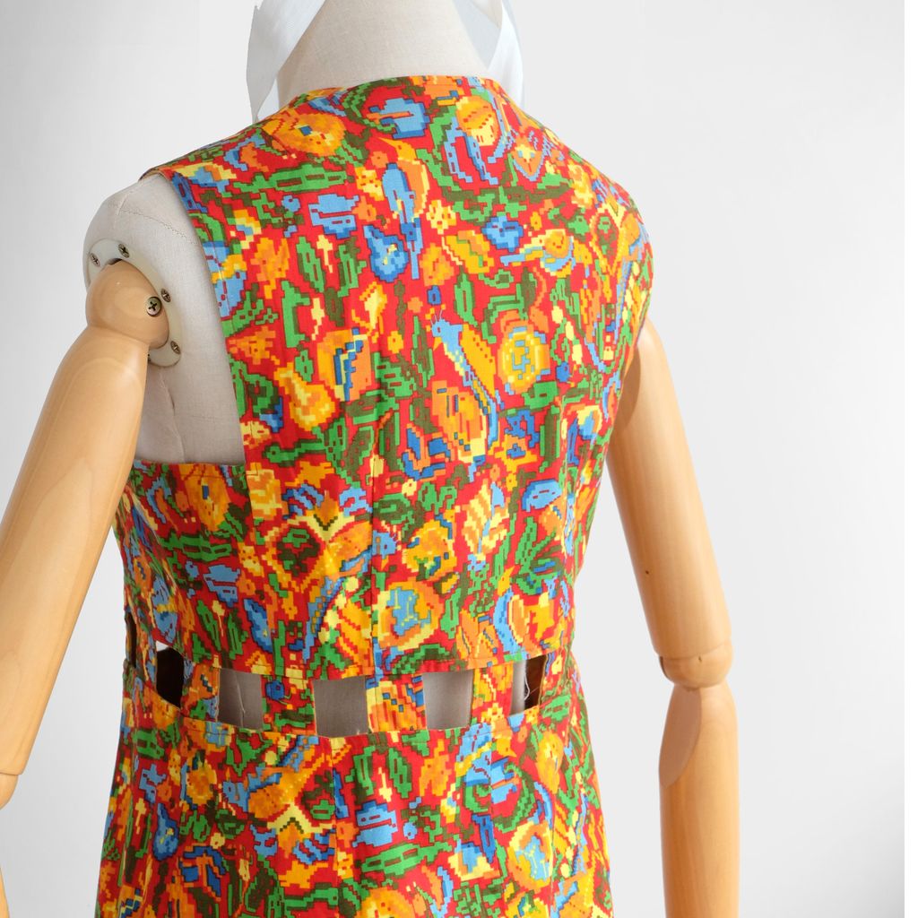 Circa 1960s. Rare red dress with pixelate florals print.