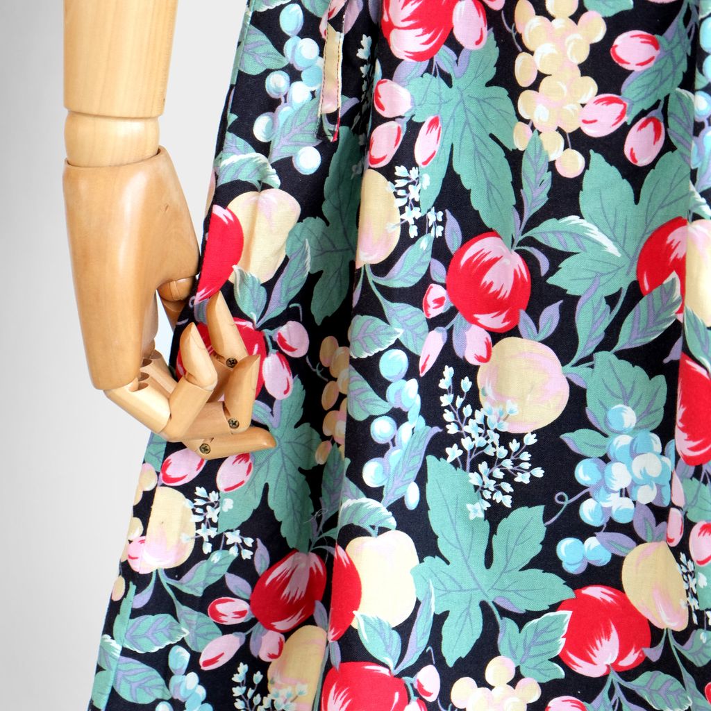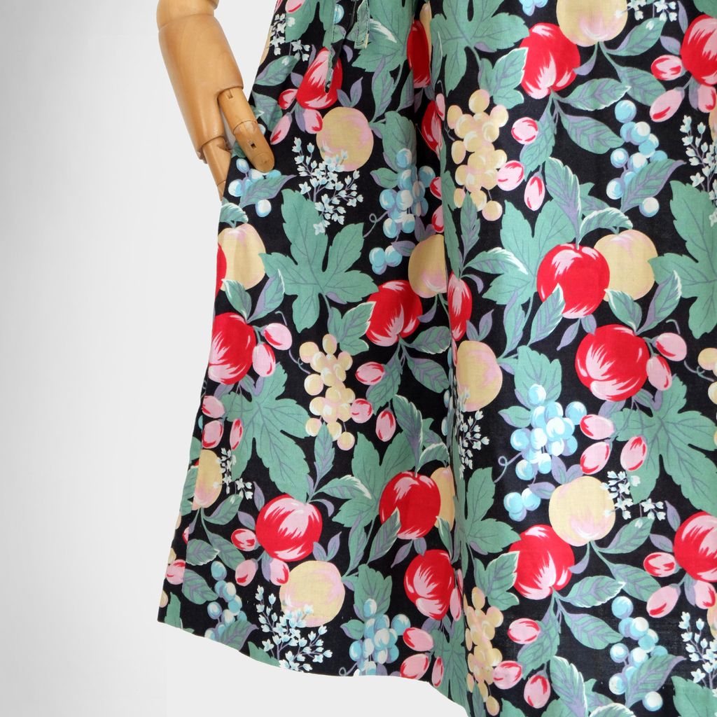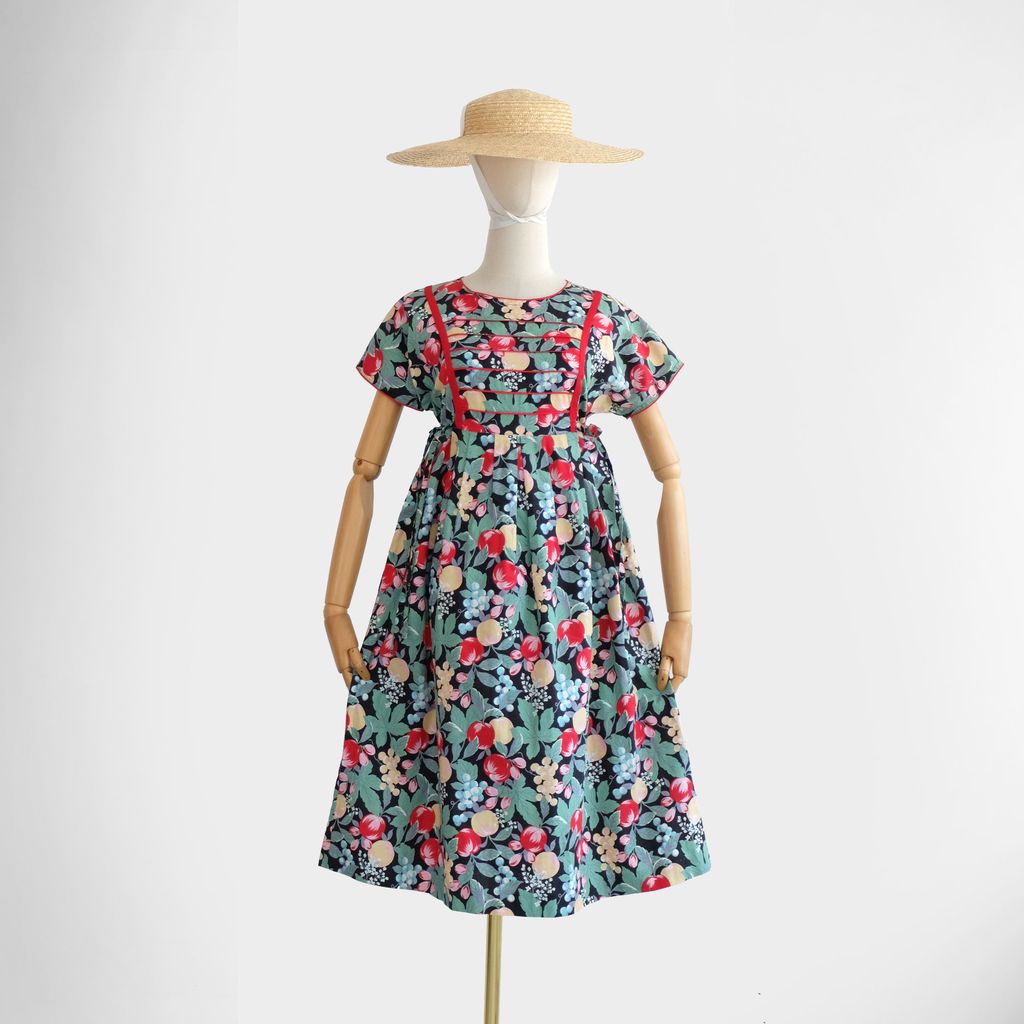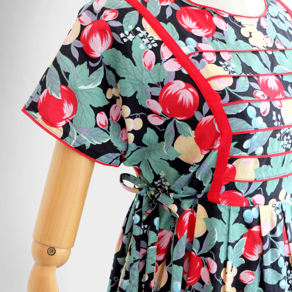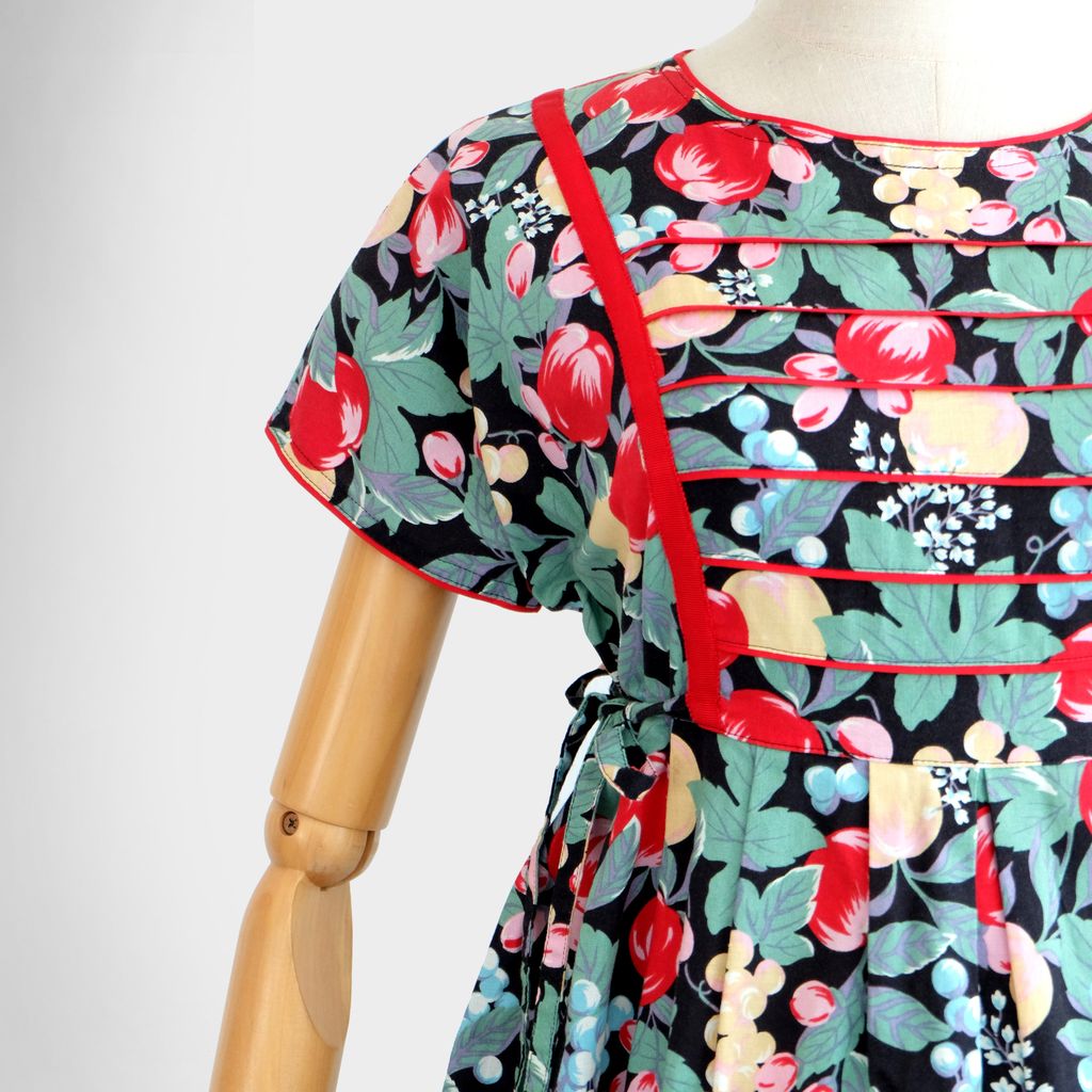 Neckline with red trim design. Fitted waist with side band to cinch both sides. Back zip closure. Cotton fabric.