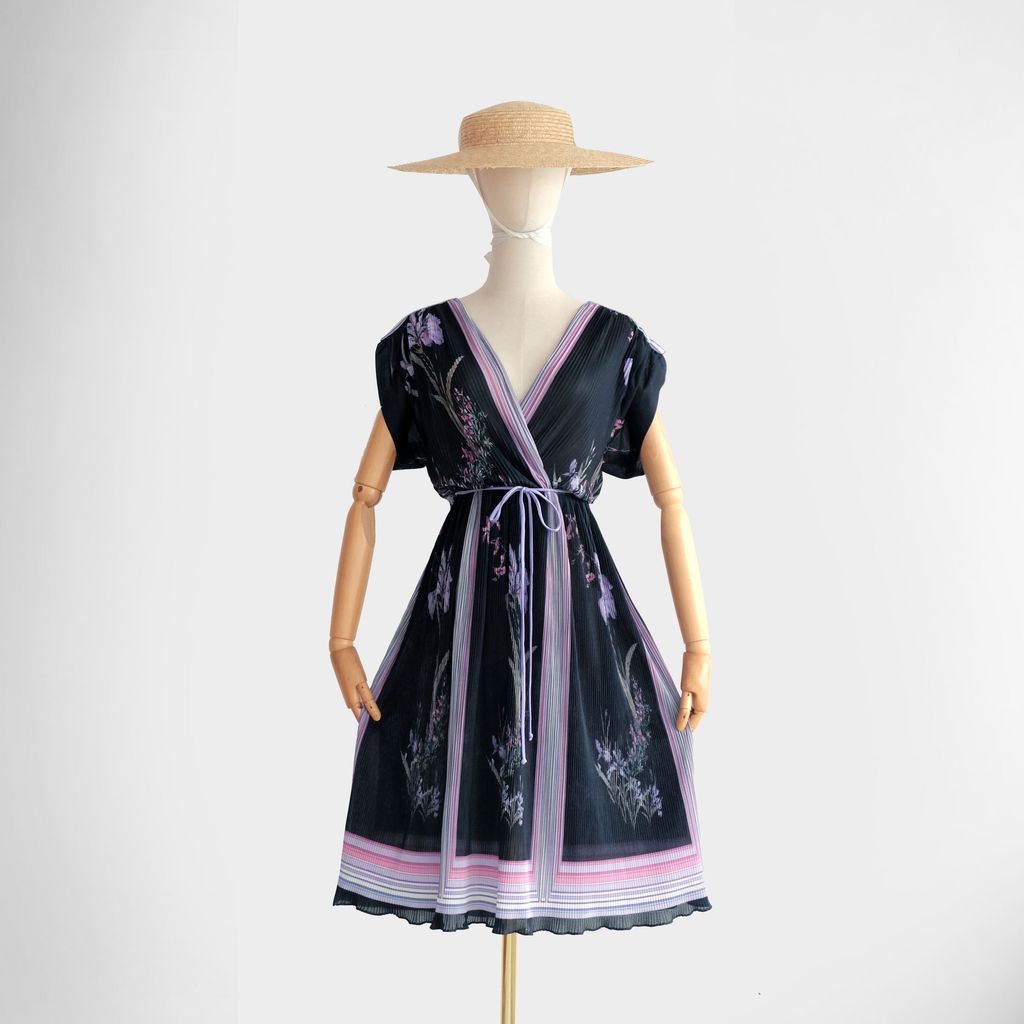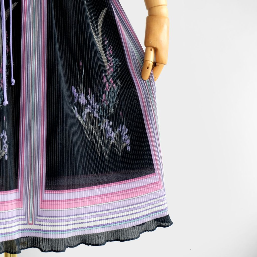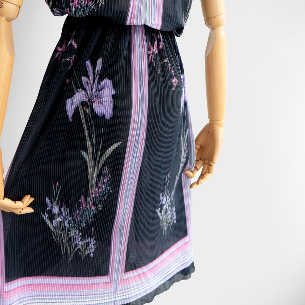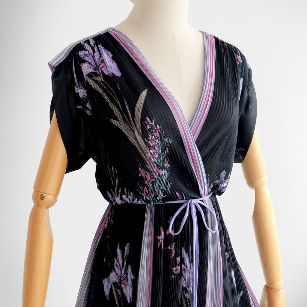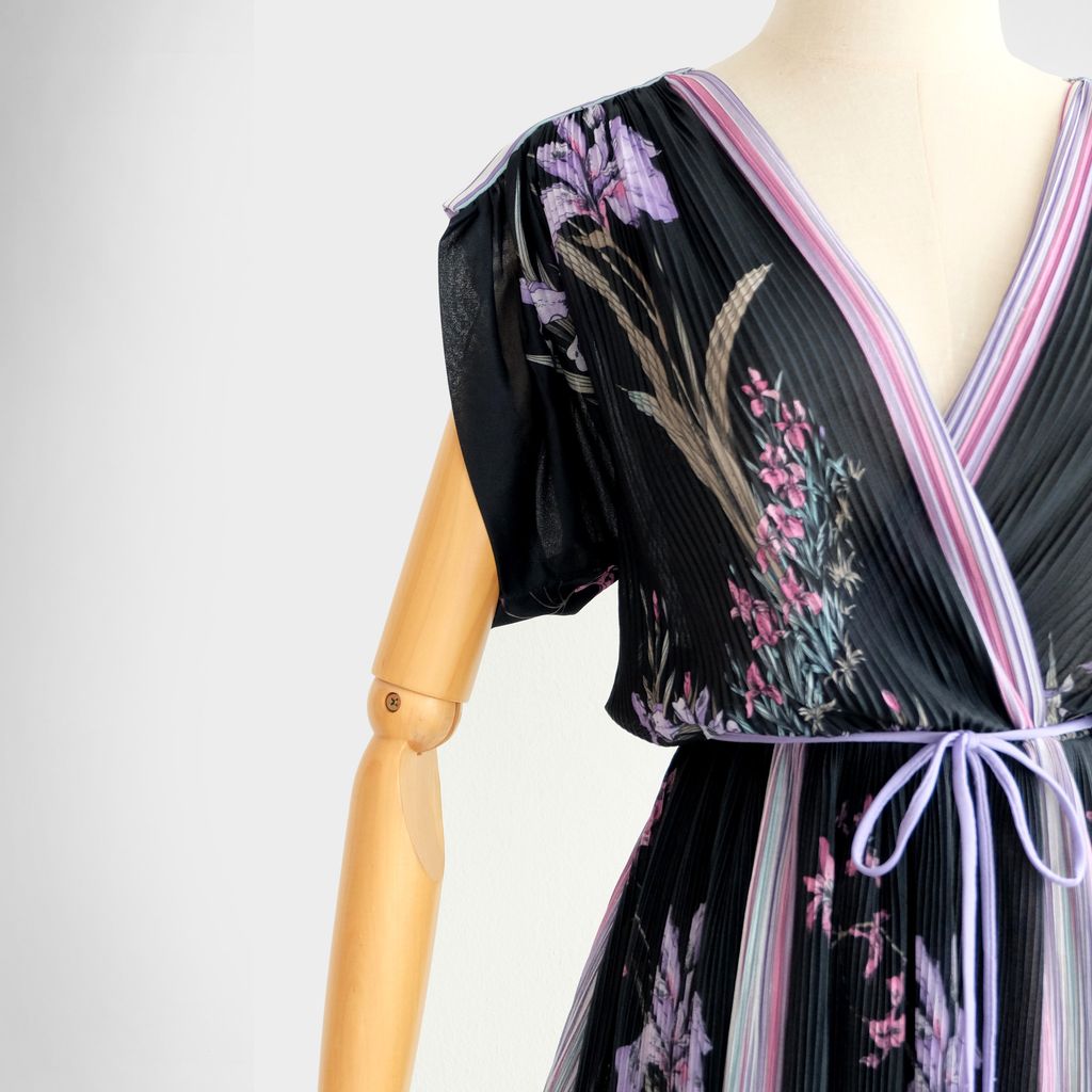 Open V neck design. Comes with matching belt to cinch. Pull over. Elastic waist. Unlined. Pleated fabric.