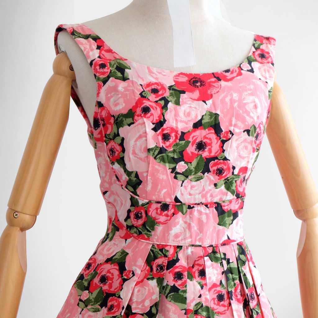 Vintage Inspired 50s design. A softly scooped neckline and subtle low scoop at the back. The full skirt falls from a flattering curved waistband. Fitted waist. Back zip closure. Cotton fabric.