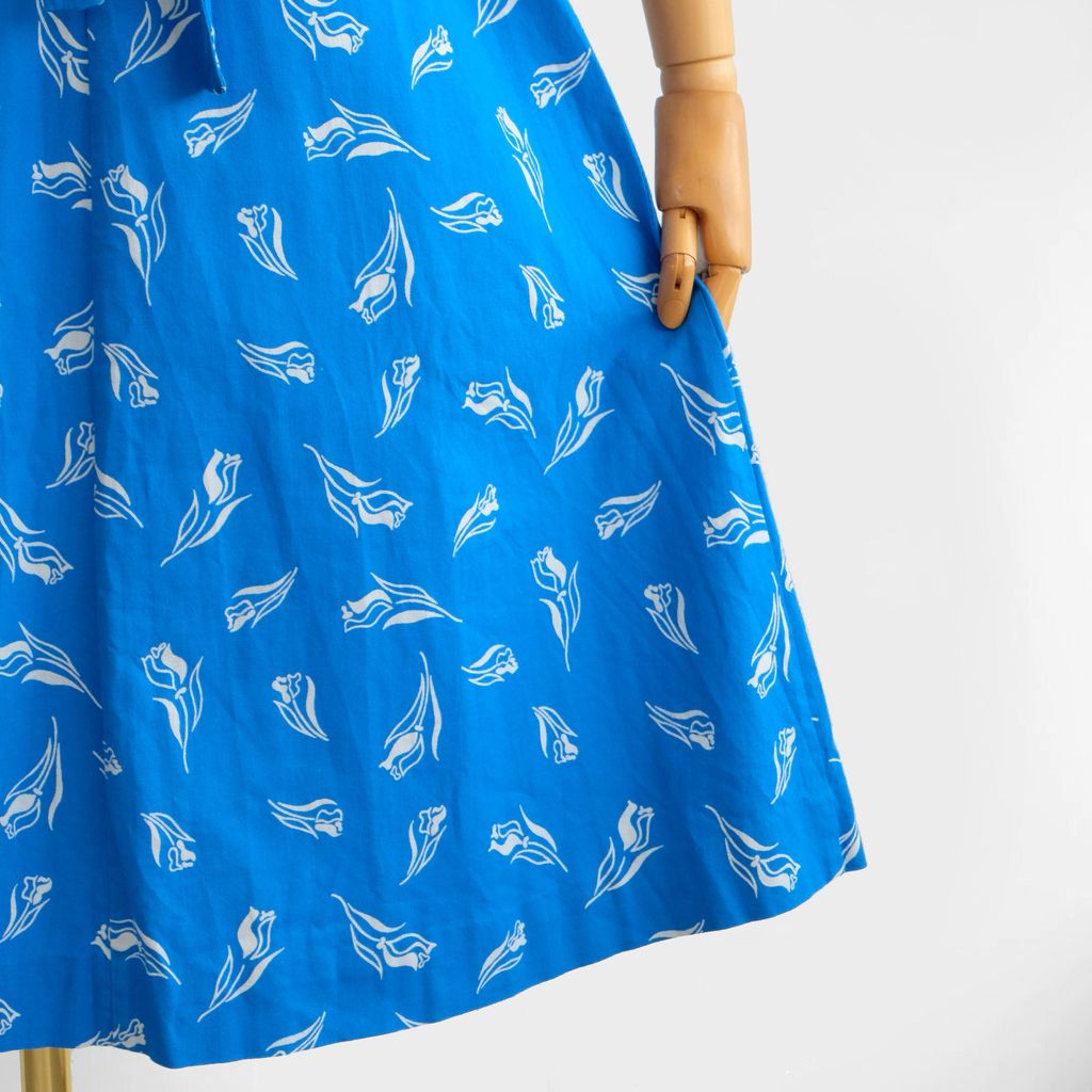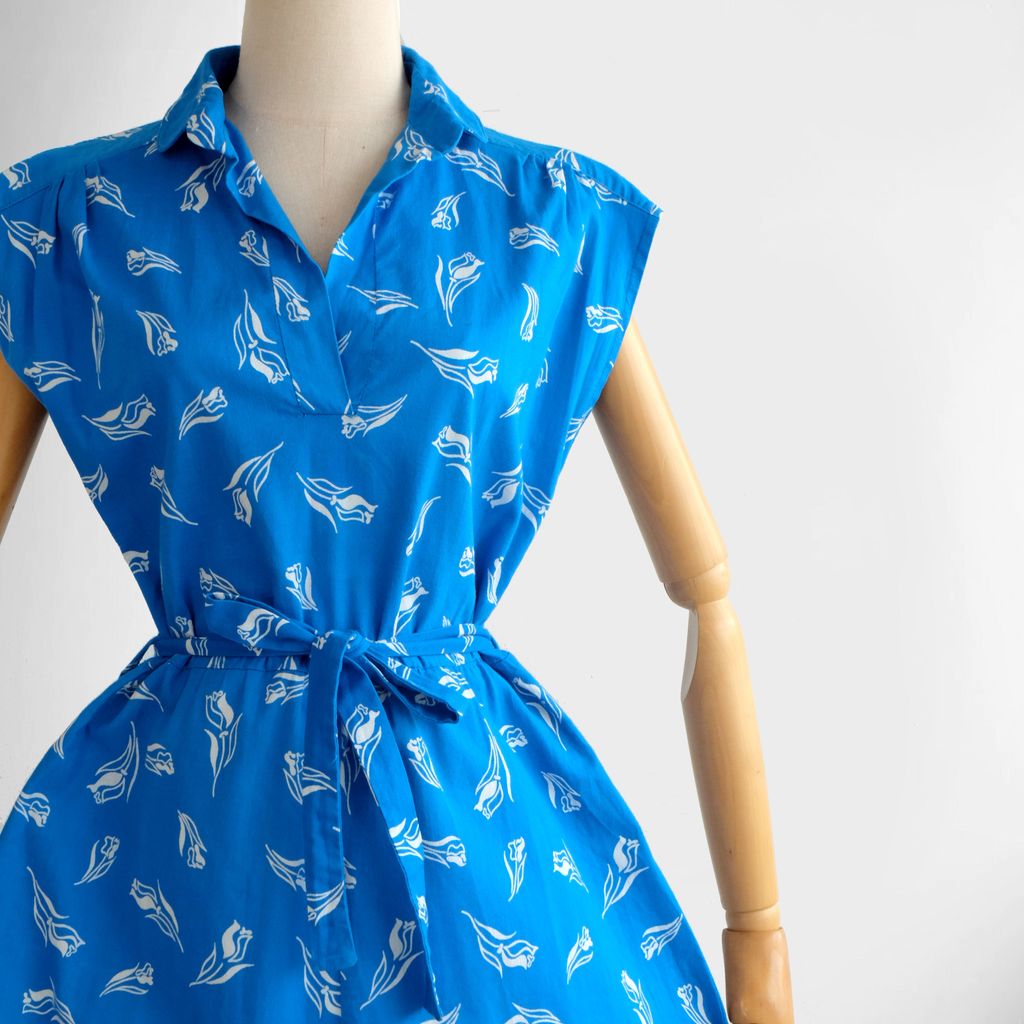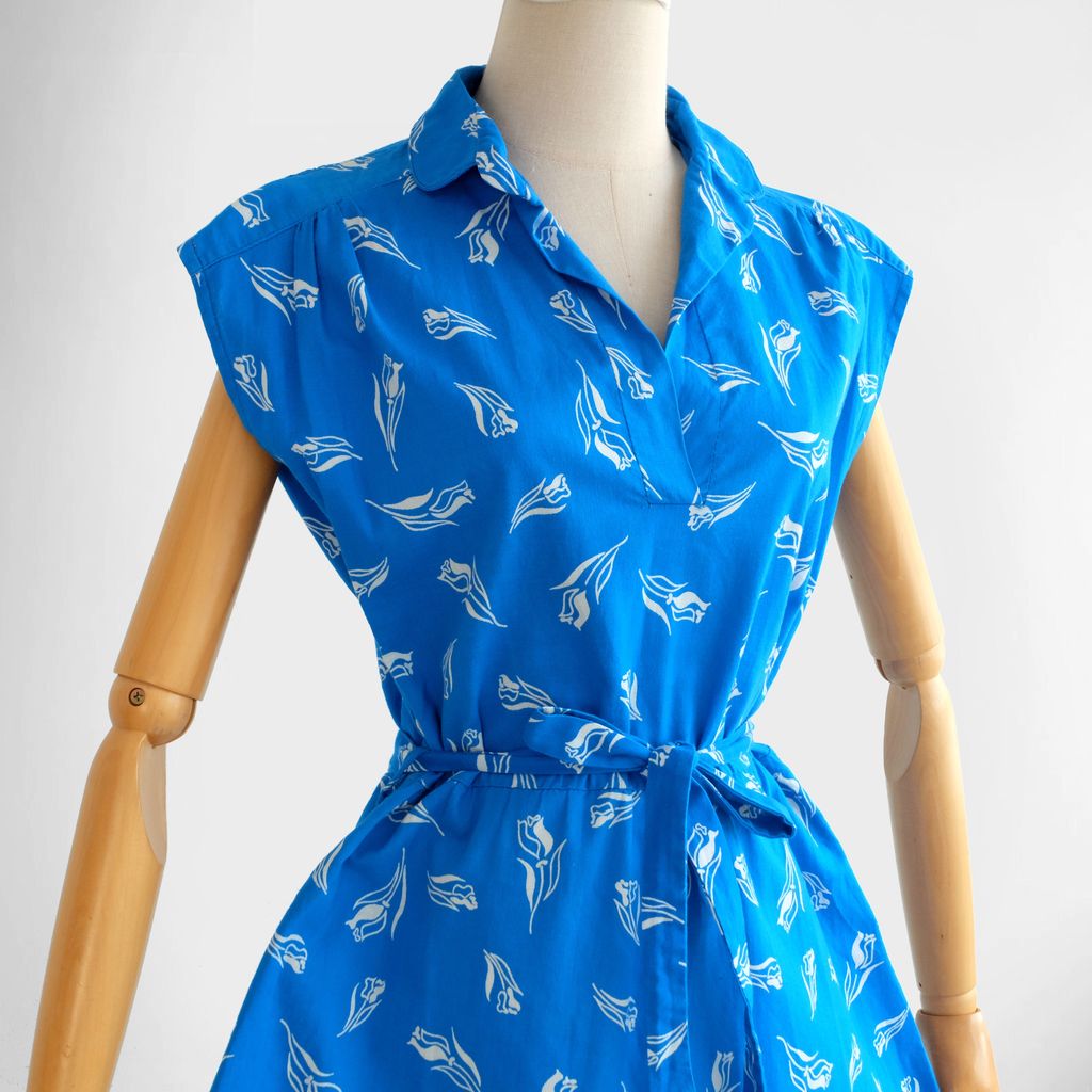 Circa 1980s. Beautiful blue dress with florals print.