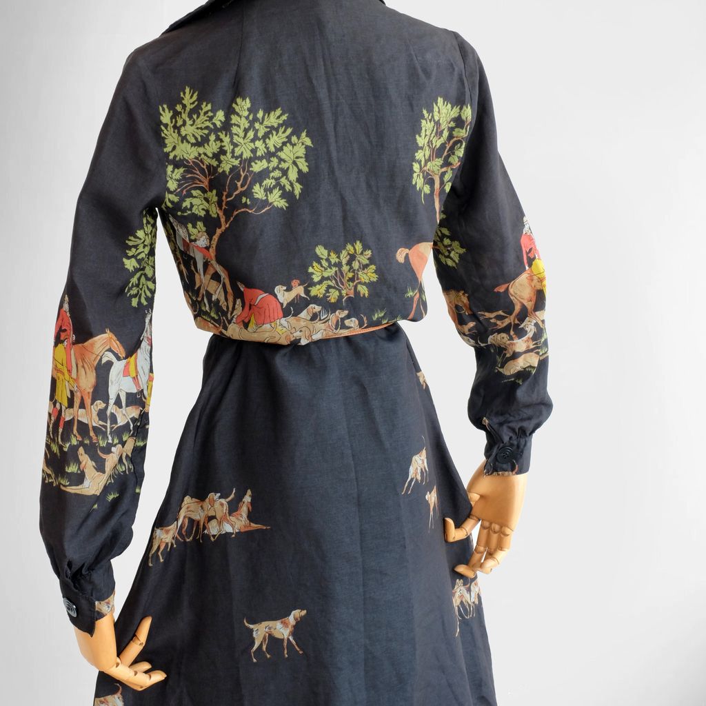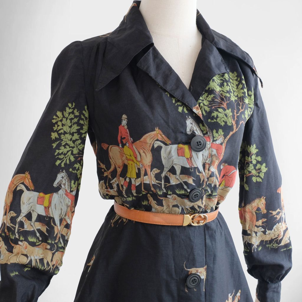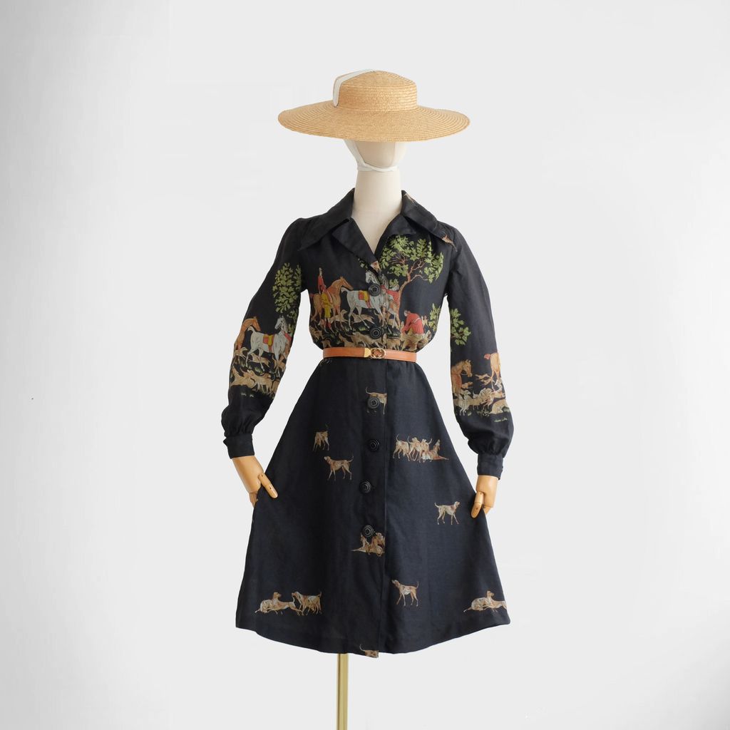 Circa 1960s -70s. Rare Black dress with horses and dogs print.