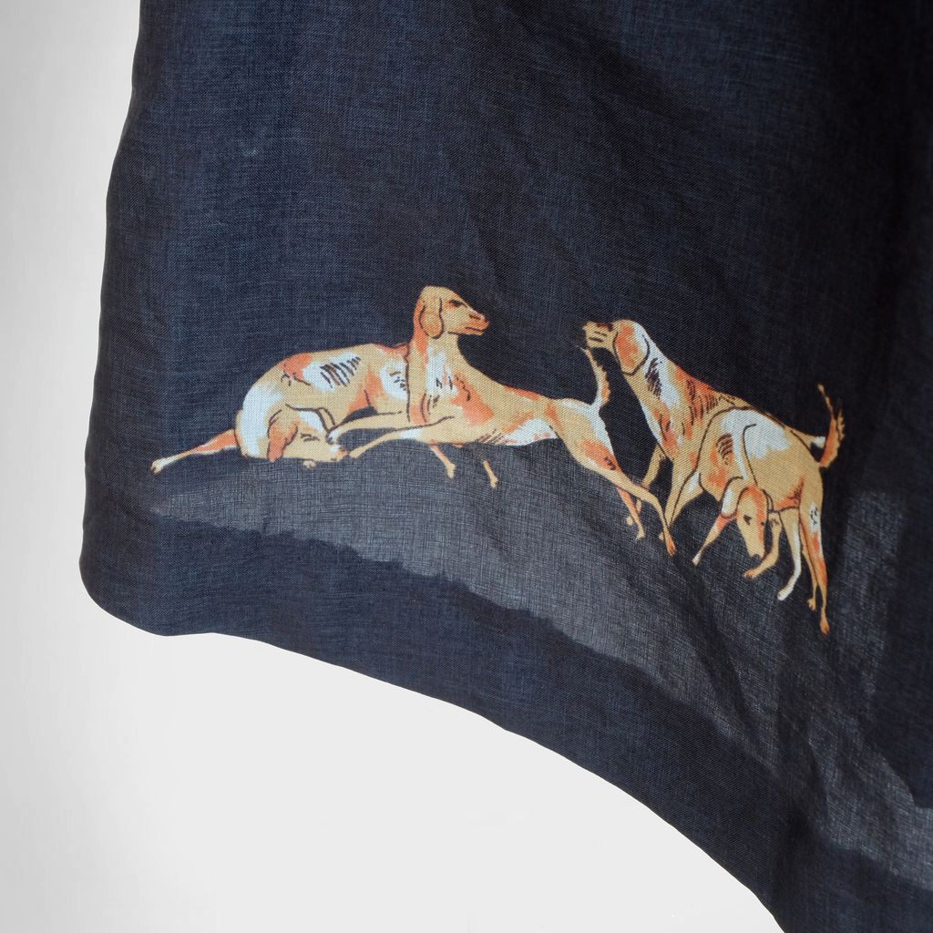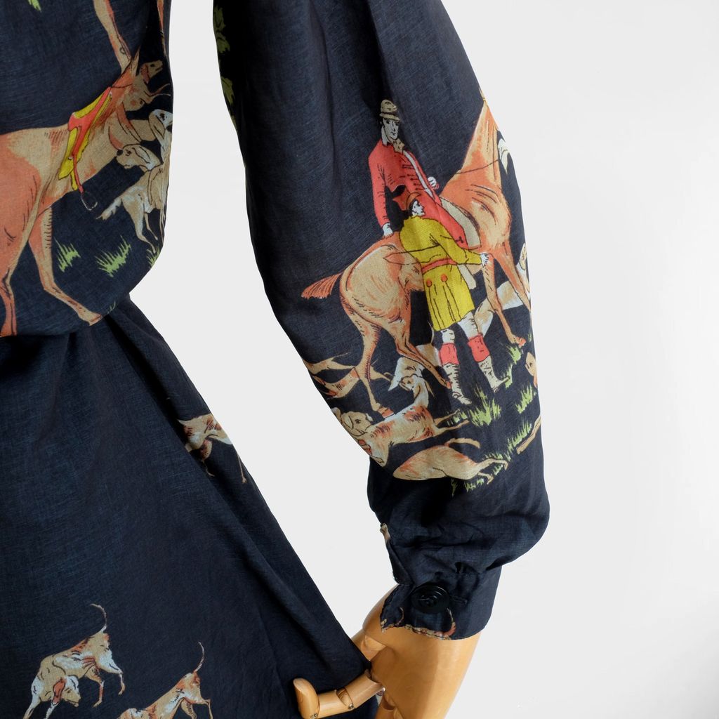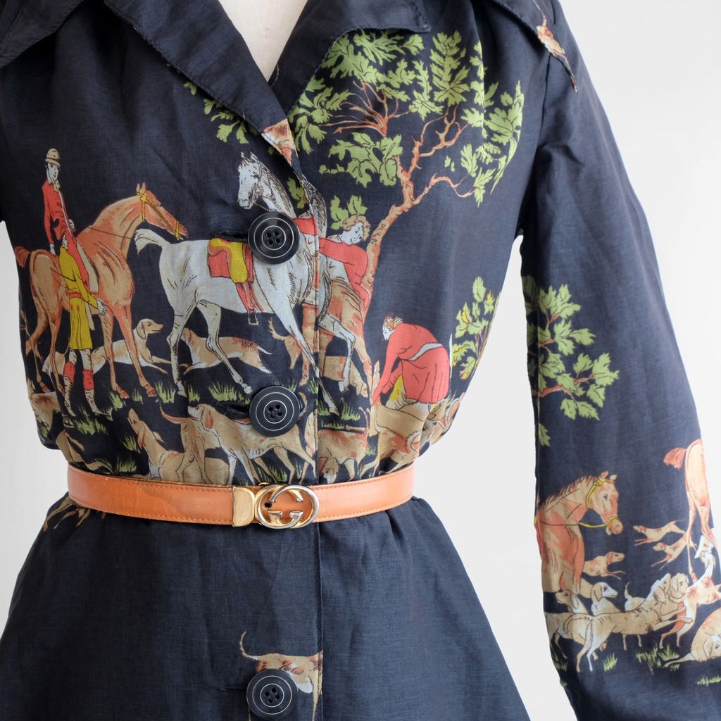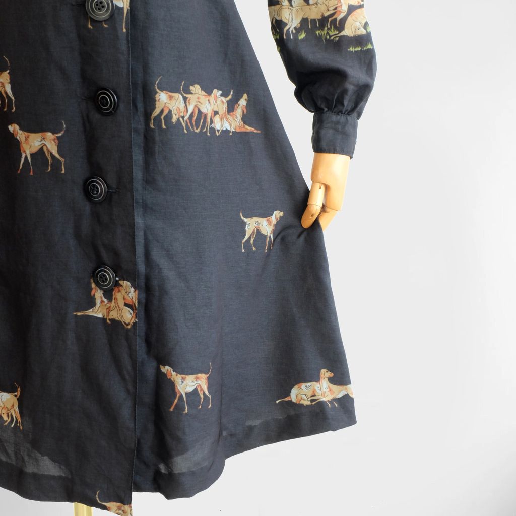Circa 1960s -70s. Rare Black dress with horses and dogs print.