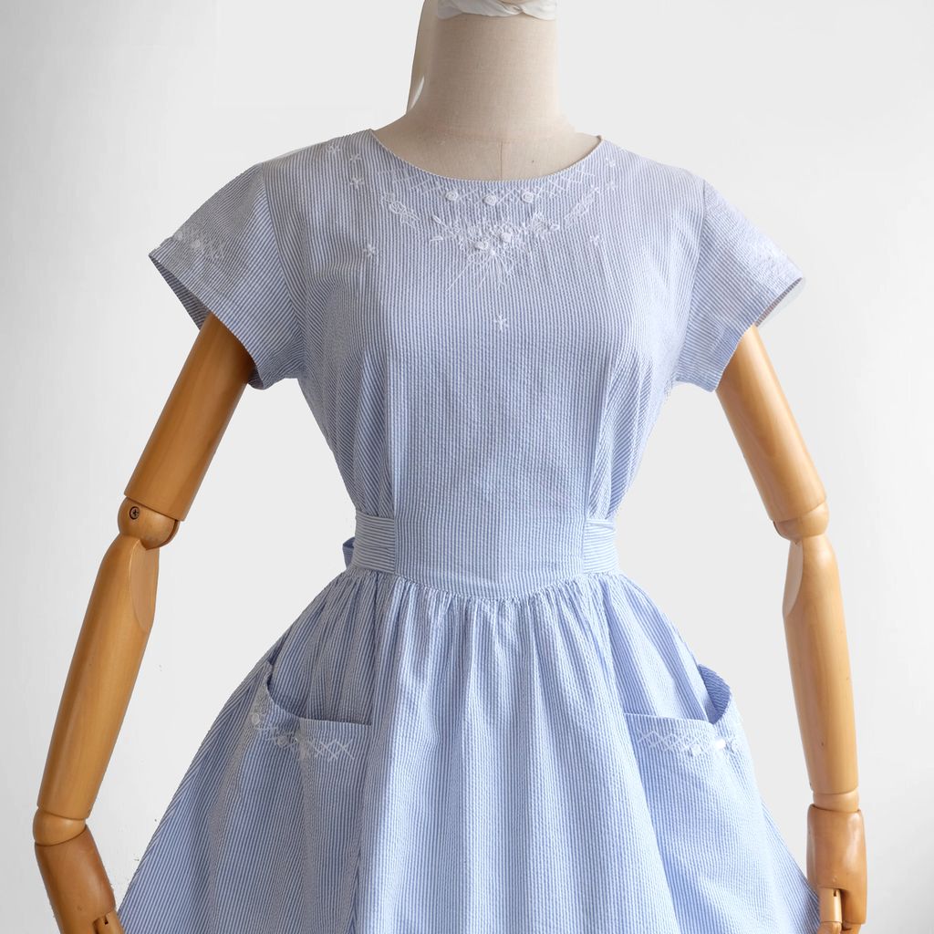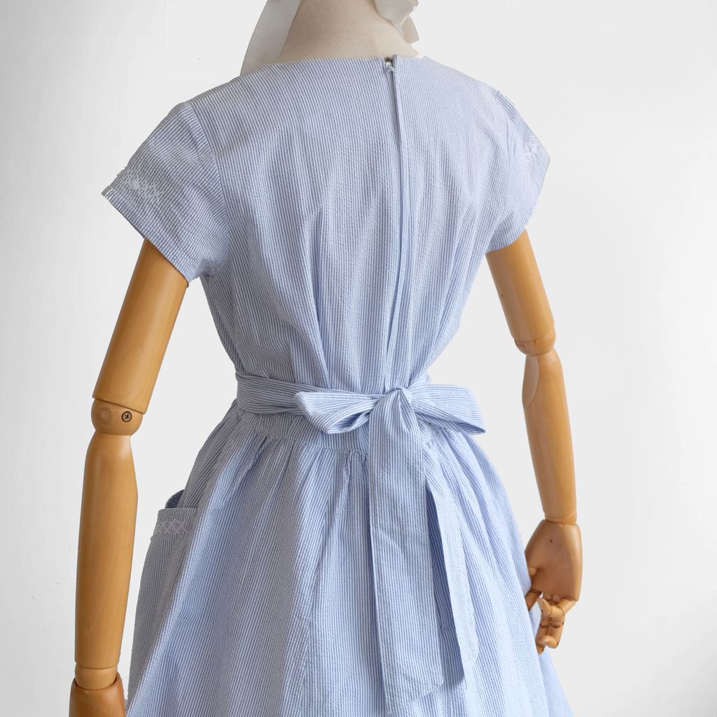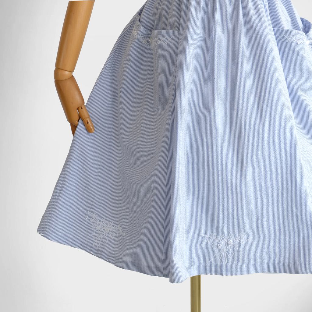 Circa 1980s. Beautiful light blue dress with stripes print.