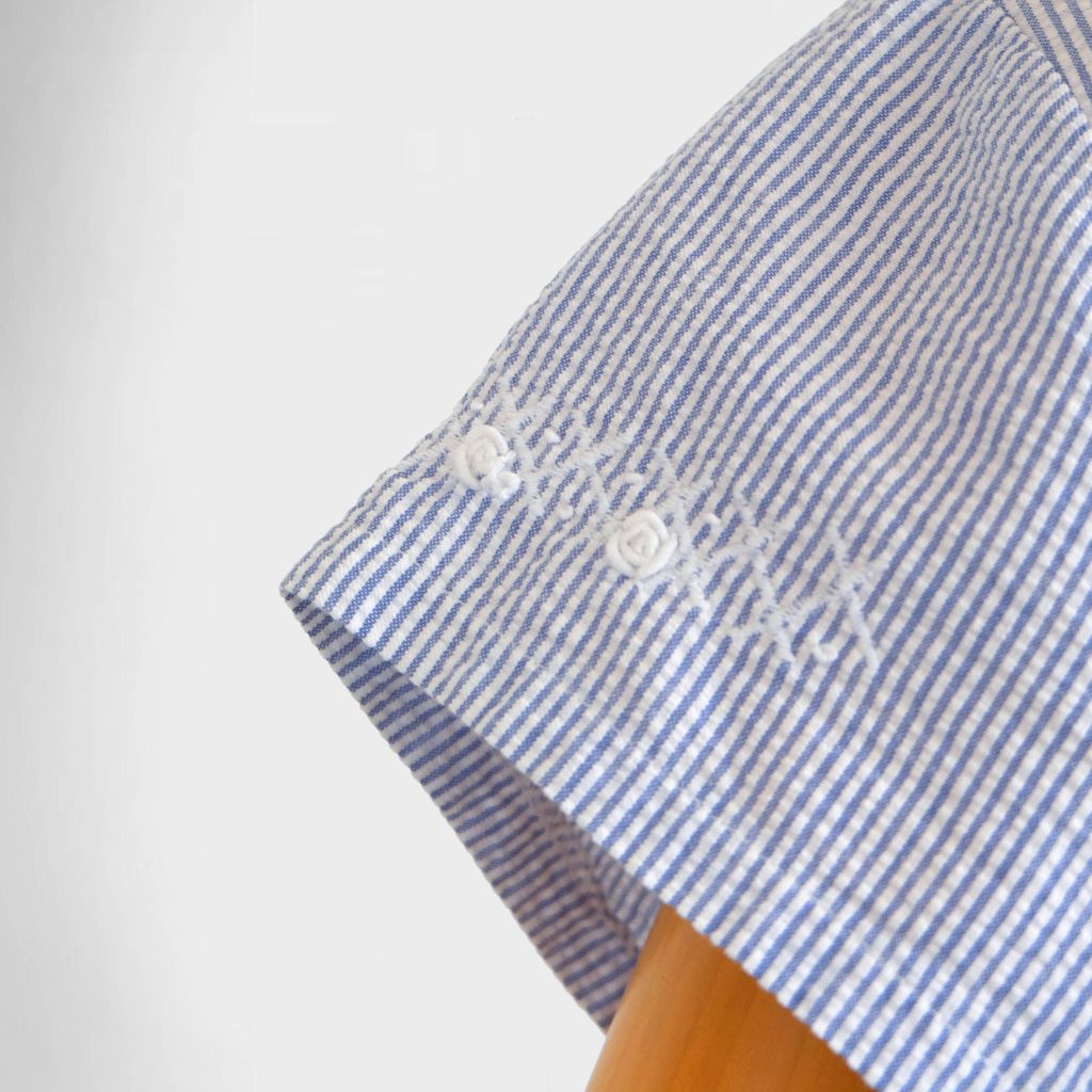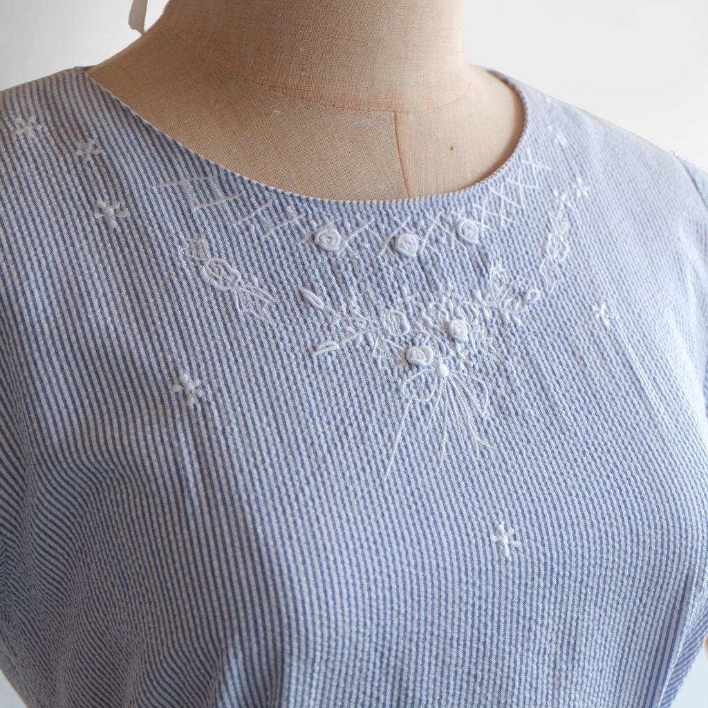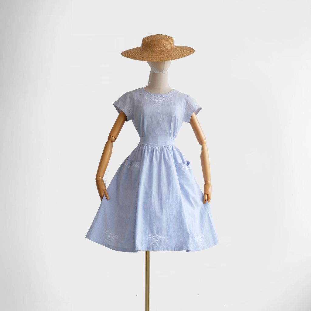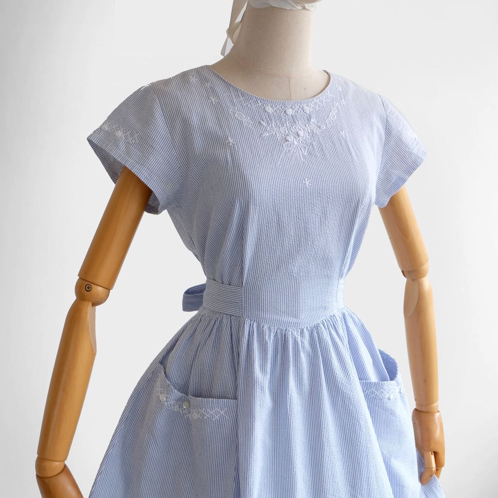 Circa 1980s. Beautiful light blue dress with stripes print.
