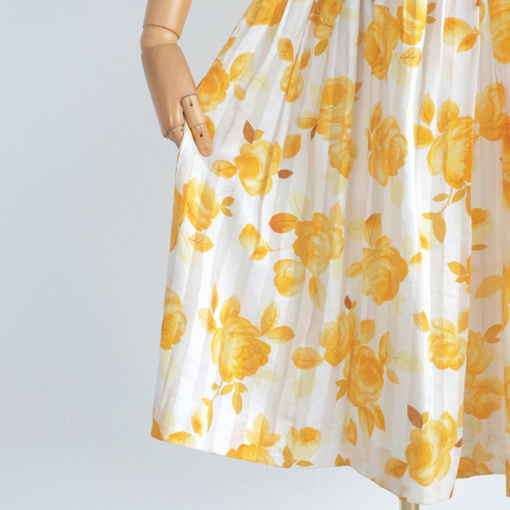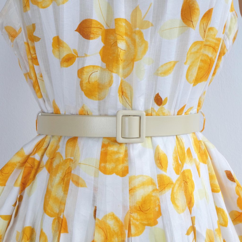 Strap dress type. Back zip closure, fitted waist, pleated waist, polyester cotton fabric. Belt not included.