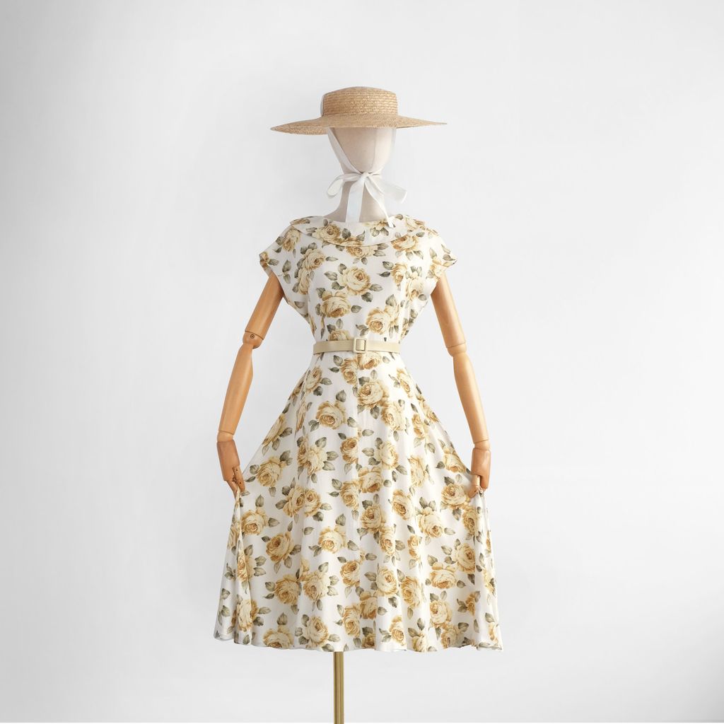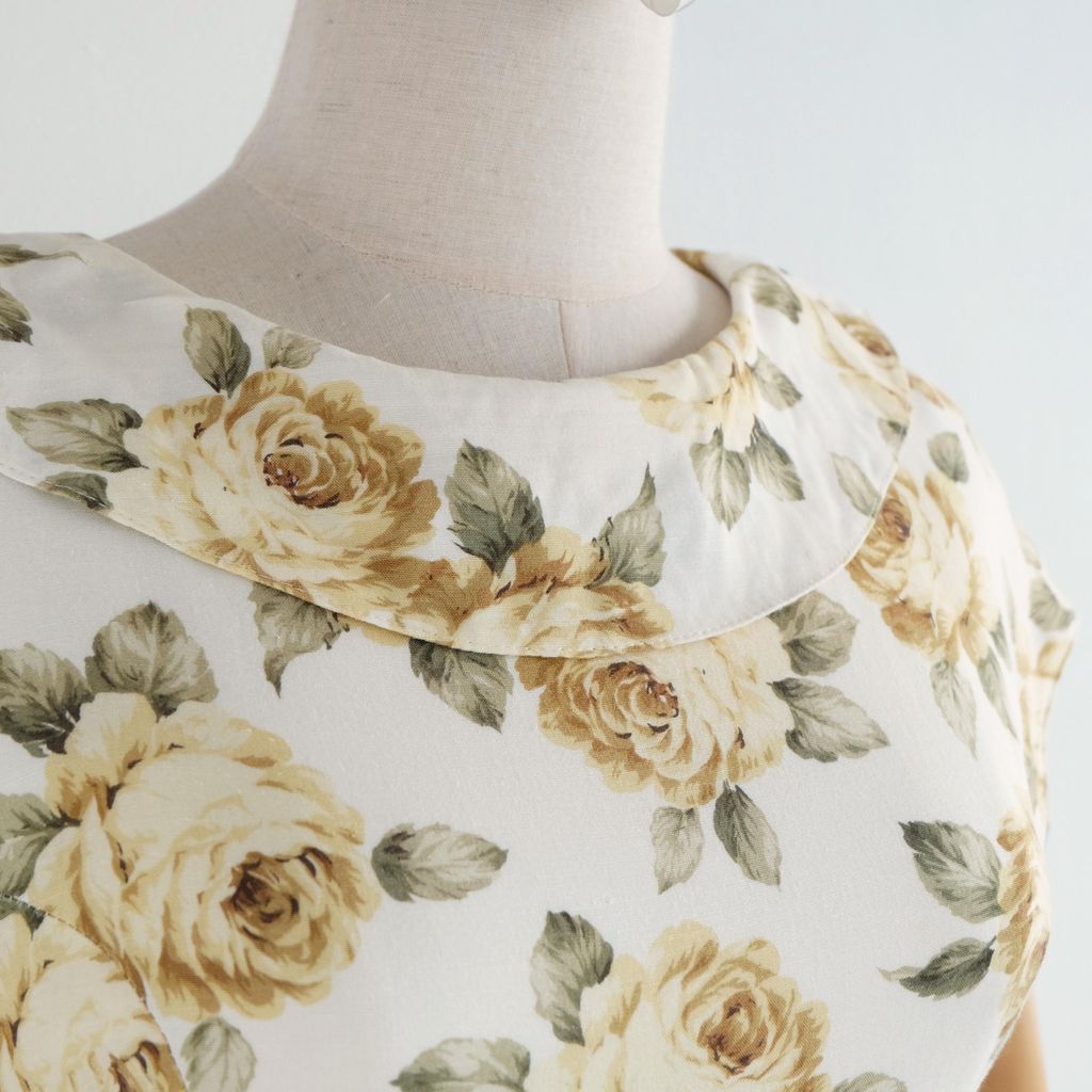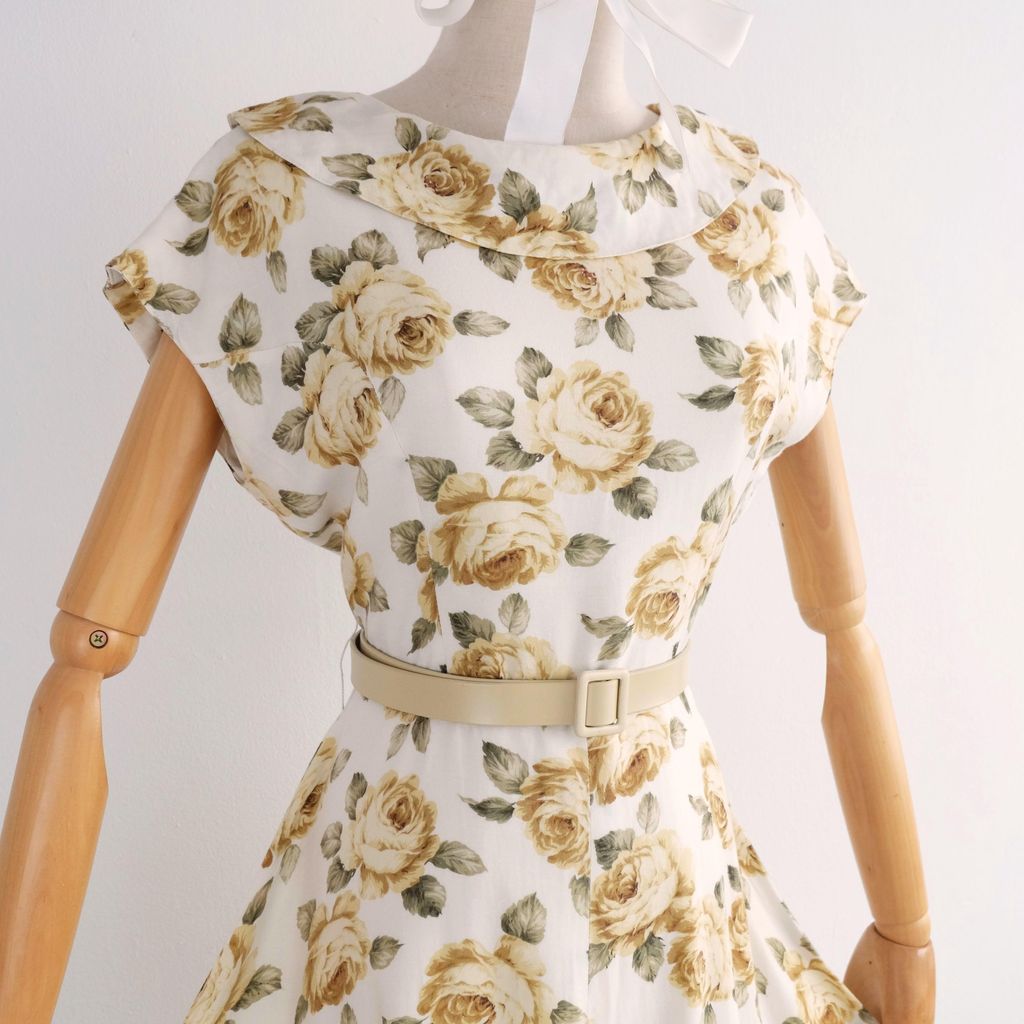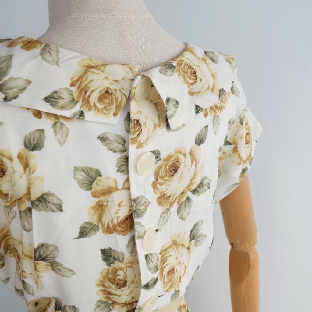 Bertha collar. back buttons closure, fitted waist, cotton fabric. Belt not included.