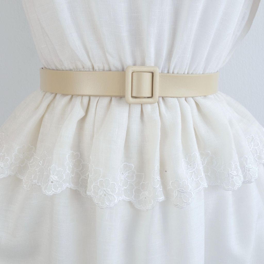Peplum dress type, waist and bottom hem with lace details, back zip closure, elastic waist, polyester linen fabric. Belt not included.