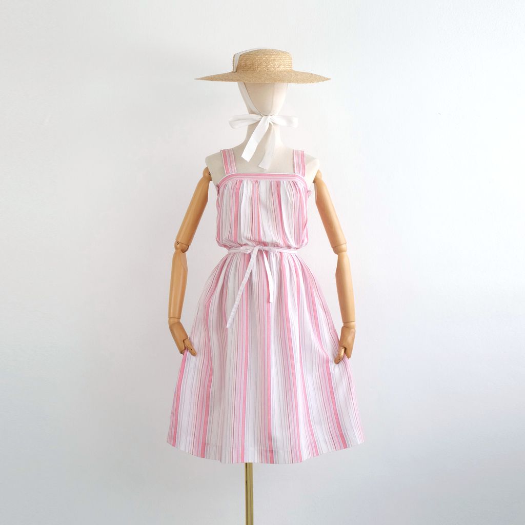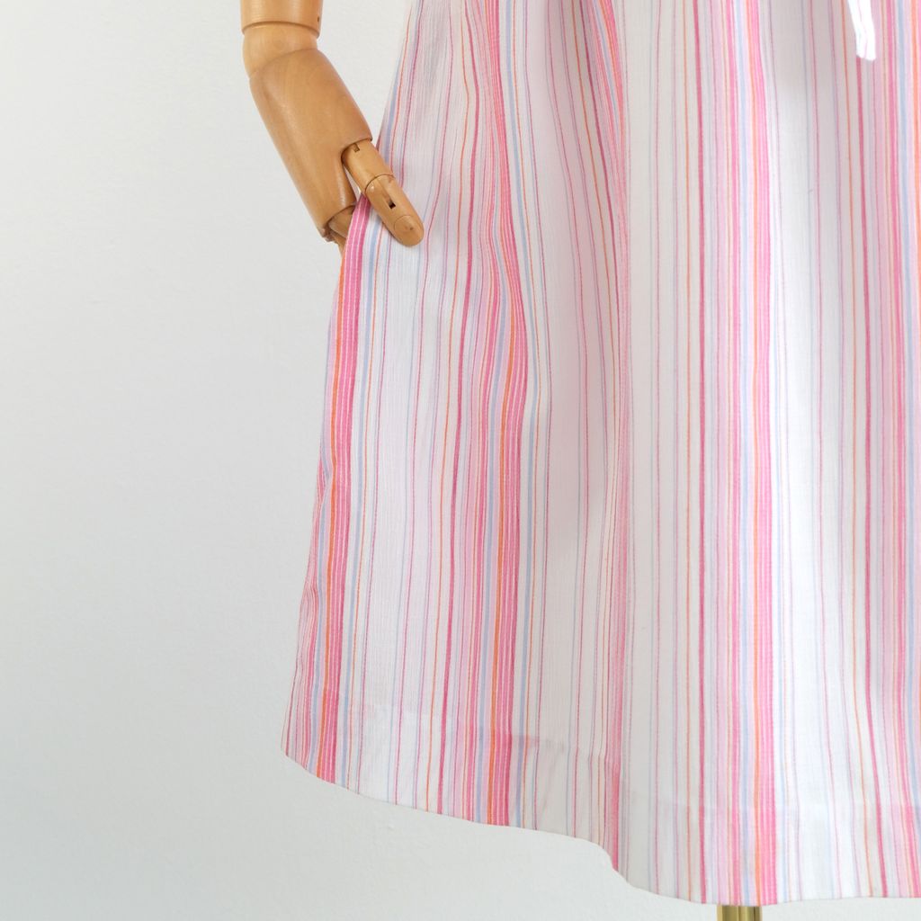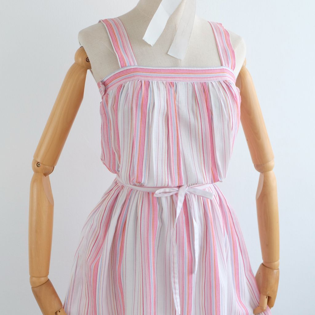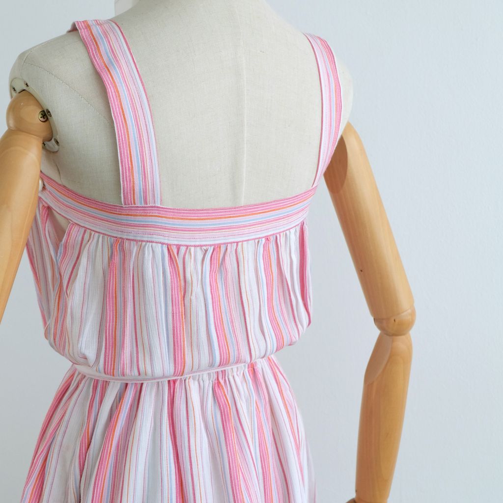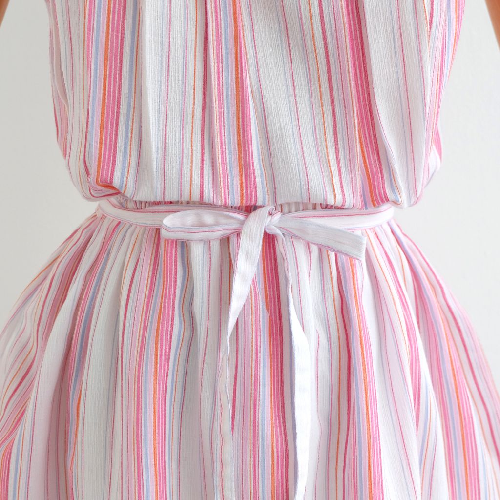 Circa 1980s. Pastel pink blue colour dress with stripes print.