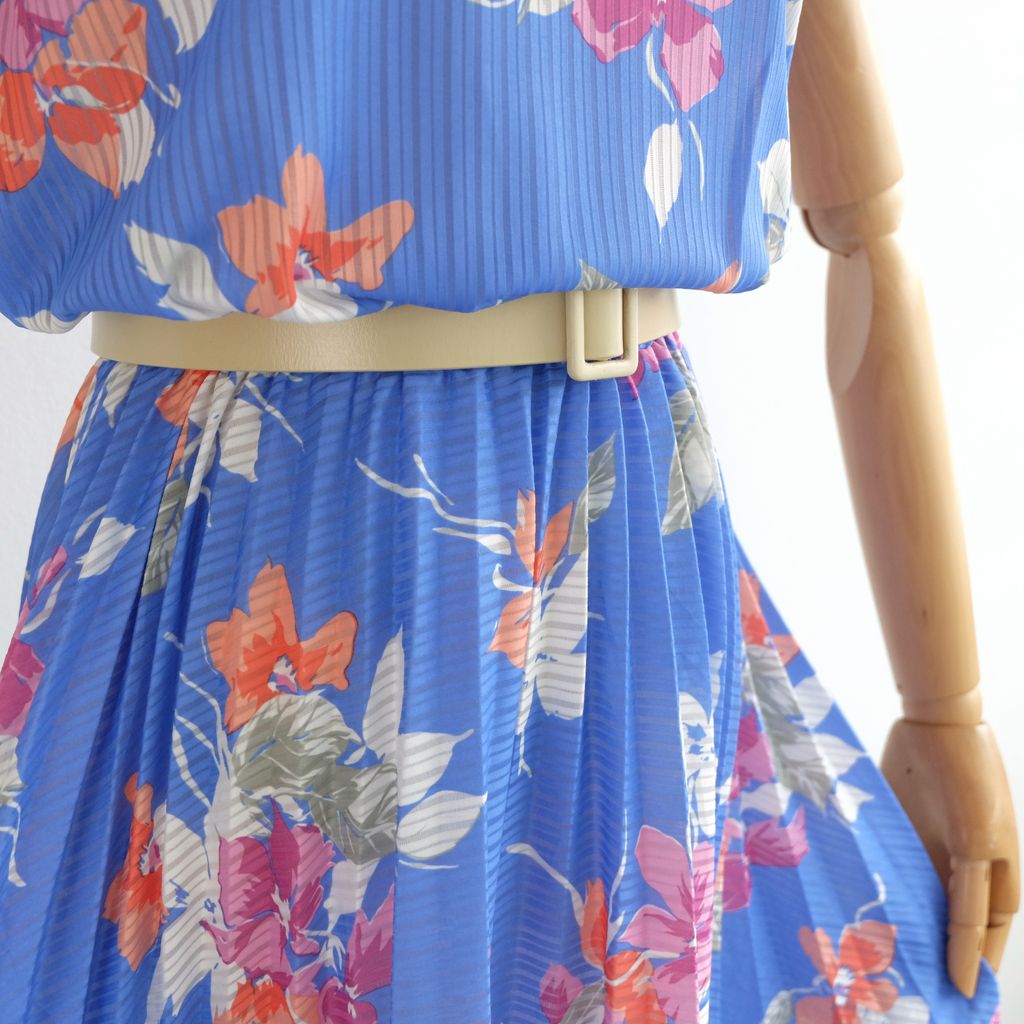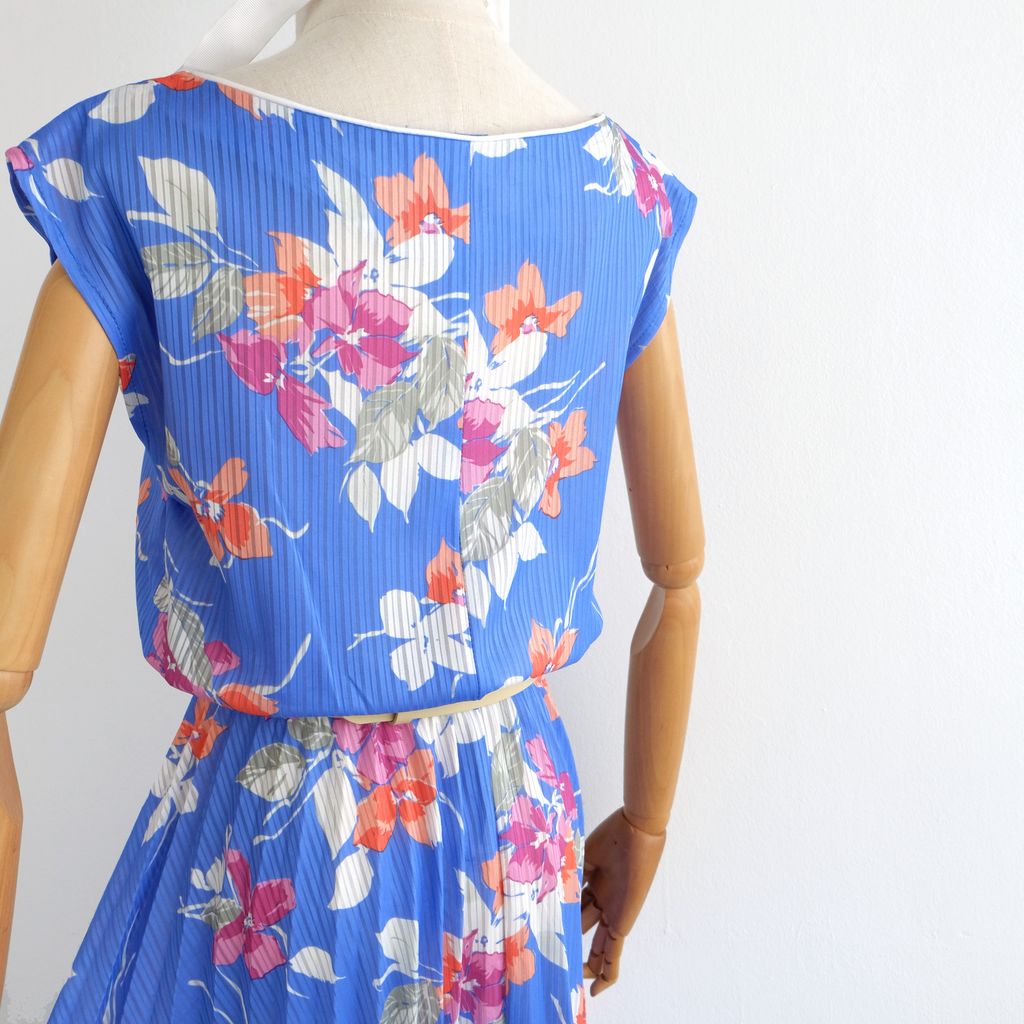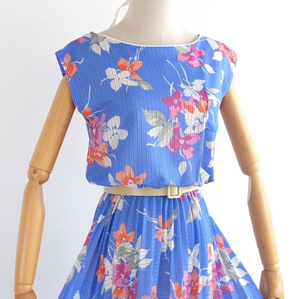 Circa 1980s. Bright blue dress with orange pink florals print.