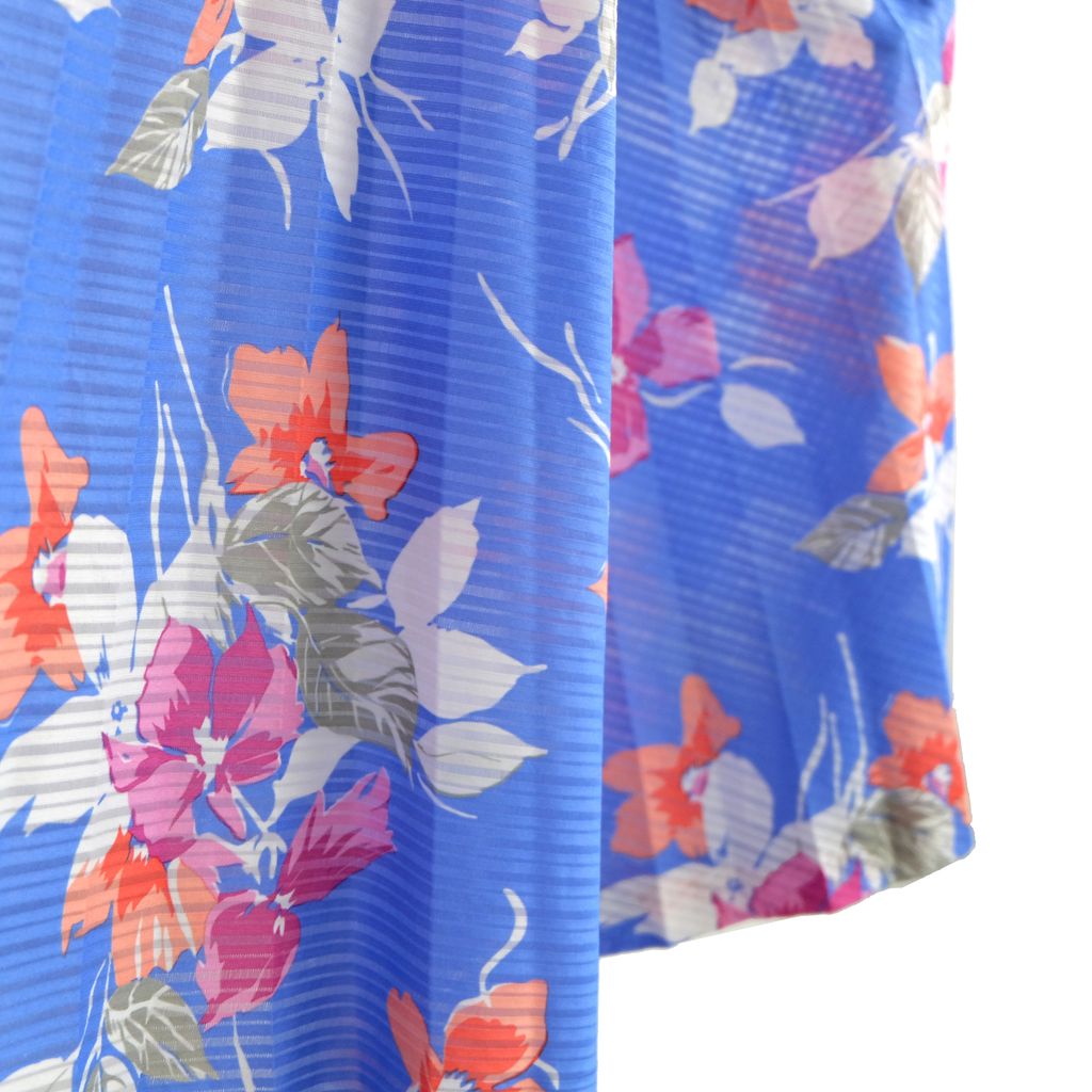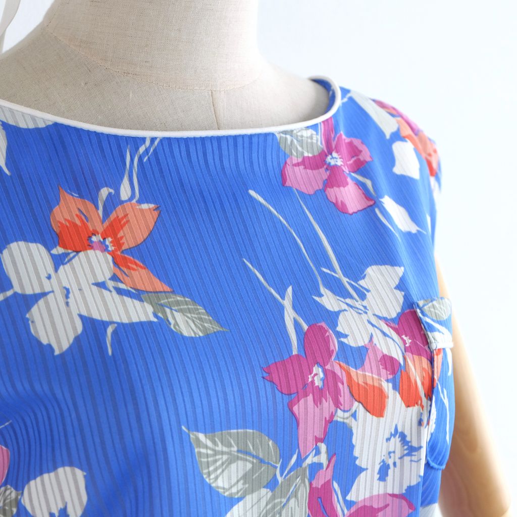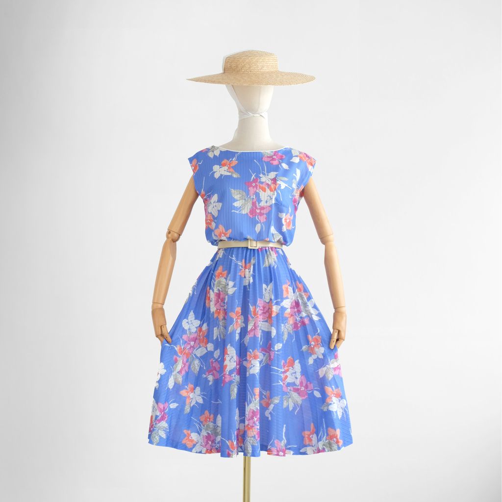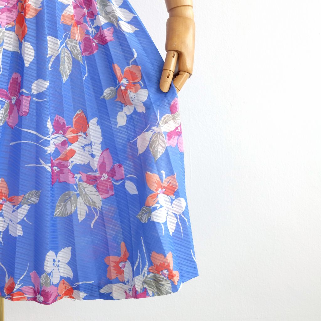 Circa 1980s. Bright blue dress with orange pink florals print.