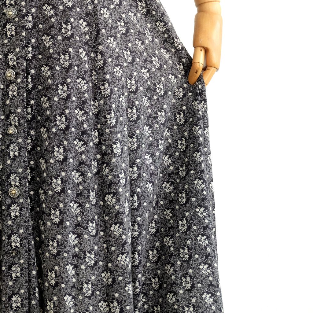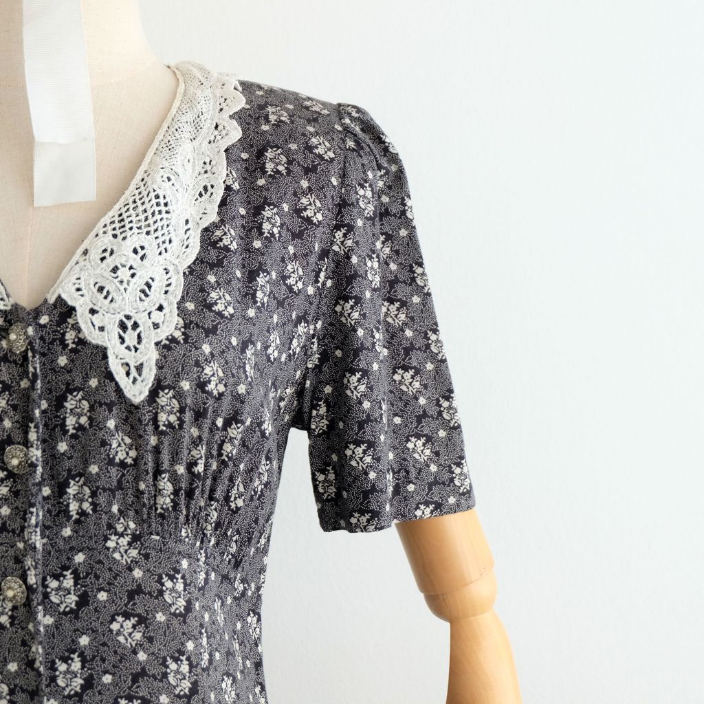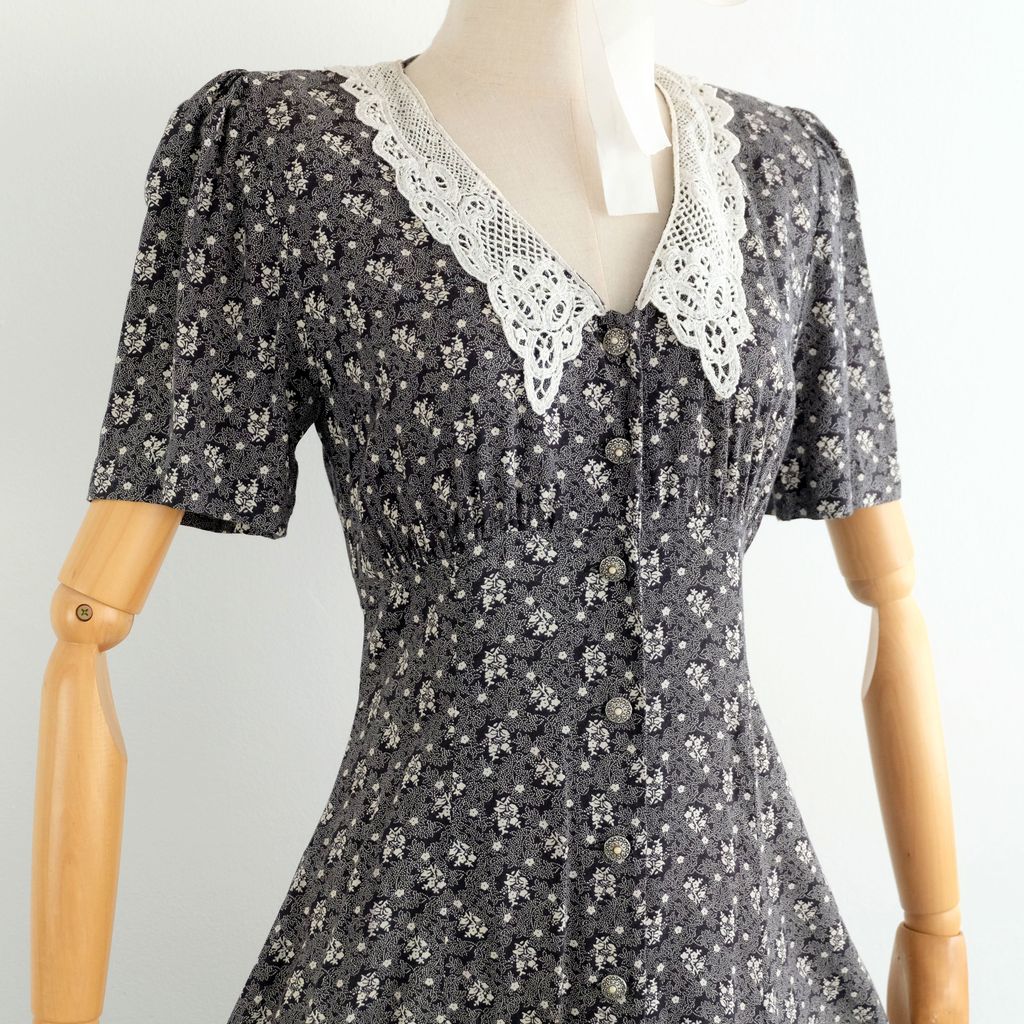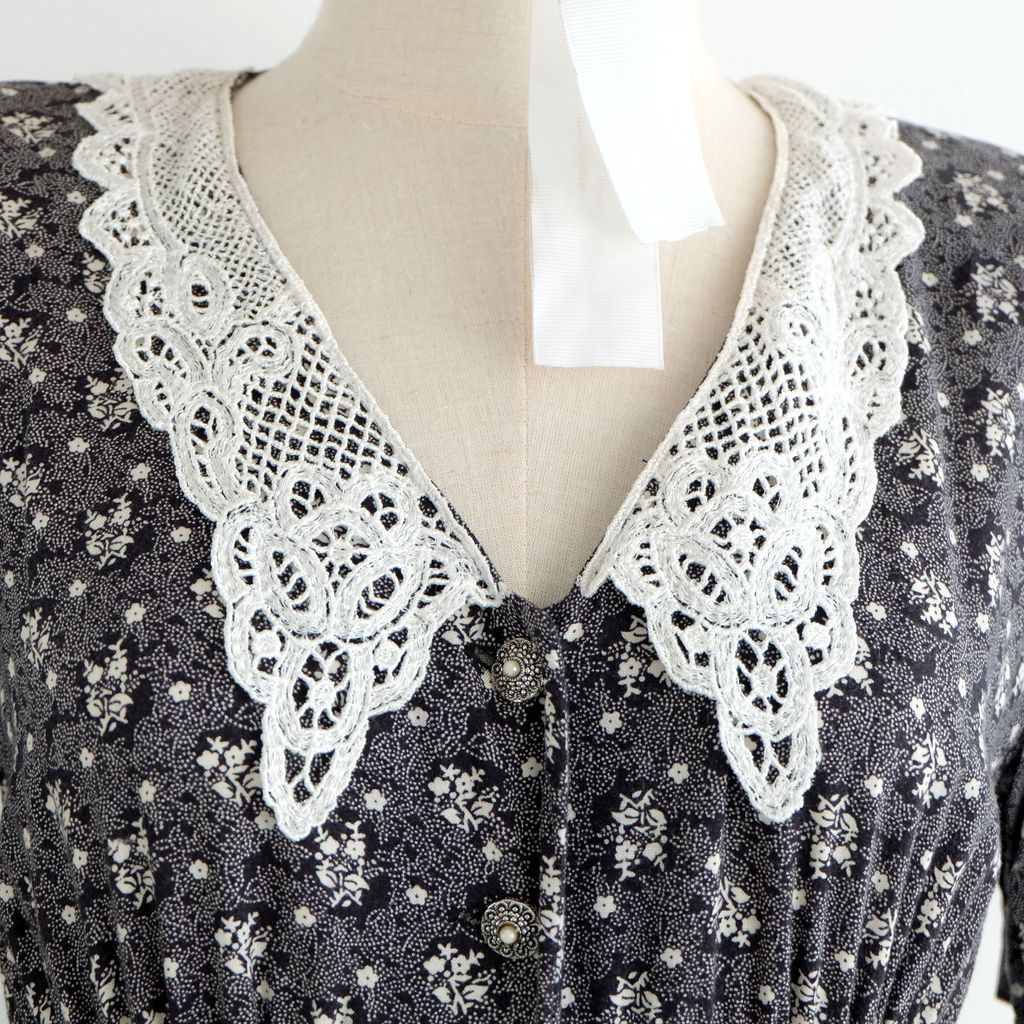 Circa 1980s. Black floral prints dress with embroidered lace collar.