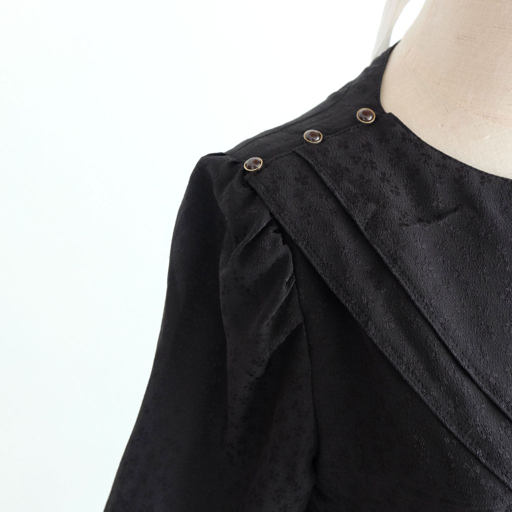 Pleated skirt, back zipped closure, elastic waist, detachable scarf collar. Polyester chiffon fabric.