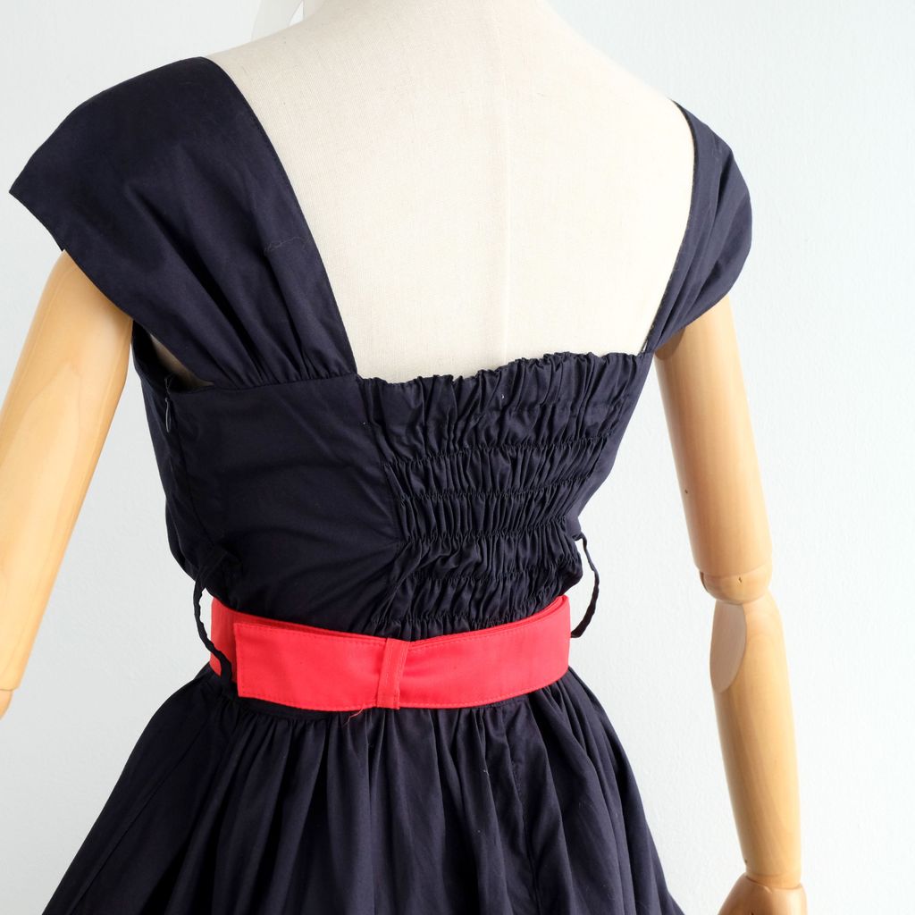 Elastic details at the back, side zip closure, matching red belt, elastic waist. Cotton fabric.
