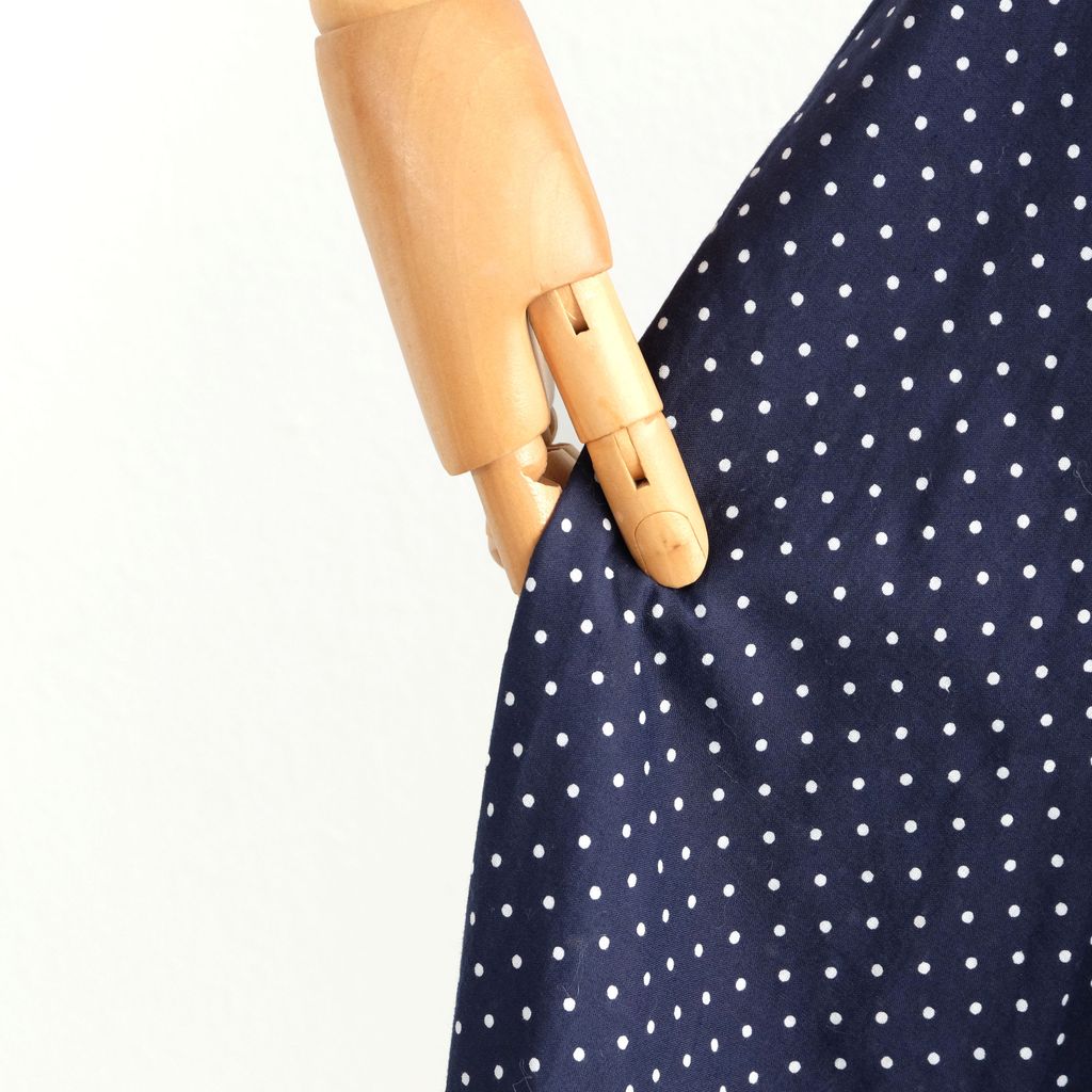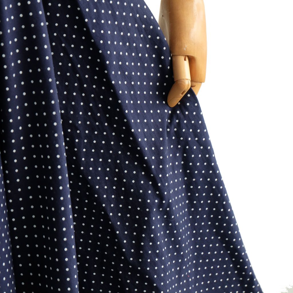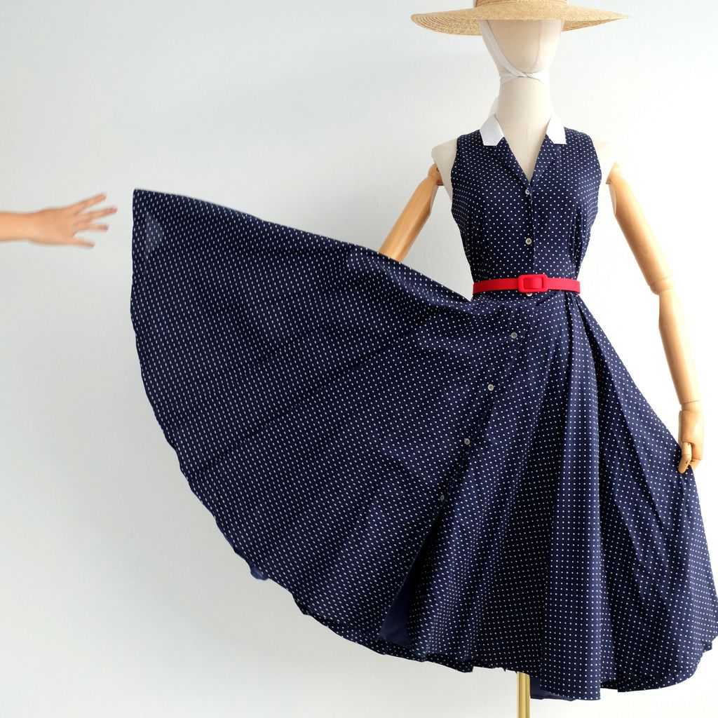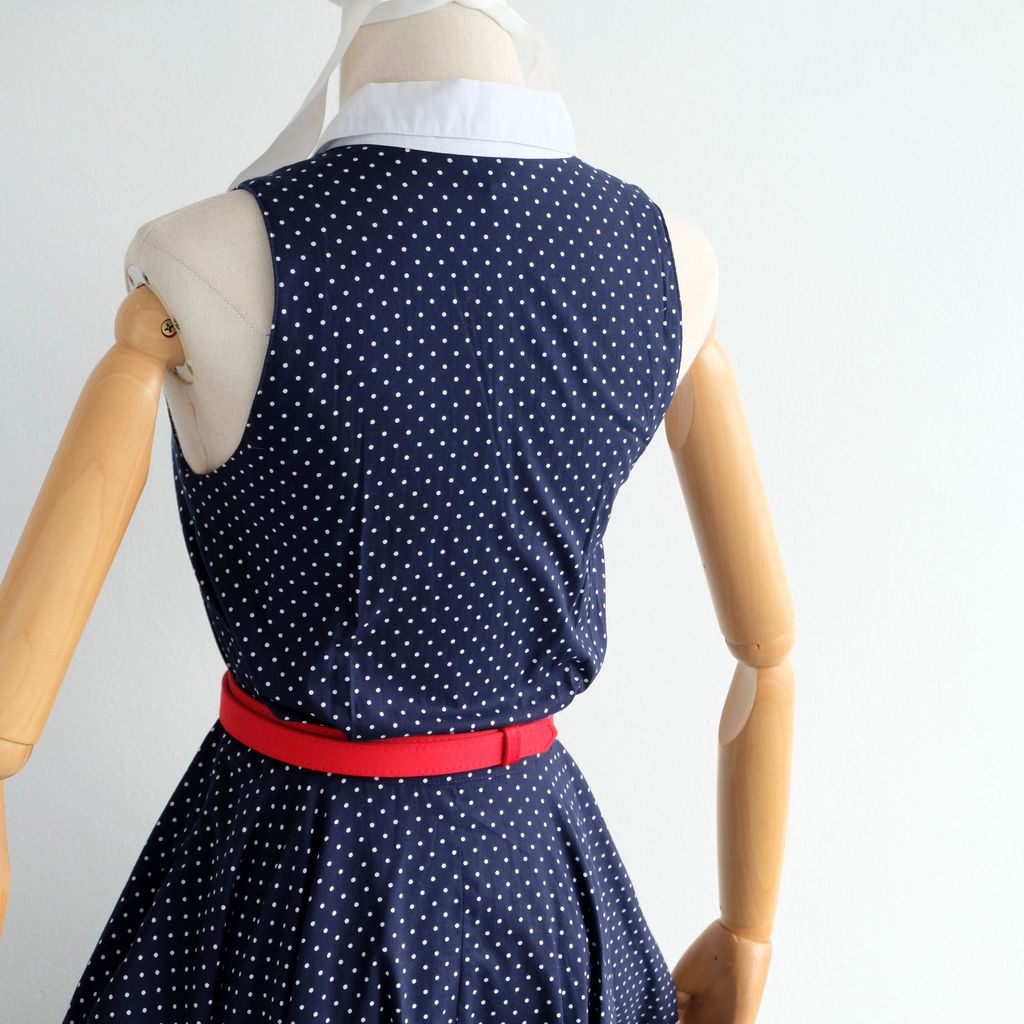 Circa 1960s. Classic navy blue dress with polka dots print.