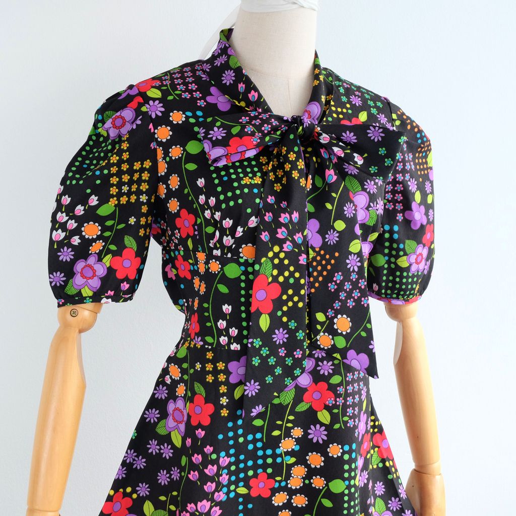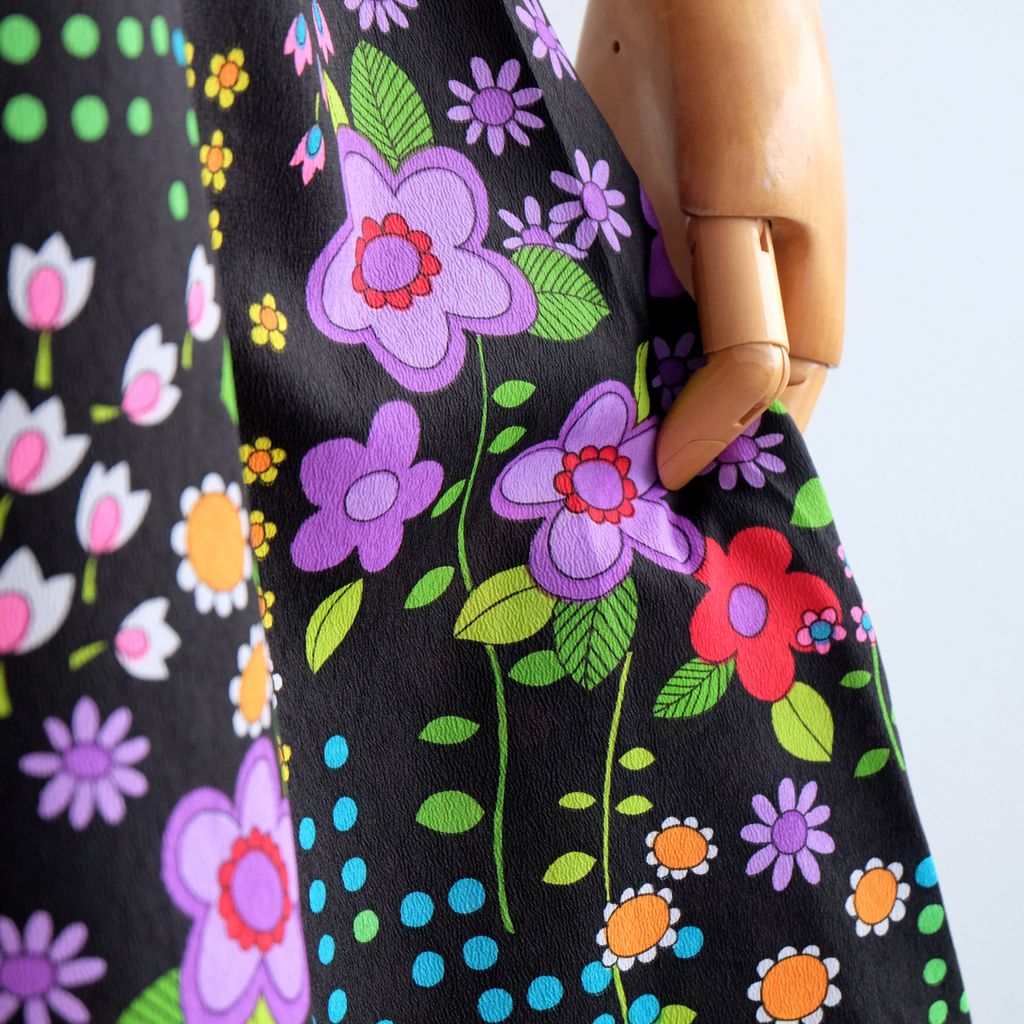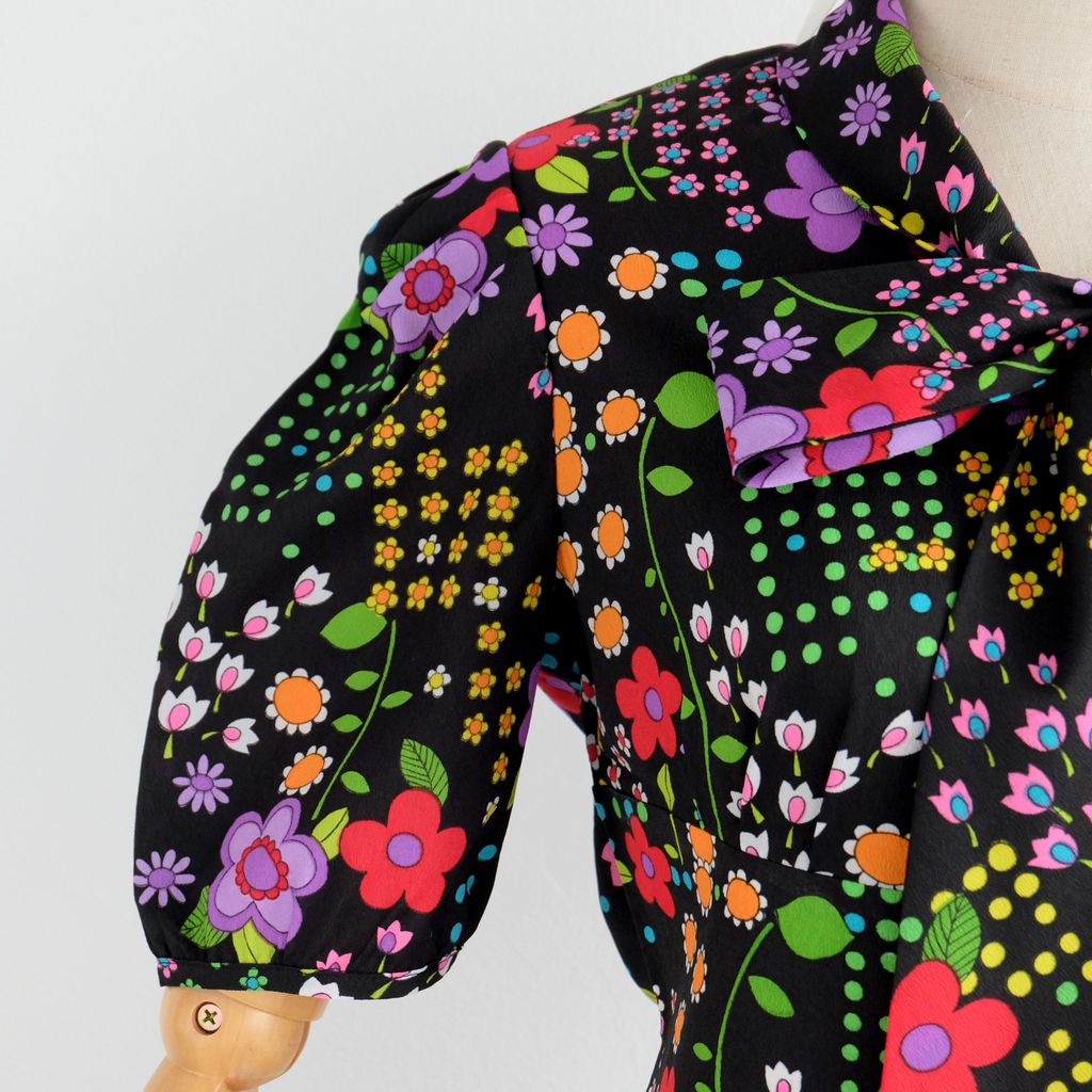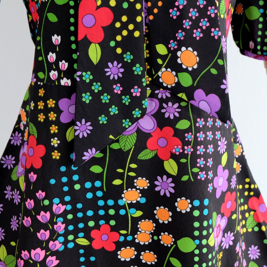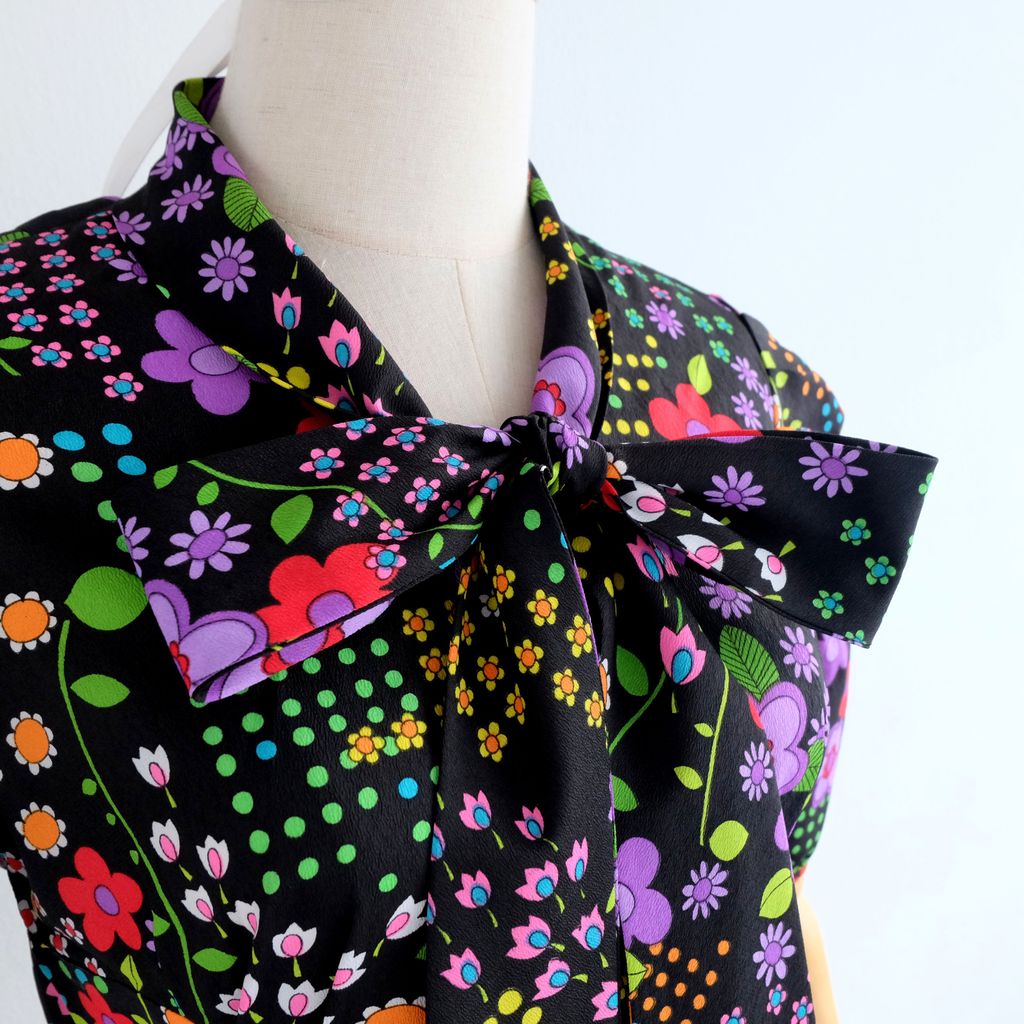 Bow neckline, back zip closure. Polyester crepe fabric.