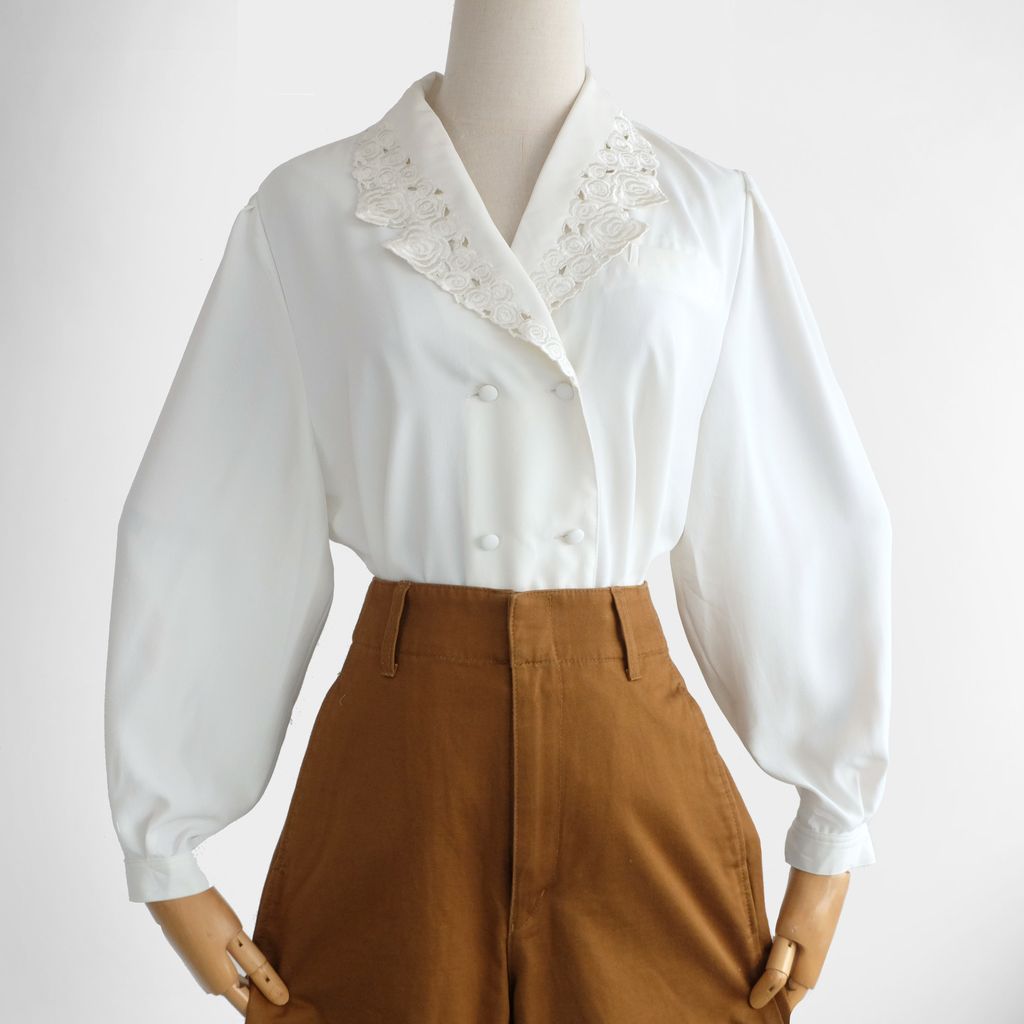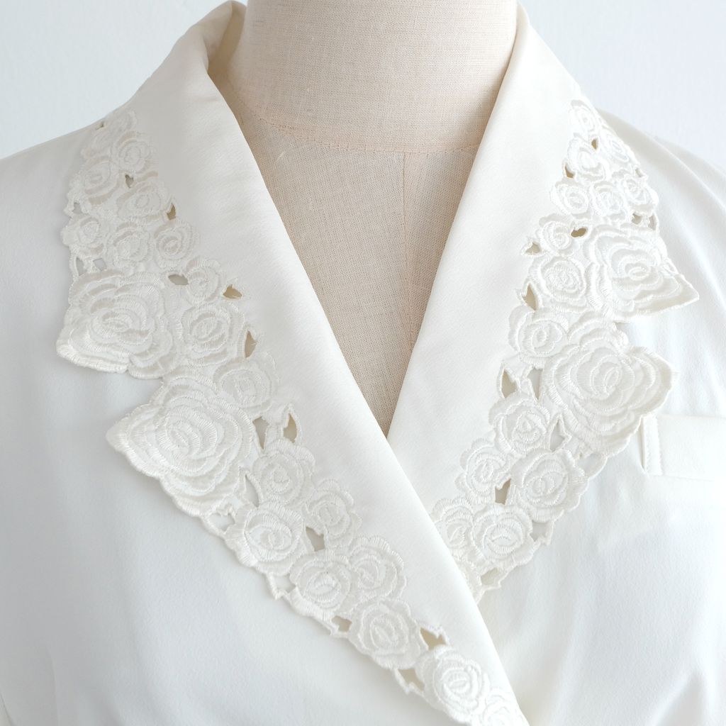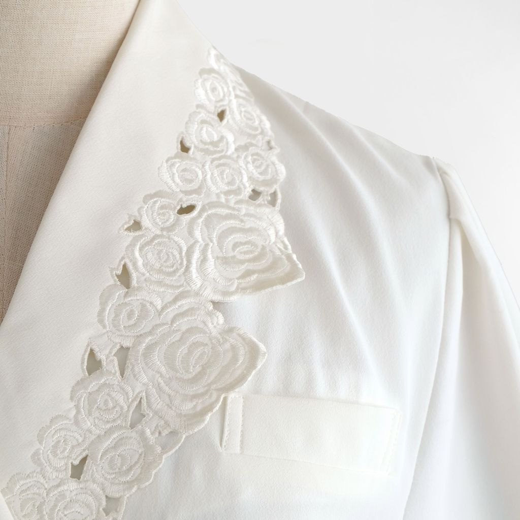 Roses cut out embroidery at the collar. Double breated buttons closure. Chiffon fabric. Bottom not included.