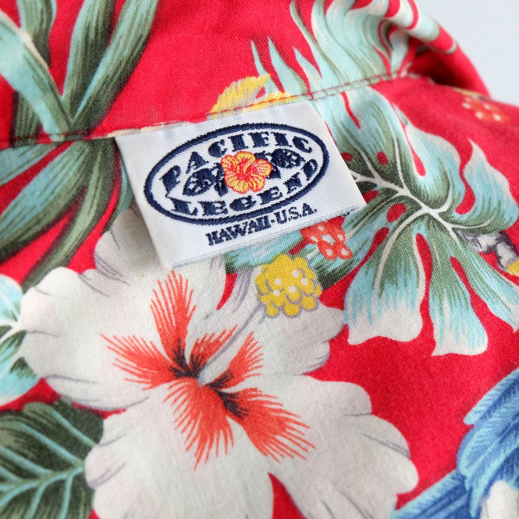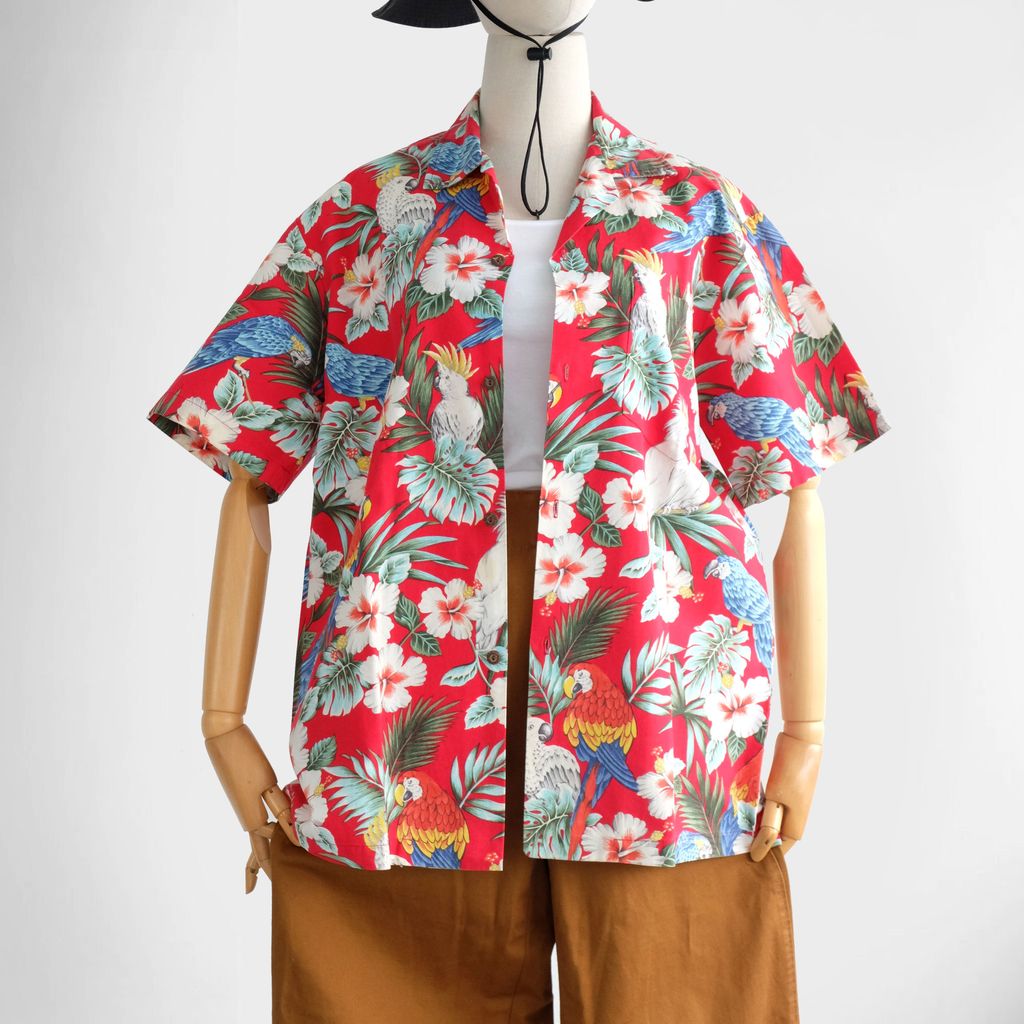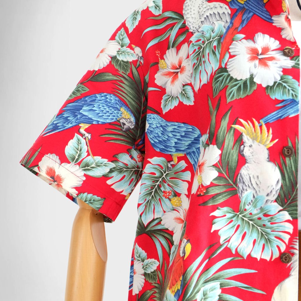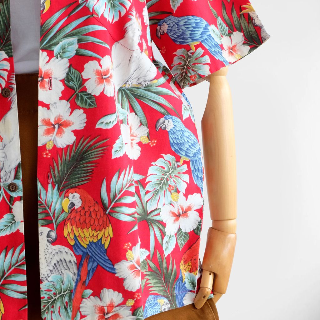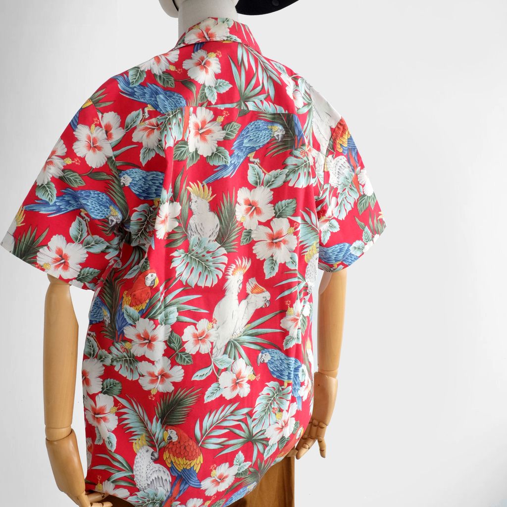 Circa 1980s. Rare Unisex Red Hawaiian shirt with tropical birds print.