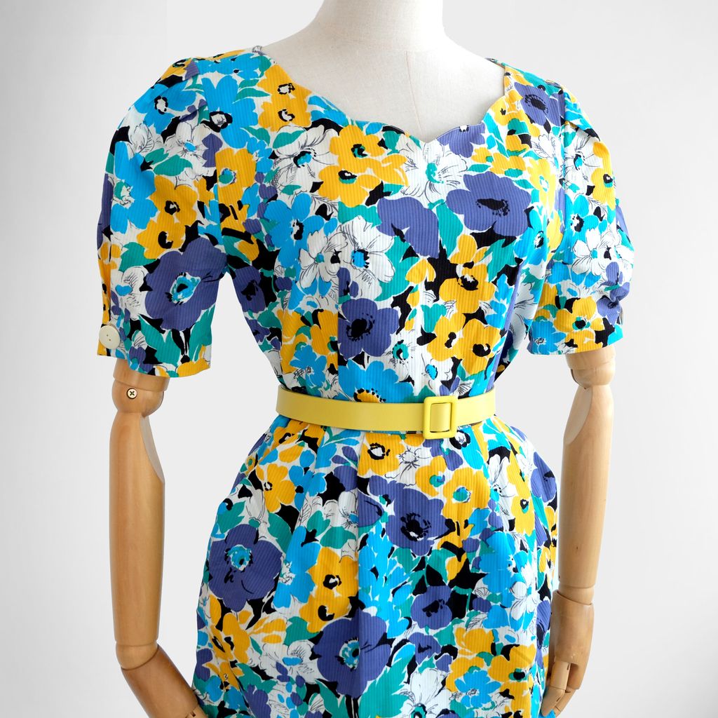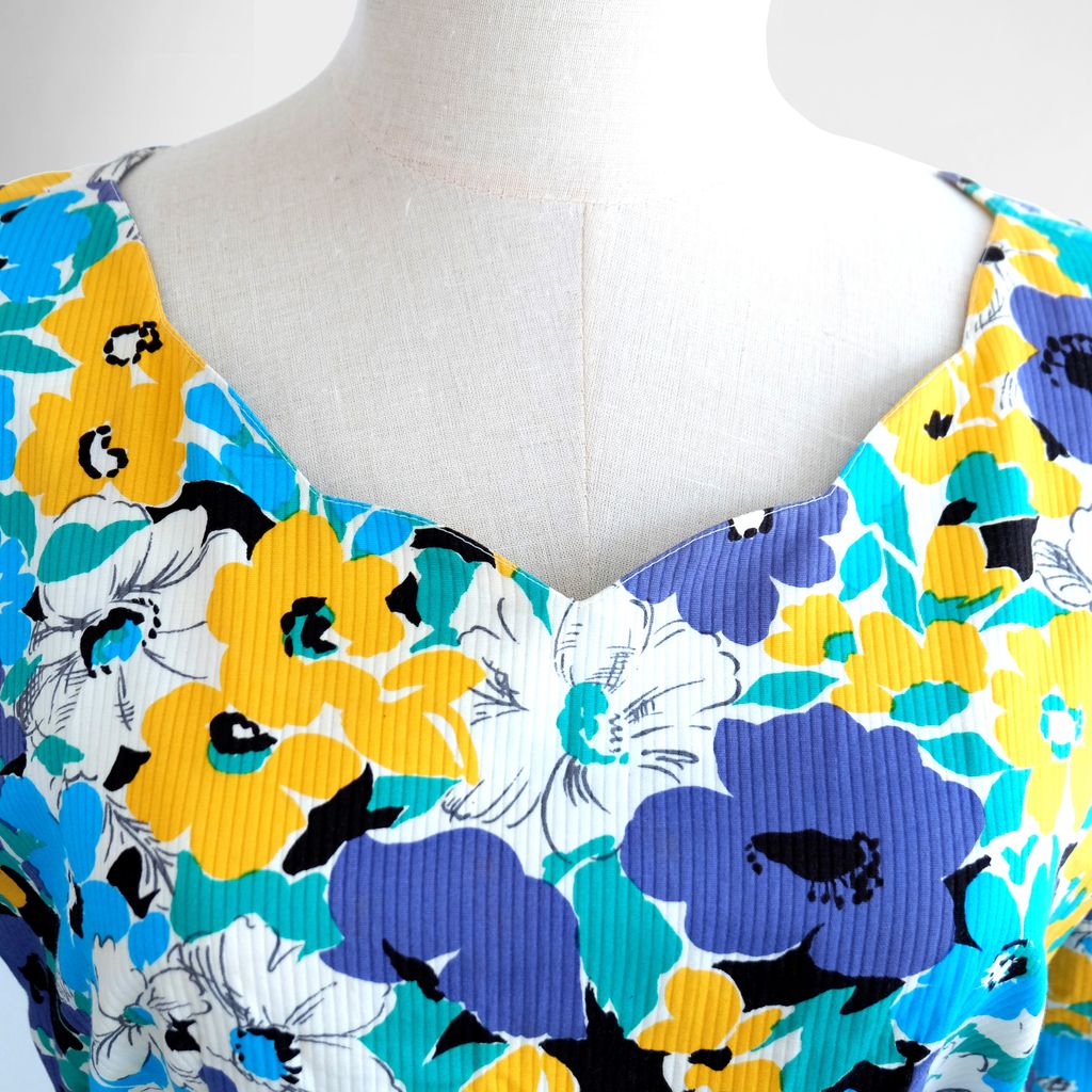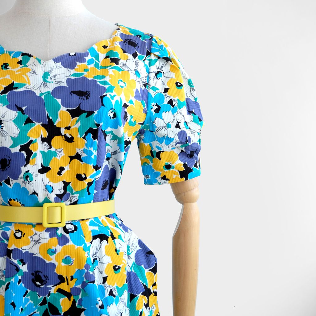 Scalloped V neckline design front & back. Back zip closure. Comes with pocket. Fitted waist. Cotton fabric. Belt not included.