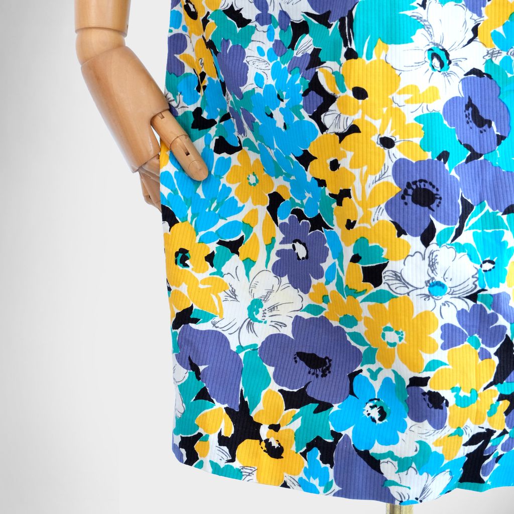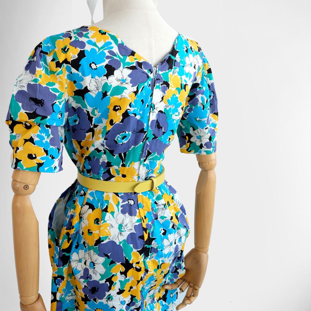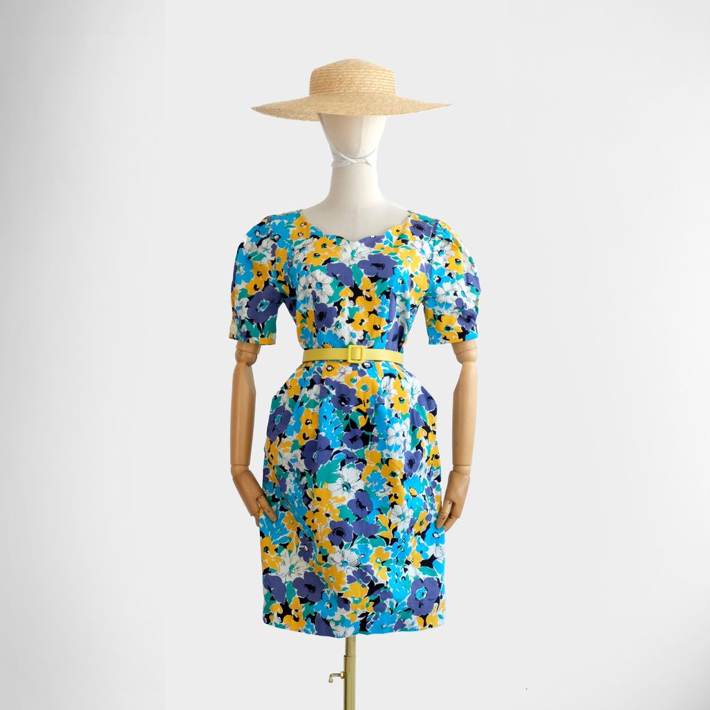 Scalloped V neckline design front & back. Back zip closure. Comes with pocket. Fitted waist. Cotton fabric. Belt not included.