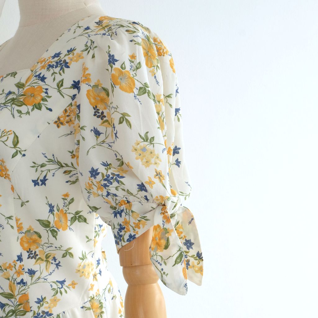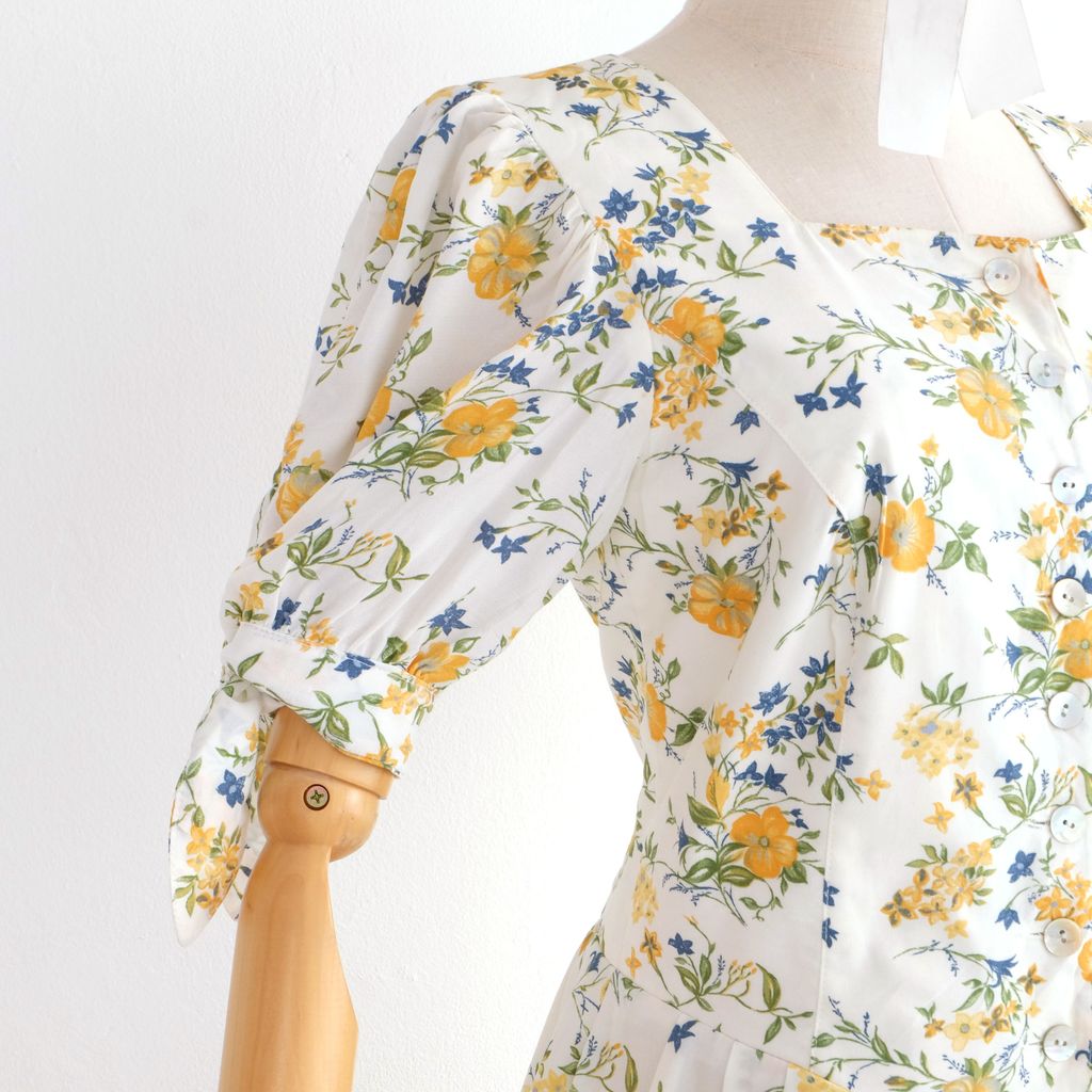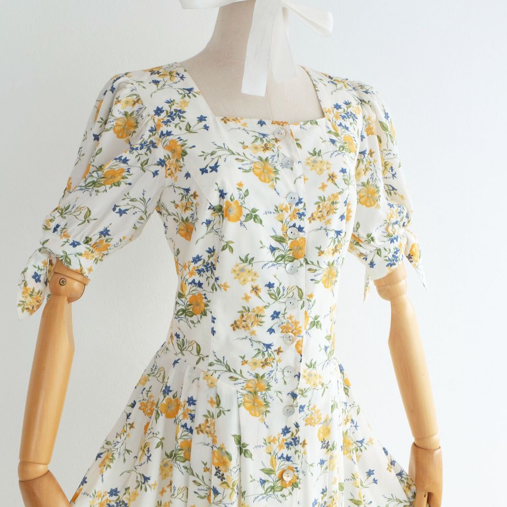 Circa 1980s. Off white dress with yellow blue florals print.