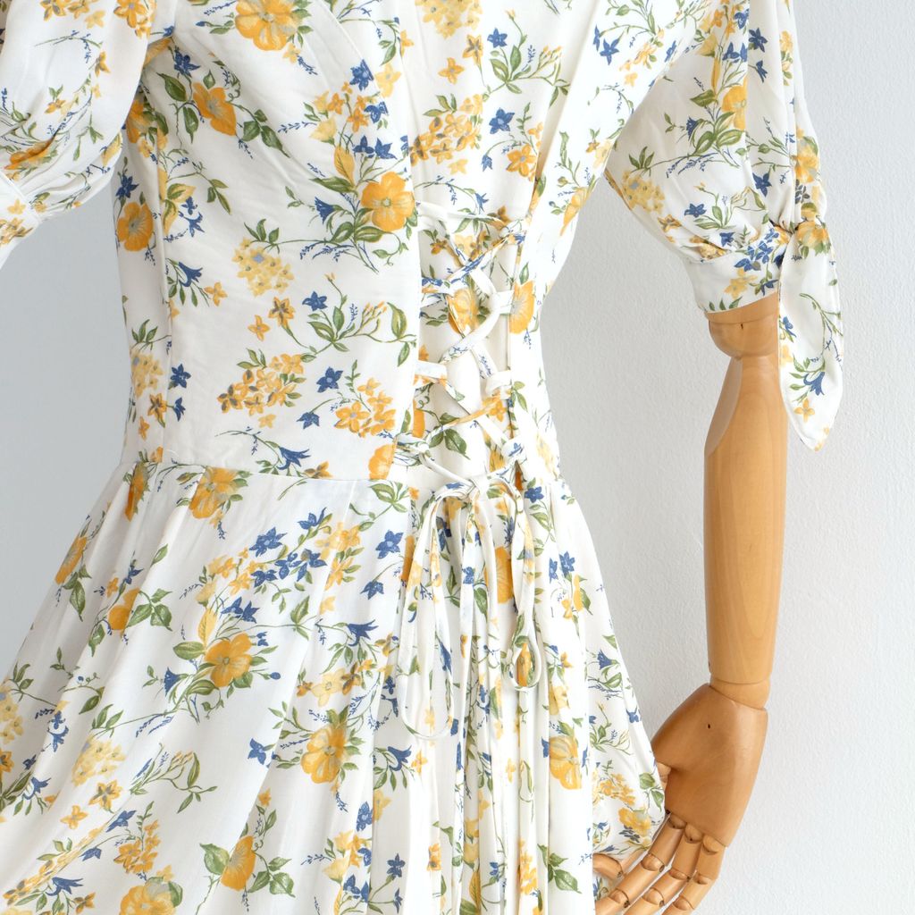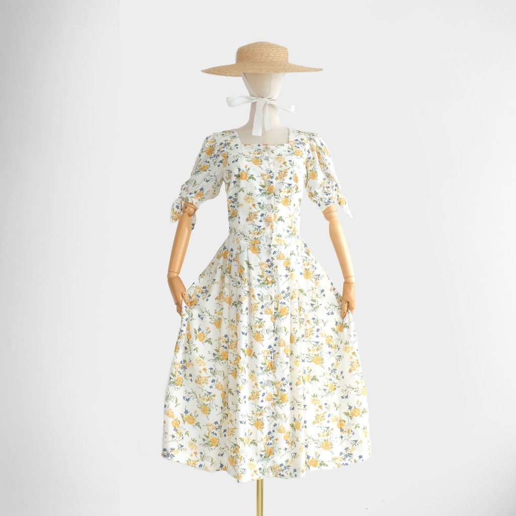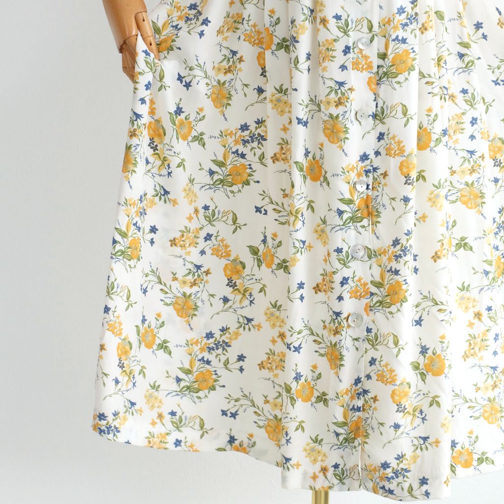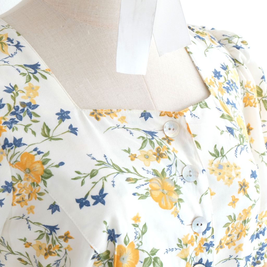 Circa 1980s. Off white dress with yellow blue florals print.